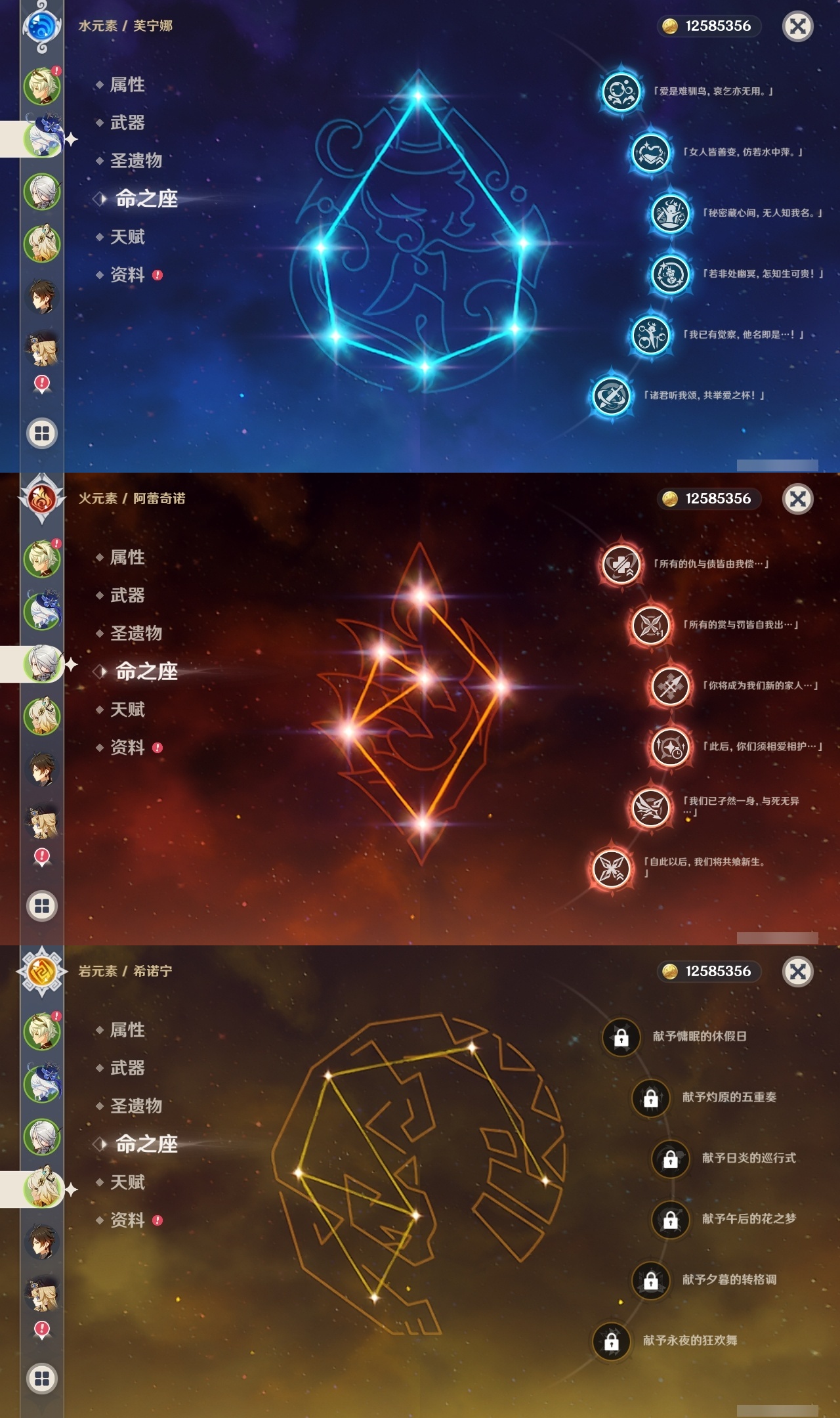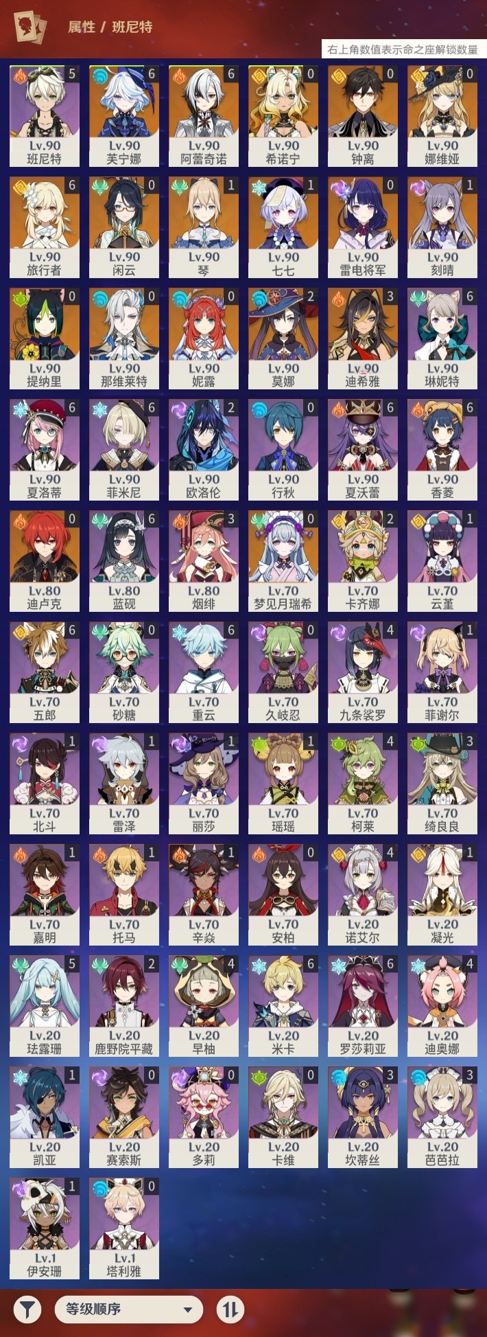 【原神】【lyys11188】冒险等级:60,五星数量:26,五星角色:芙宁娜 6命阿蕾奇诺 6命迪希雅 3命莫娜 2命刻晴 1命七七 1命琴 1命希诺宁钟离梦见月瑞希那维莱特娜维娅提纳里闲云妮露迪卢克雷电将军__五星武器:最初的大魔术静水流涌之辉赤月之形阿莫斯之弓和璞鸢狼的末路四风原典天空之傲天空之卷__四星角色:香菱 6命米卡 6命蓝砚 6命五郎 6命重云 6命罗莎莉亚 6命菲米尼 6命琳妮特 6命夏洛蒂 6命夏沃蕾 6命班尼特 5命珐露珊 5命九条裟罗 4命迪奥娜 4命柯莱 4命早柚 4命诺艾尔 4命绮良良 3命坎蒂丝 3命芭芭拉 3命烟绯 3命卡齐娜 2命鹿野院平藏 2命欧洛伦 2命凝光 1命瑶瑶 1命云堇 1命托马 1命辛焱 1命雷泽 1命菲谢尔 1命北斗 1命嘉明 1命伊安珊 1命行秋久岐忍砂糖多莉卡维塔利雅赛索斯