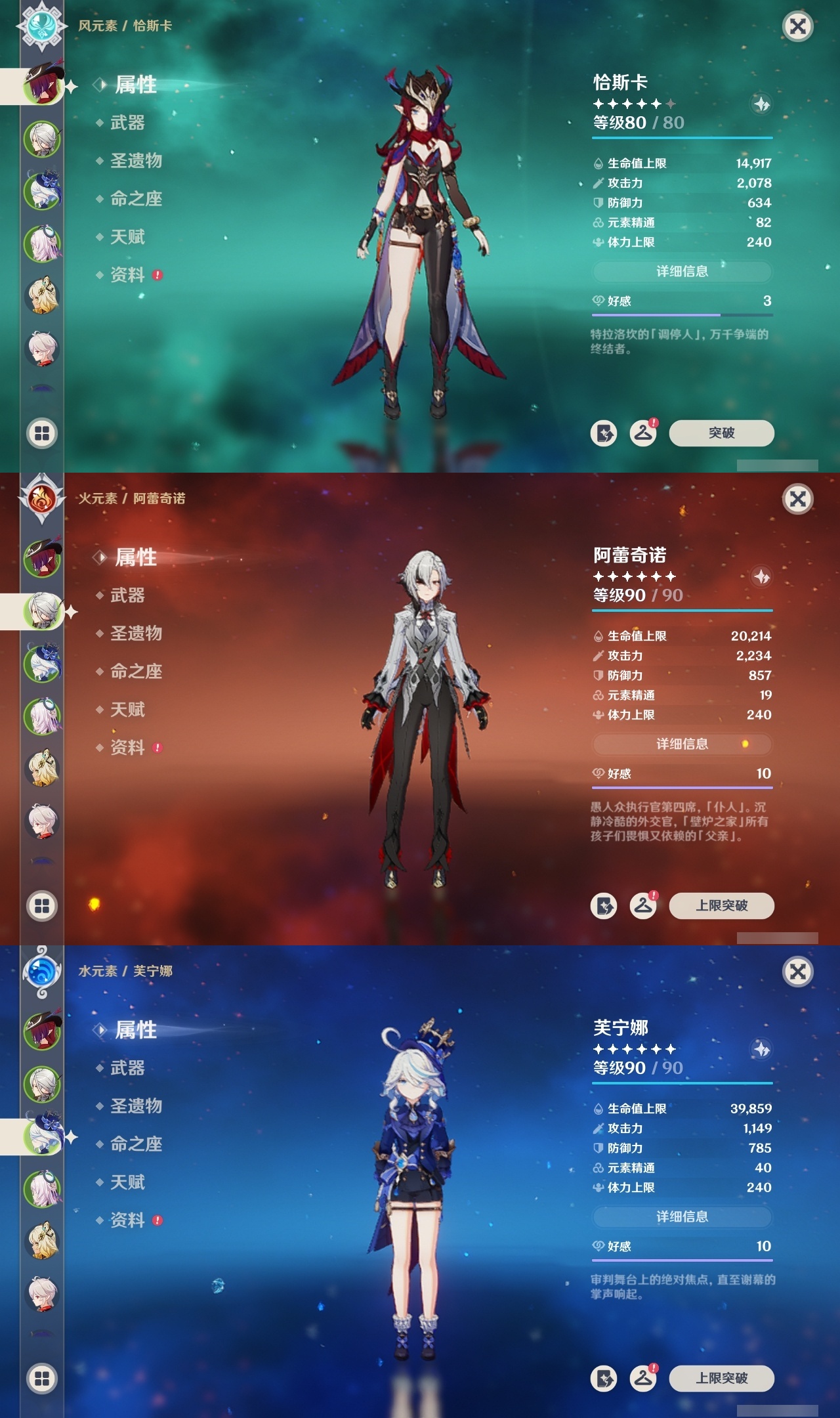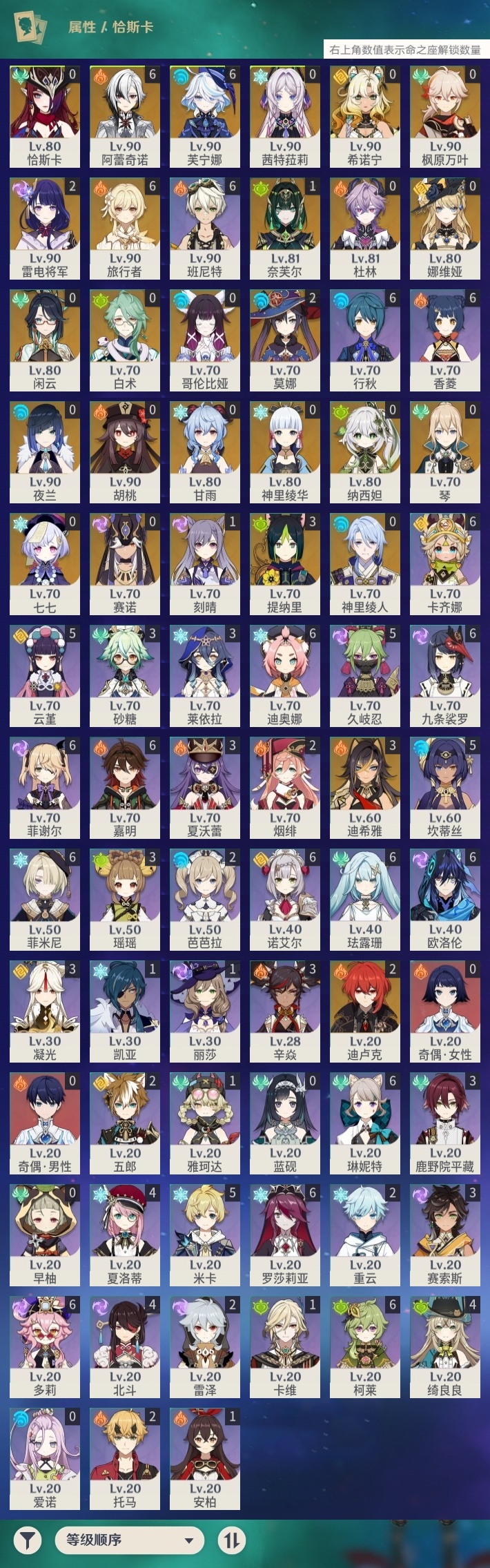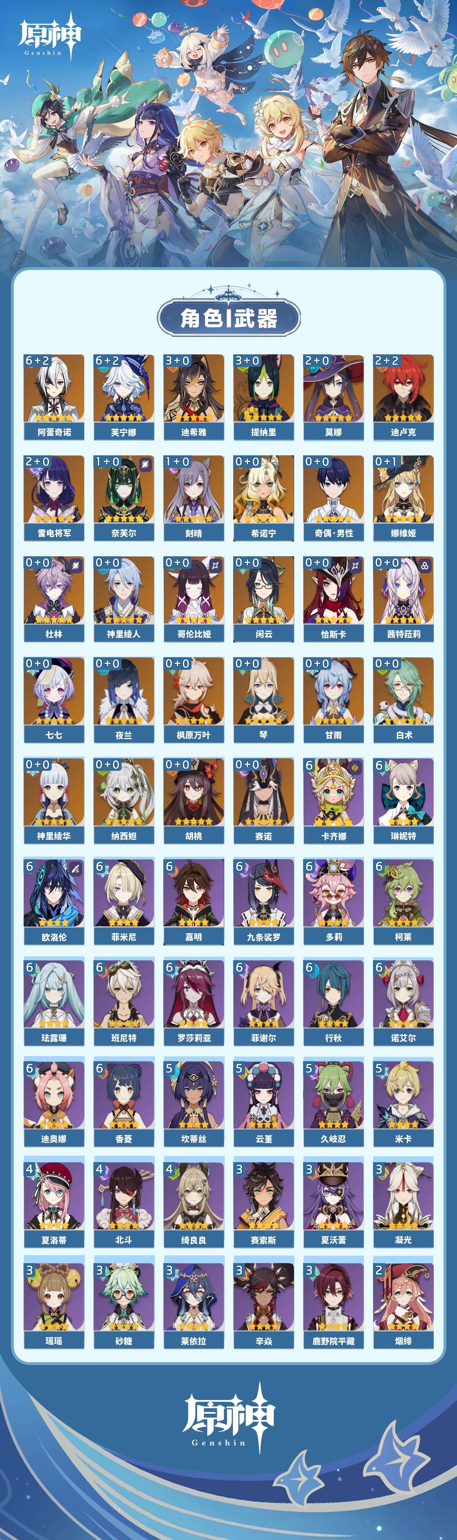【原神】【lyys11226】冒险等级:59,五星数量:39,五星角色:芙宁娜 6命阿蕾奇诺 6命迪希雅 3命提纳里 3命迪卢克 2命雷电将军 2命莫娜 2命奈芙尔 1命刻晴 1命七七琴希诺宁白术神里绫华恰斯卡茜特菈莉神里绫人夜兰娜维娅闲云赛诺纳西妲杜林哥伦比娅枫原万叶甘雨胡桃__五星武器:静水流涌之辉 2精赤月之形 2精狼的末路 2精最初的大魔术裁断支离轮光风鹰剑和璞鸢天空之脊天空之翼__四星角色:卡齐娜 6命班尼特 6命行秋 6命九条裟罗 6命香菱 6命珐露珊 6命迪奥娜 6命多莉 6命柯莱 6命欧洛伦 6命诺艾尔 6命罗莎莉亚 6命菲谢尔 6命菲米尼 6命琳妮特 6命嘉明 6命久岐忍 5命米卡 5命坎蒂丝 5命云堇 5命绮良良 4命北斗 4命夏洛蒂 4命鹿野院平藏 3命凝光 3命砂糖 3命瑶瑶 3命莱依拉 3命辛焱 3命夏沃蕾 3命赛索斯 3命芭芭拉 2命托马 2命五郎 2命烟绯 2命重云 2命雷泽 2命卡维 1命奇偶·女性奇偶·男性蓝砚早柚爱诺