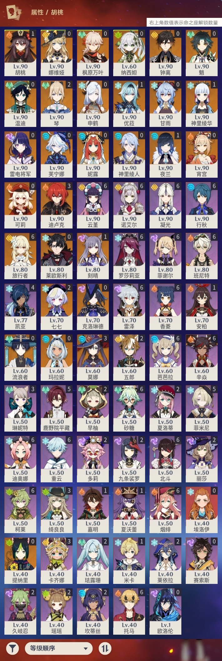 【原神】【lyys11219】冒险等级:60,五星数量:44,五星角色:迪卢克 3命莫娜 3命七七 2命琴 2命胡桃 1命刻晴 1命神里绫华 1命优菈 1命夜兰 1命玛拉妮温迪宵宫钟离申鹤神里绫人莱欧斯利芙宁娜娜维娅提纳里妮露纳西妲流浪者枫原万叶甘雨魈克洛琳德可莉雷电将军__五星武器:天空之卷 2精冲浪时光碧落之珑静水流涌之辉阿莫斯之弓苍古自由之誓风鹰剑护摩之杖四风原典松籁响起之时天空之傲天空之刃终末嗟叹之诗若水千夜浮梦__四星角色:班尼特 6命行秋 6命香菱 6命凝光 6命迪奥娜 6命砂糖 6命柯莱 6命芭芭拉 6命云堇 6命托马 6命烟绯 6命重云 6命辛焱 6命诺艾尔 6命罗莎莉亚 6命雷泽 6命菲谢尔 6命北斗 6命鹿野院平藏 5命菲米尼 5命卡齐娜 3命绮良良 3命琳妮特 3命九条裟罗 2命久岐忍 2命珐露珊 2命瑶瑶 2命莱依拉 2命坎蒂丝 2命多莉 2命早柚 2命五郎 2命夏洛蒂 2命米卡 1命夏沃蕾 1命嘉明 1命埃洛伊欧洛伦赛索斯