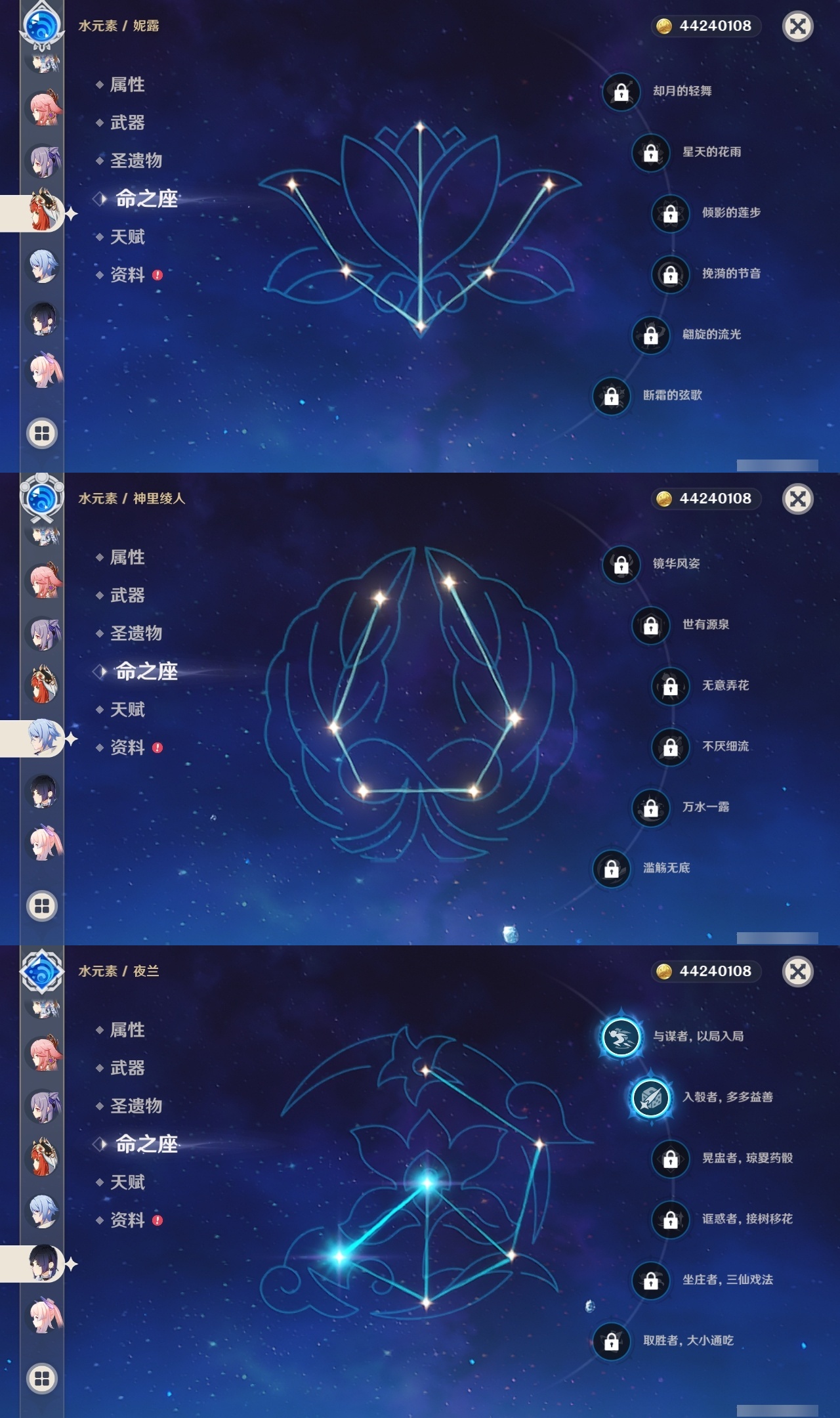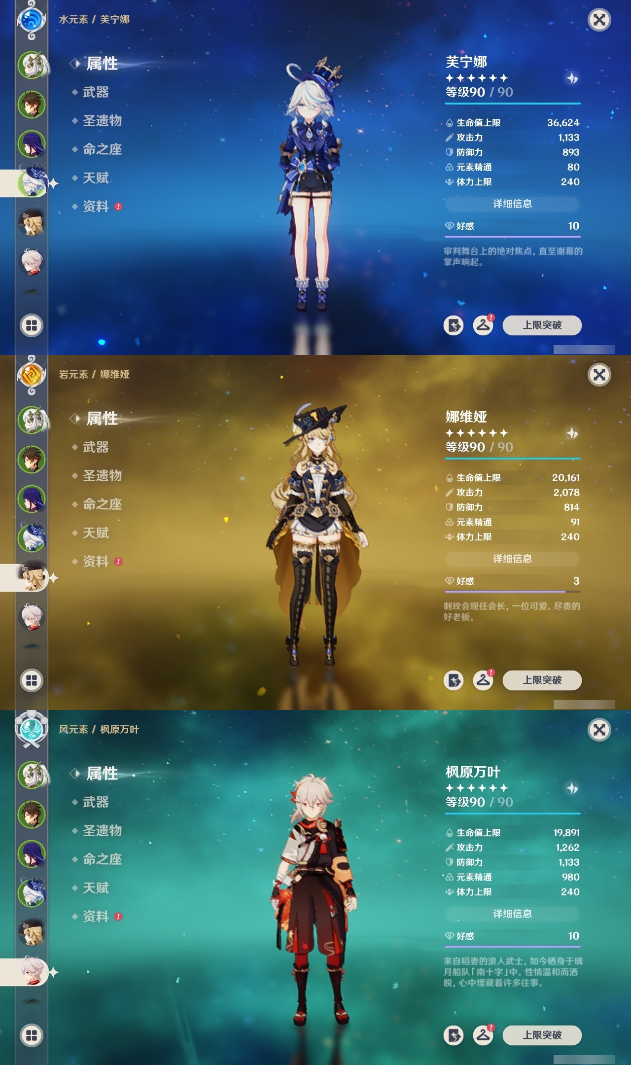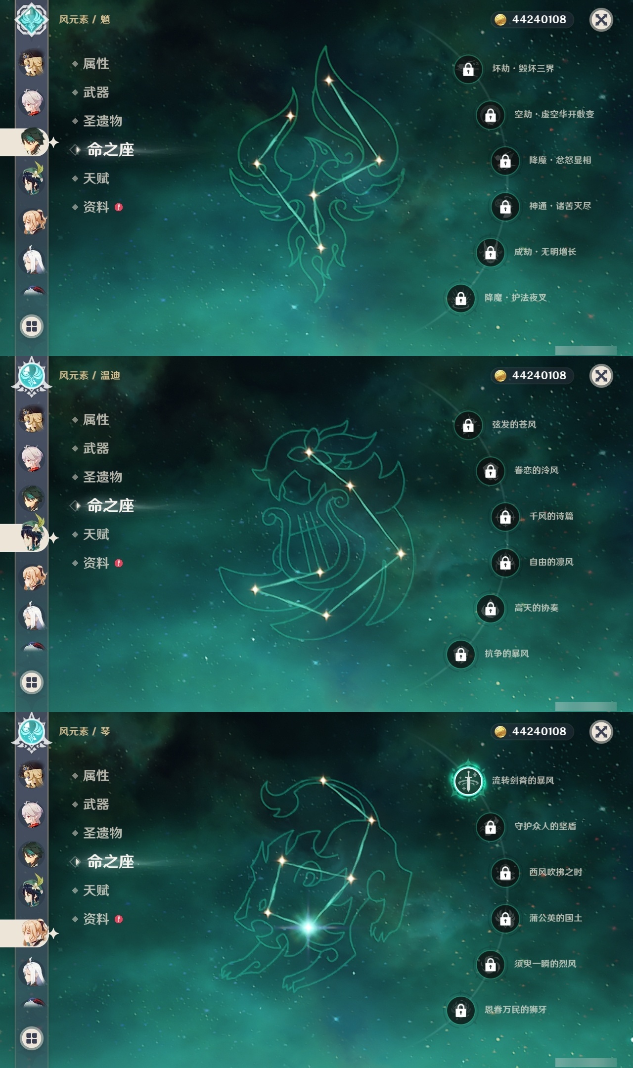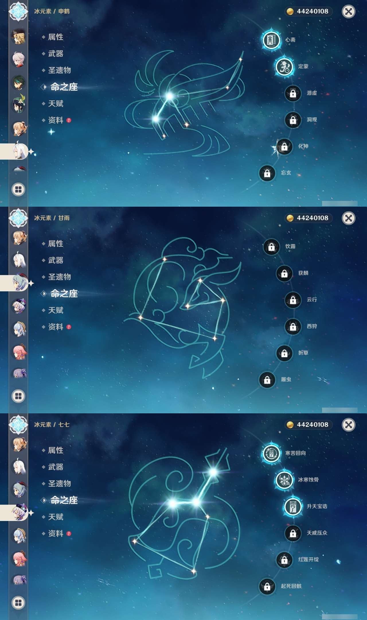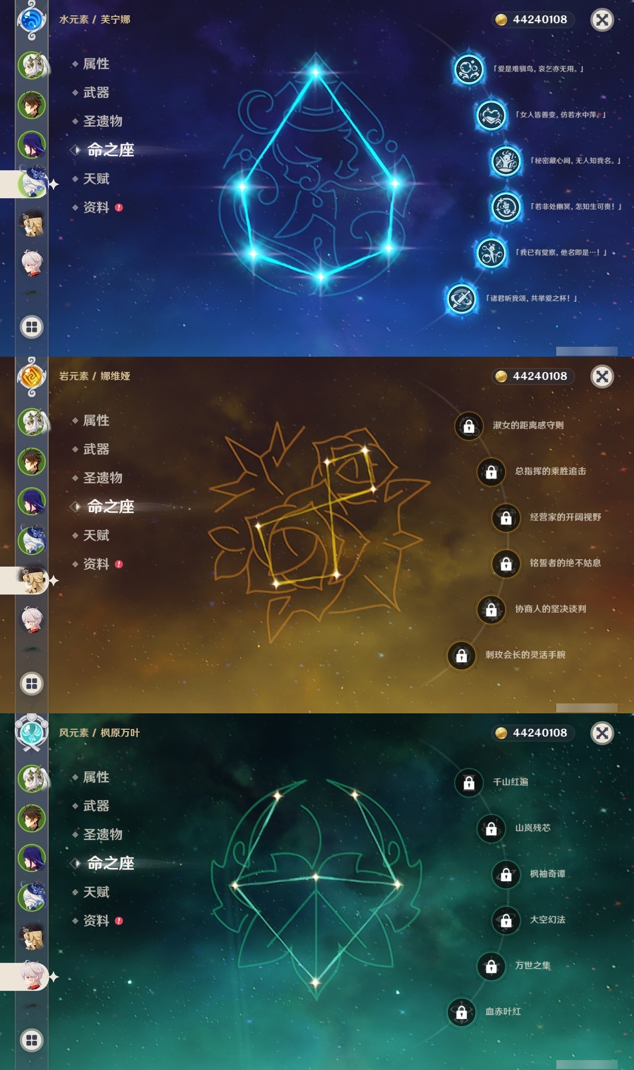 【原神】满命,冒险等级:60,五星数量:41,五星角色:芙宁娜 6命迪卢克 6命刻晴 6命雷电将军 3命七七 3命莫娜 2命申鹤 2命夜兰 2命纳西妲 2命迪希雅 1命胡桃 1命琴 1命基尼奇珊瑚宫心海神里绫华温迪钟离八重神子神里绫人娜维娅妮露枫原万叶甘雨魈可莉__五星武器:风鹰剑 2精和璞鸢 2精静水流涌之辉飞雷之弦振护摩之杖狼的末路磐岩结绿四风原典天空之傲天空之卷天空之刃雾切之回光薙草之稻光神乐之真意千夜浮梦__四星角色:班尼特 6命行秋 6命九条裟罗 6命香菱 6命凝光 6命迪奥娜 6命砂糖 6命莱依拉 6命柯莱 6命芭芭拉 6命云堇 6命早柚 6命托马 6命烟绯 6命重云 6命辛焱 6命诺艾尔 6命罗莎莉亚 6命雷泽 6命菲谢尔 6命北斗 6命夏洛蒂 6命久岐忍 4命坎蒂丝 4命绮良良 3命多莉 3命鹿野院平藏 2命珐露珊 1命欧洛伦 1命五郎 1命琳妮特 1命夏沃蕾 1命埃洛伊瑶瑶菲米尼