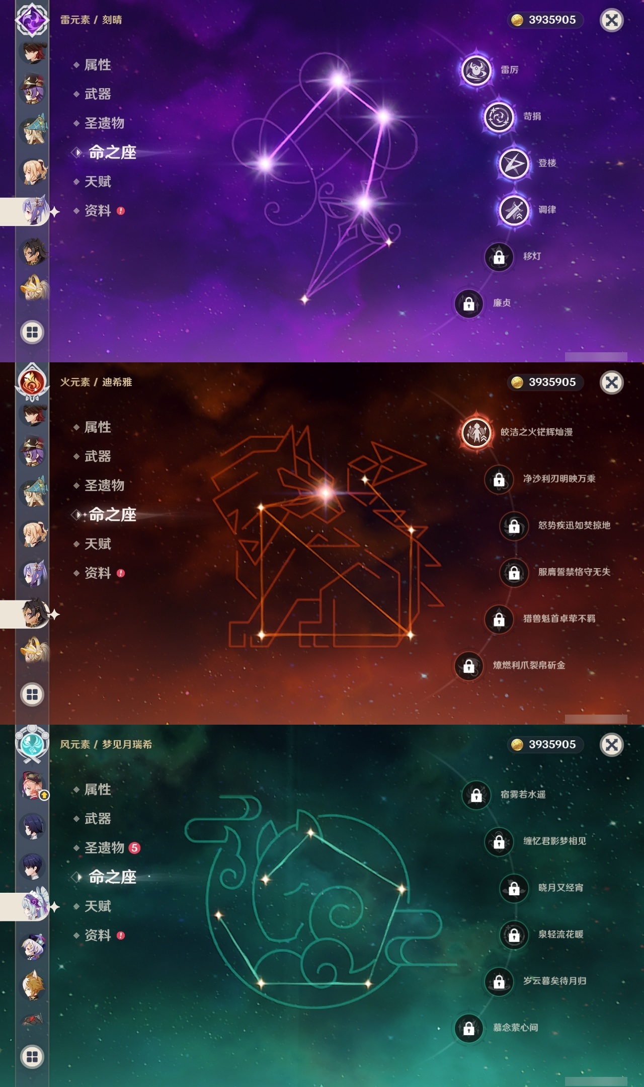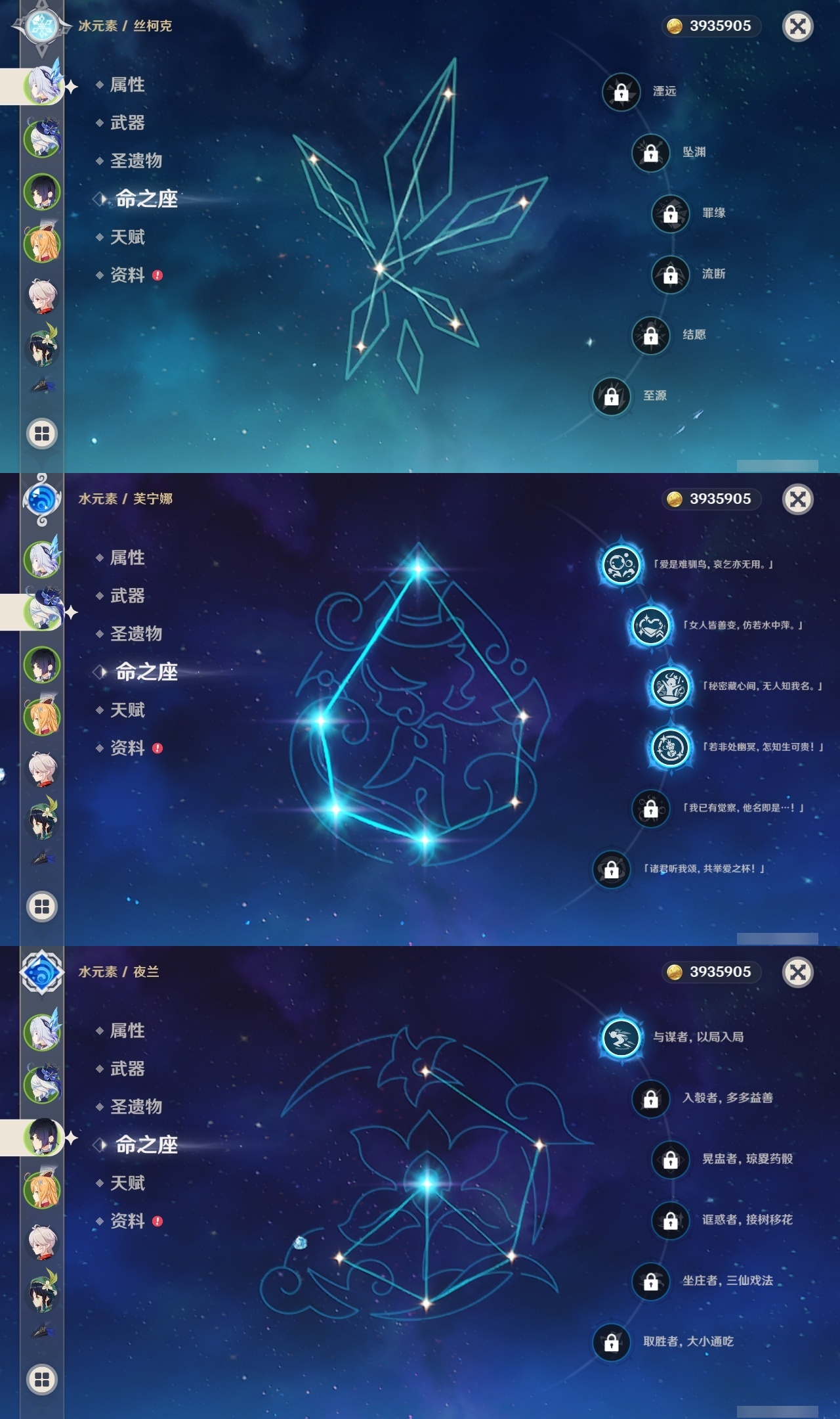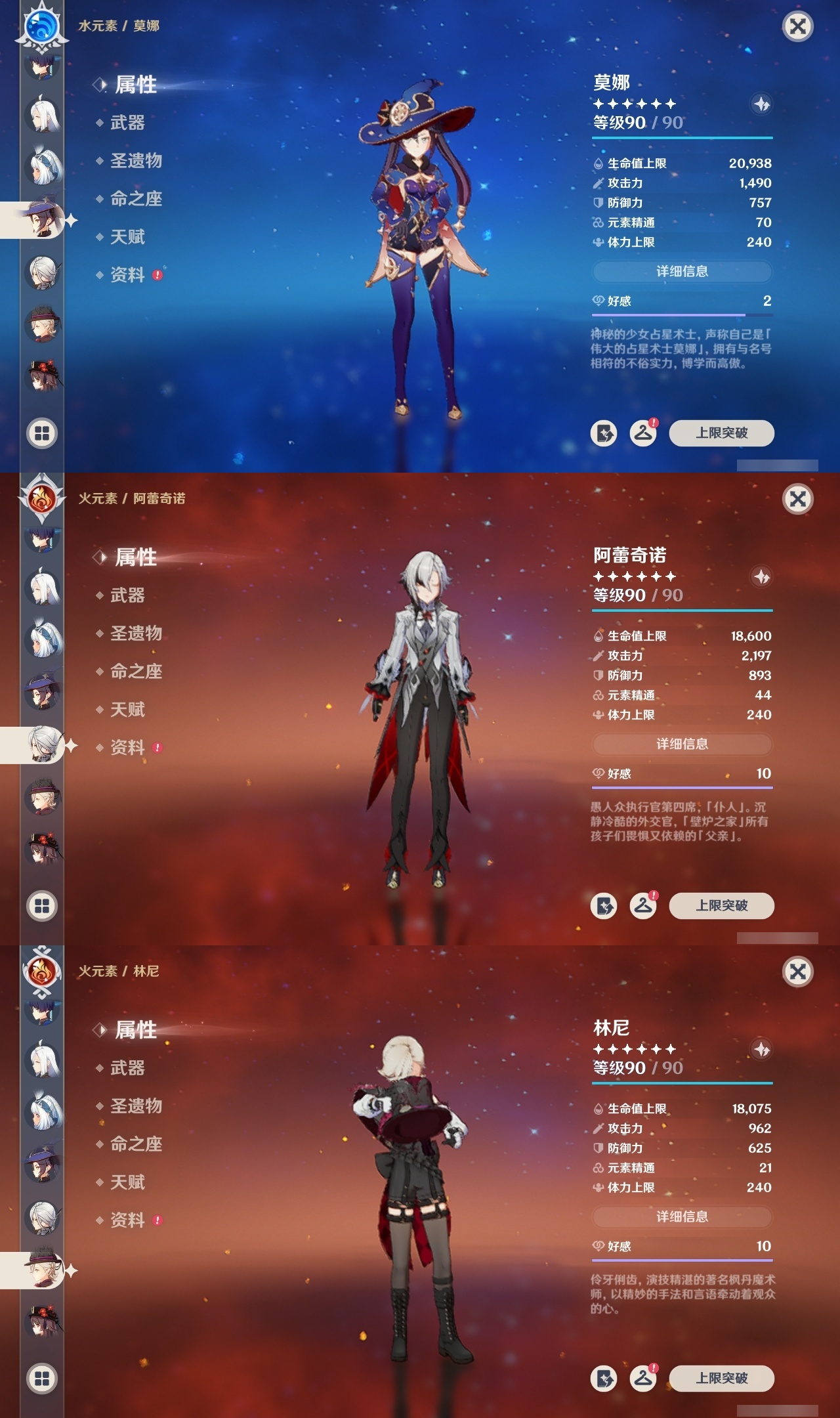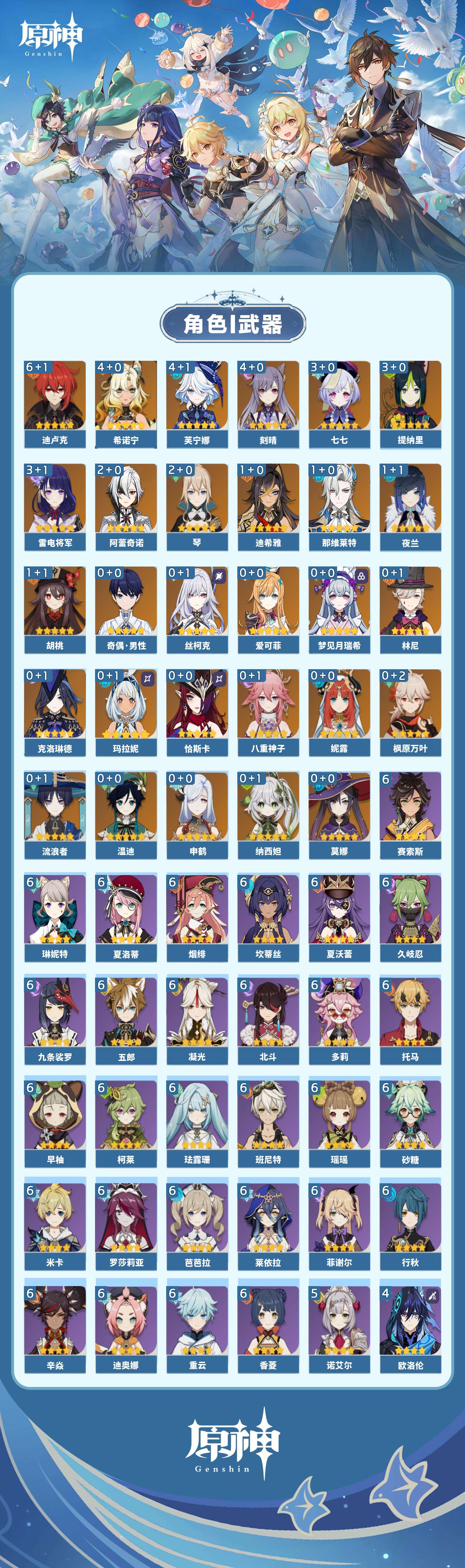 【原神】【lyys10881】冒险等级:60,五星数量:50,五星角色:迪卢克 6命希诺宁 4命芙宁娜 4命刻晴 4命雷电将军 3命七七 3命提纳里 3命阿蕾奇诺 2命琴 2命迪希雅 1命那维莱特 1命胡桃 1命夜兰 1命莫娜玛拉妮温迪恰斯卡梦见月瑞希申鹤八重神子林尼爱可菲丝柯克妮露纳西妲流浪者枫原万叶克洛琳德__五星武器:苍古自由之誓 2精四风原典 2精天空之翼 2精冲浪时光最初的大魔术静水流涌之辉苍耀图莱杜拉的回忆阿莫斯之弓飞雷之弦振风鹰剑和璞鸢护摩之杖狼的末路天空之脊薙草之稻光神乐之真意若水千夜浮梦赦罪__四星角色:班尼特 6命行秋 6命九条裟罗 6命香菱 6命久岐忍 6命珐露珊 6命凝光 6命迪奥娜 6命砂糖 6命瑶瑶 6命莱依拉 6命米卡 6命坎蒂丝 6命多莉 6命柯莱 6命芭芭拉 6命早柚 6命托马 6命五郎 6命烟绯 6命重云 6命辛焱 6命罗莎莉亚 6命菲谢尔 6命北斗 6命琳妮特 6命夏洛蒂 6命夏沃蕾 6命赛索斯 6命诺艾尔 5命欧洛伦 4命云堇 4命蓝砚 4命嘉明 4命绮良良 3命雷泽 3命卡齐娜 2命鹿野院平藏 2命伊法 2命伊安珊 2命菲米尼 1命爱诺 1命奇偶·女性奇偶·男性卡维塔利雅