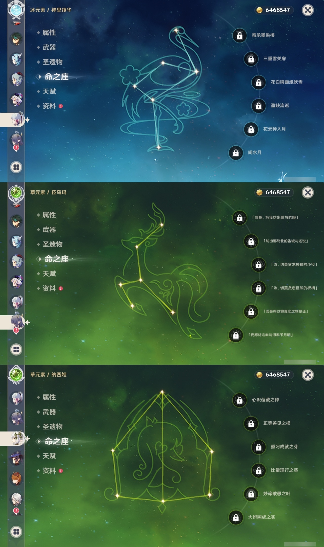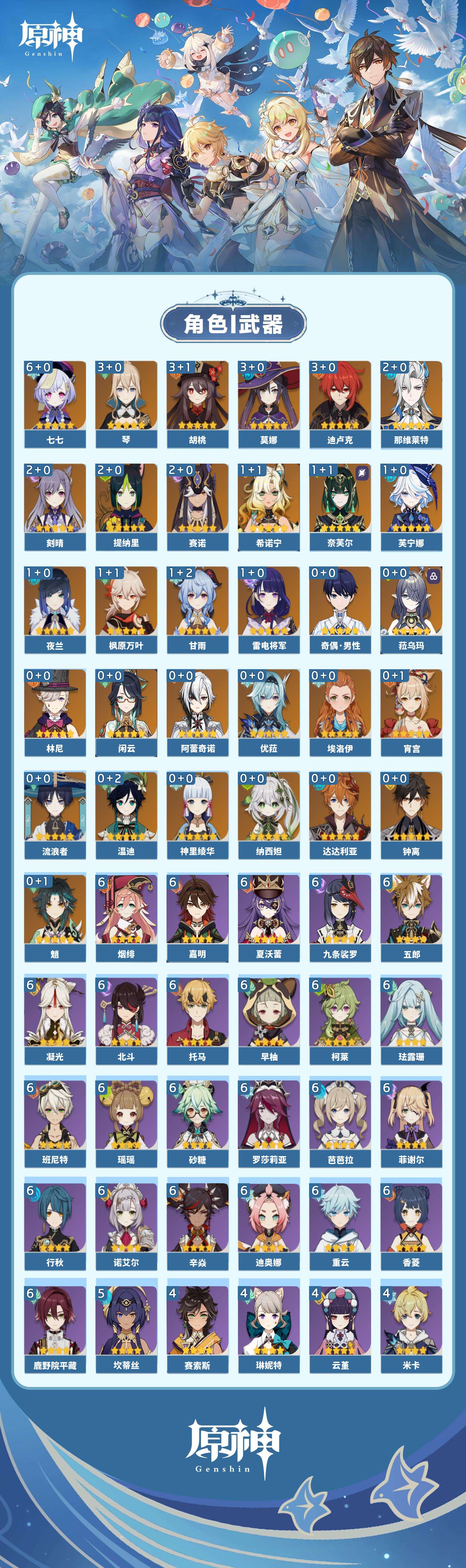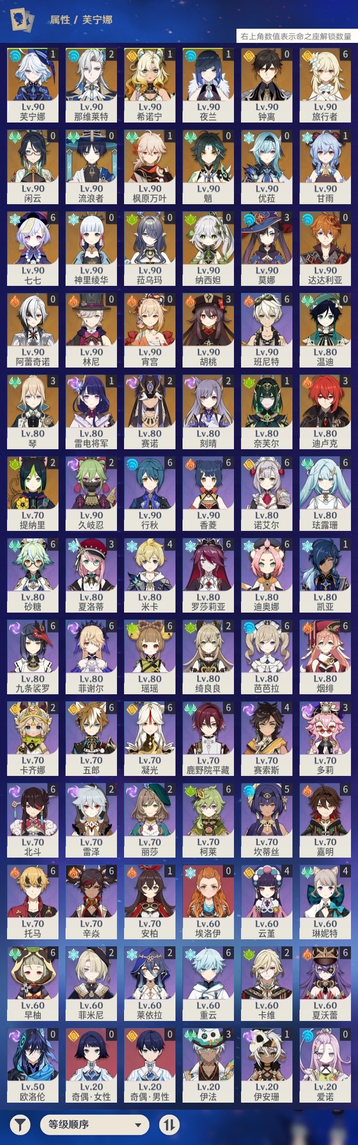 【原神】【lyys11242】冒险等级:60,五星数量:44,五星角色:七七 6命迪卢克 3命胡桃 3命莫娜 3命琴 3命那维莱特 2命刻晴 2命提纳里 2命赛诺 2命希诺宁 1命芙宁娜 1命奈芙尔 1命枫原万叶 1命甘雨 1命雷电将军 1命夜兰 1命神里绫华温迪宵宫优菈钟离达达利亚林尼闲云阿蕾奇诺纳西妲菈乌玛流浪者魈__五星武器:阿莫斯之弓 2精终末嗟叹之诗 2精岩峰巡歌真语秘匣苍古自由之誓飞雷之弦振风鹰剑和璞鸢护摩之杖四风原典天空之卷无工之剑__四星角色:班尼特 6命行秋 6命九条裟罗 6命香菱 6命鹿野院平藏 6命珐露珊 6命凝光 6命迪奥娜 6命砂糖 6命瑶瑶 6命柯莱 6命芭芭拉 6命早柚 6命托马 6命五郎 6命烟绯 6命重云 6命辛焱 6命诺艾尔 6命罗莎莉亚 6命菲谢尔 6命北斗 6命夏沃蕾 6命嘉明 6命坎蒂丝 5命米卡 4命云堇 4命琳妮特 4命赛索斯 4命多莉 3命夏洛蒂 3命伊法 3命卡齐娜 2命久岐忍 2命绮良良 2命莱依拉 2命卡维 2命雷泽 2命菲米尼 2命伊安珊 1命埃洛伊奇偶·女性奇偶·男性欧洛伦爱诺