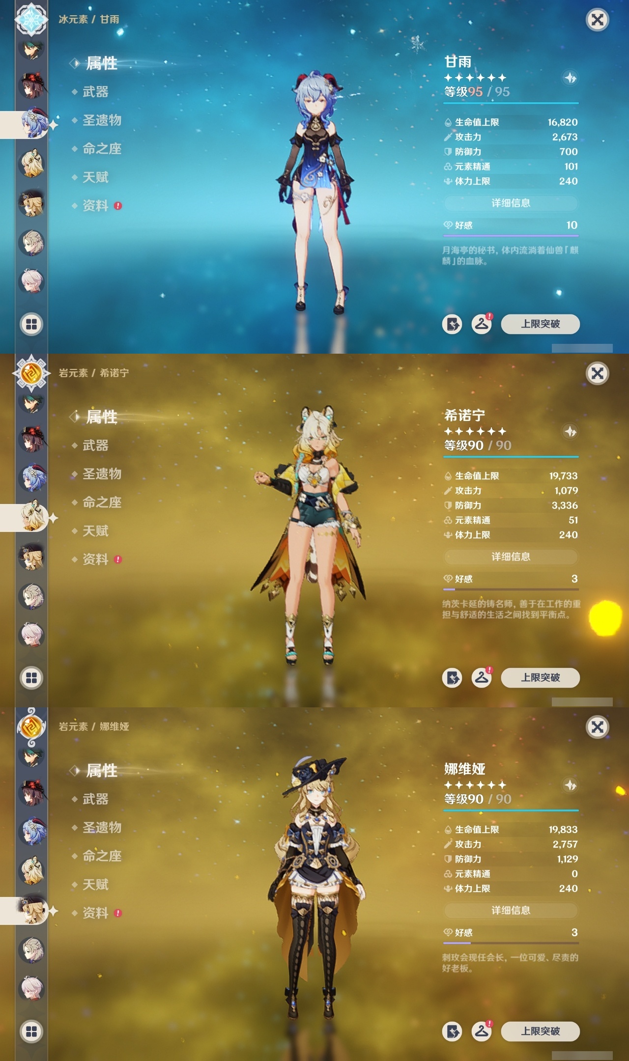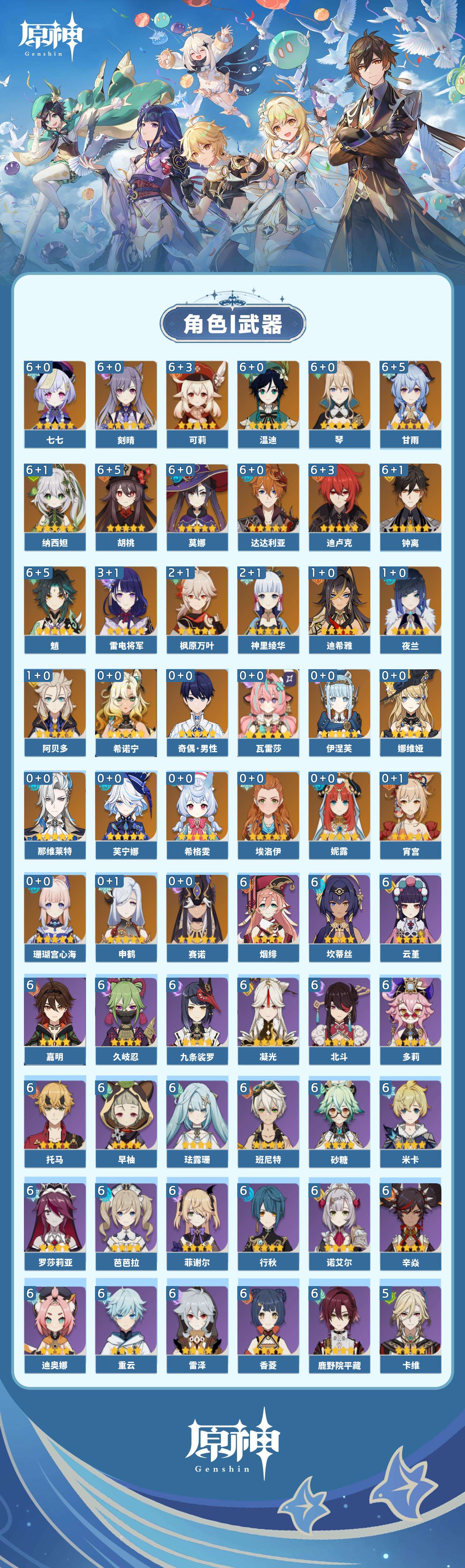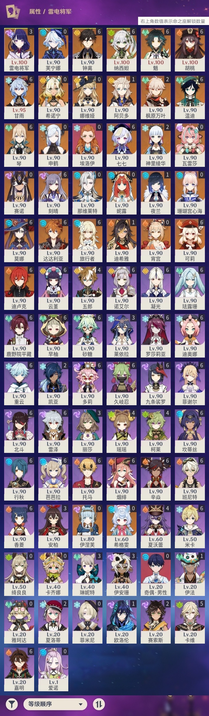 【原神】3满命,冒险等级:60,五星数量:54,五星角色:达达利亚 6命迪卢克 6命甘雨 6命魈 6命胡桃 6命可莉 6命刻晴 6命莫娜 6命七七 6命琴 6命温迪 6命钟离 6命纳西妲 6命雷电将军 3命枫原万叶 2命神里绫华 2命迪希雅 1命阿贝多 1命夜兰 1命珊瑚宫心海希诺宁宵宫申鹤瓦雷莎那维莱特芙宁娜娜维娅赛诺妮露伊涅芙希格雯__五星武器:阿莫斯之弓 5精和璞鸢 5精护摩之杖 5精磐岩结绿 5精天空之翼 5精天空之傲 4精狼的末路 3精四风原典 3精风鹰剑 2精天空之脊 2精波乱月白经津 2精鹤鸣余音裁叶萃光苍古自由之誓飞雷之弦振雾切之回光薙草之稻光息灾贯虹之槊千夜浮梦赦罪__四星角色:班尼特 6命行秋 6命九条裟罗 6命香菱 6命久岐忍 6命鹿野院平藏 6命珐露珊 6命凝光 6命迪奥娜 6命砂糖 6命米卡 6命坎蒂丝 6命多莉 6命芭芭拉 6命云堇 6命早柚 6命托马 6命烟绯 6命重云 6命辛焱 6命诺艾尔 6命罗莎莉亚 6命雷泽 6命菲谢尔 6命北斗 6命嘉明 6命卡维 5命瑶瑶 4命柯莱 4命五郎 4命夏沃蕾 4命莱依拉 3命琳妮特 3命伊安珊 3命夏洛蒂 2命赛索斯 2命欧洛伦 1命伊法 1命埃洛伊奇偶·男性卡齐娜绮良良菲米尼爱诺