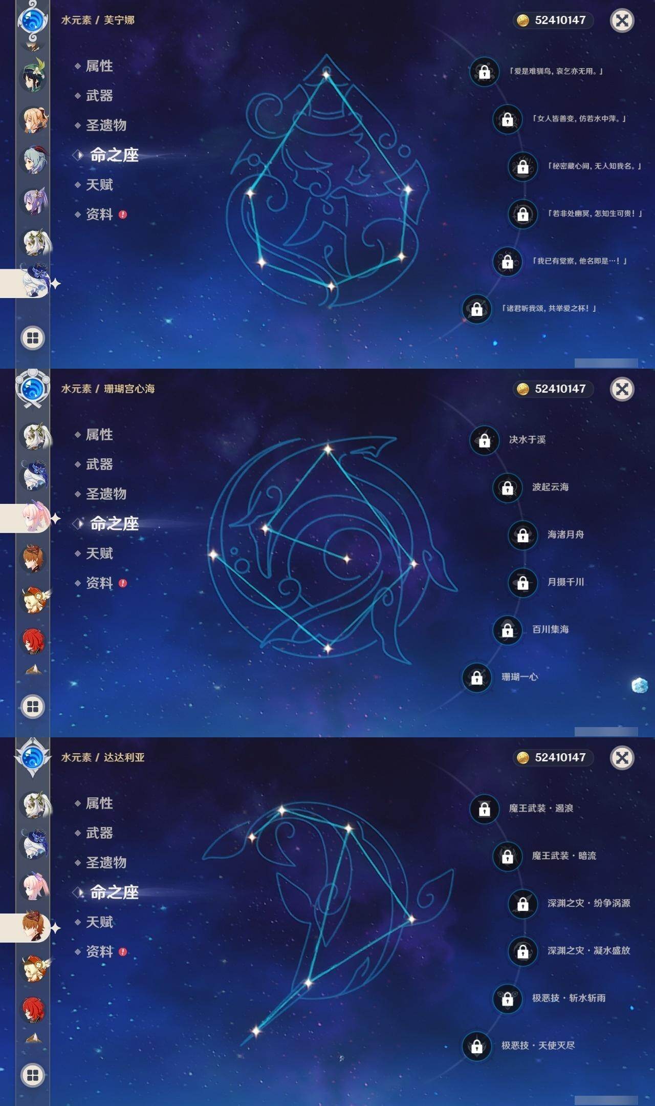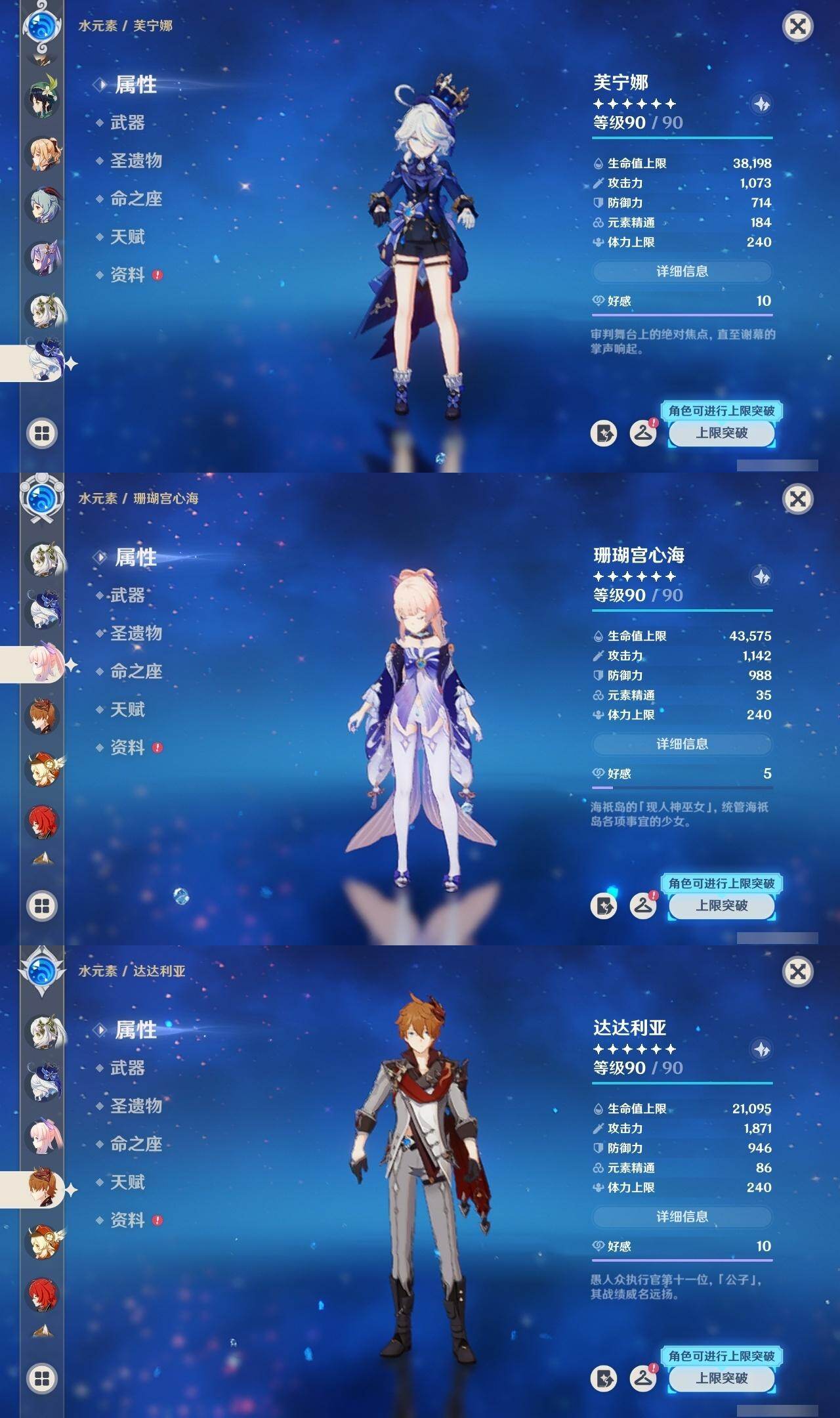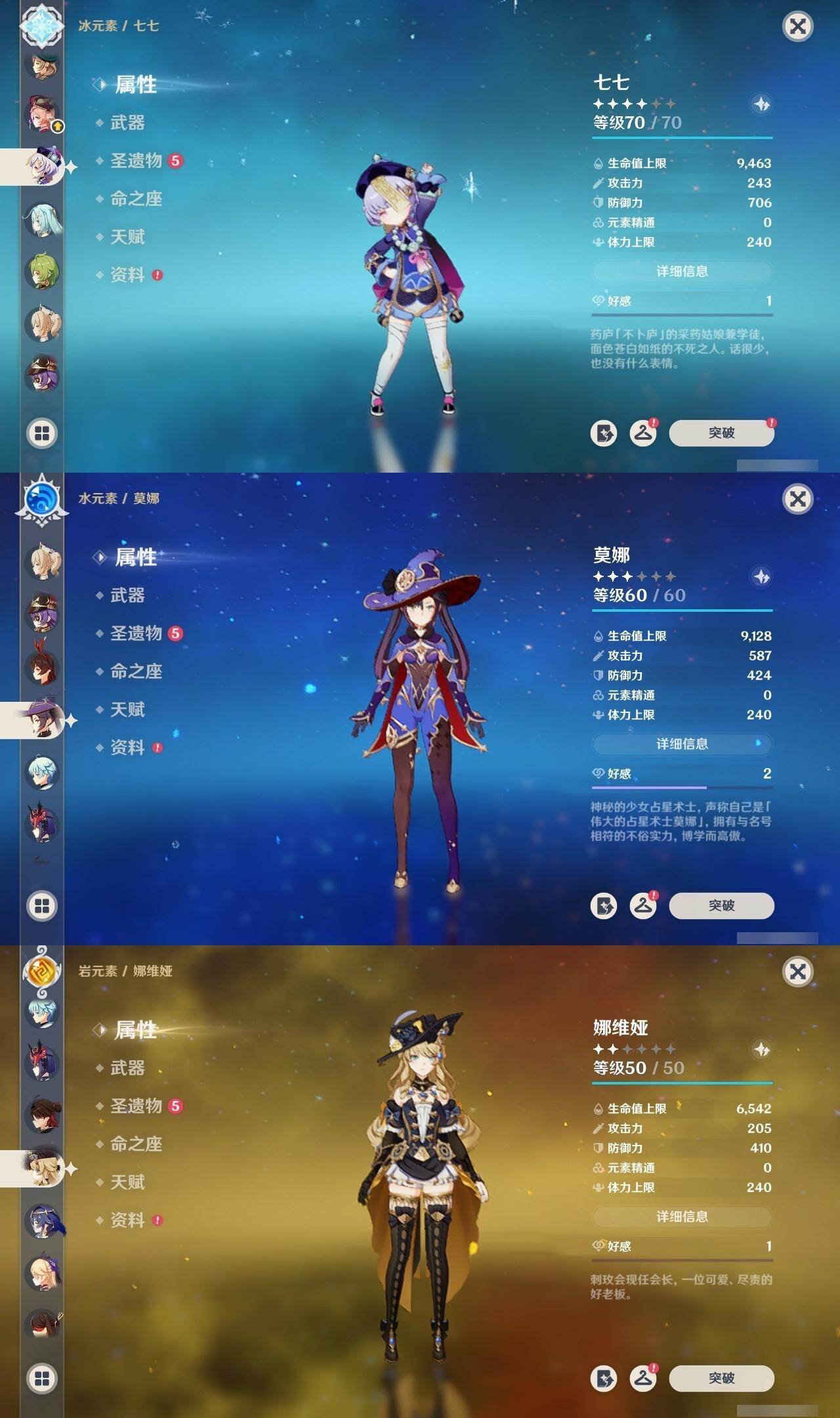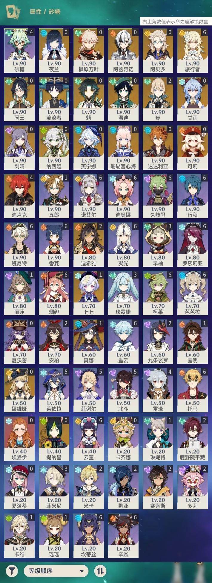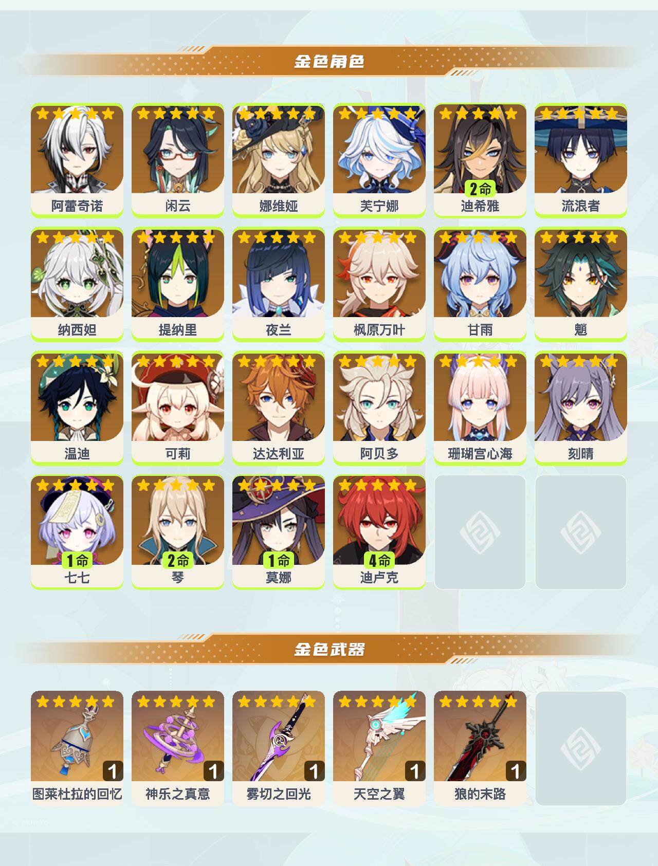 60级/39黄/女主/22个五星角色/7个五星武器 0命阿蕾奇诺0命闲云0命娜维娅0命芙宁娜2命迪希雅0命流浪者0命纳西妲0命提纳里0命夜兰0命枫原万叶0命甘雨0命魈0命温迪0命可莉0命达达利亚0命阿贝多0命珊瑚宫心海0命刻晴1命七七2命琴1命莫娜4命迪卢克精1图莱杜拉的回忆精1神乐之真意精1雾切之回光精1天空之翼精1狼的末路