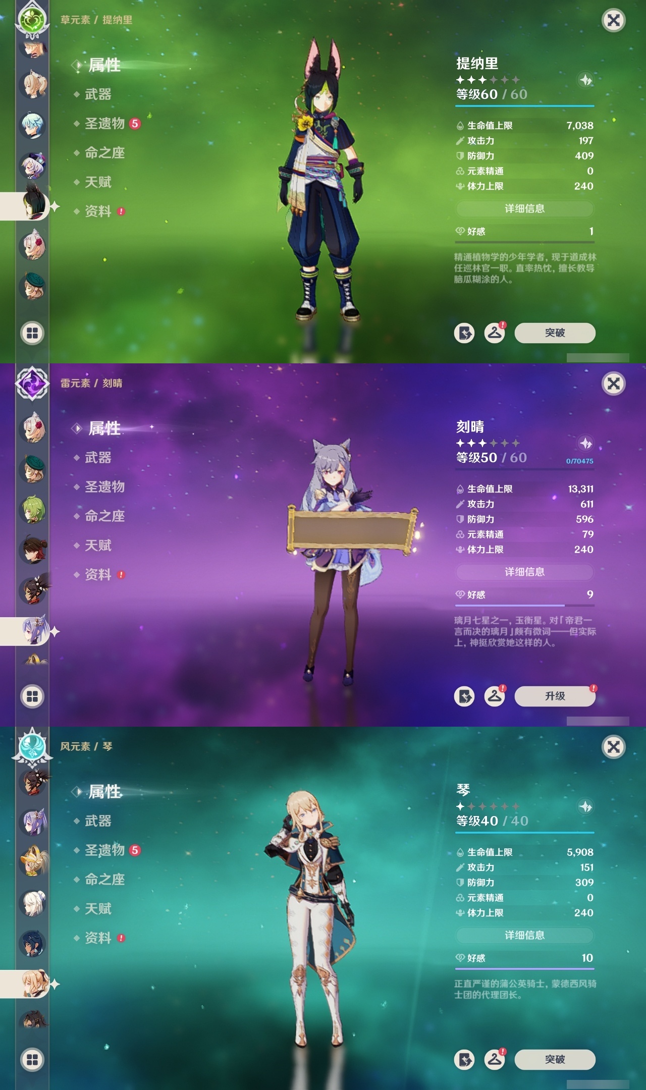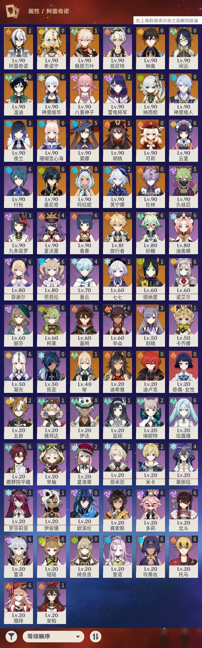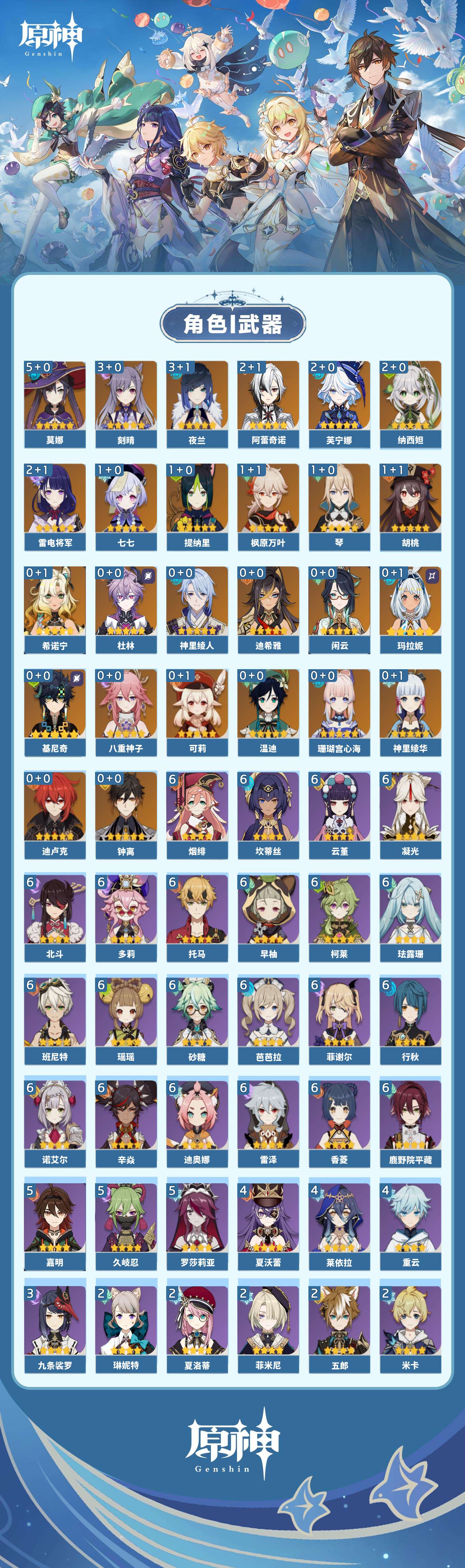 【原神】【lyys11254】冒险等级:60,五星数量:41,五星角色:莫娜 5命刻晴 3命夜兰 3命芙宁娜 2命阿蕾奇诺 2命雷电将军 2命纳西妲 2命枫原万叶 1命胡桃 1命七七 1命琴 1命提纳里 1命玛拉妮基尼奇珊瑚宫心海希诺宁神里绫华温迪迪希雅钟离八重神子神里绫人闲云杜林迪卢克可莉__五星武器:最初的大魔术 3精阿莫斯之弓 2精冲浪时光岩峰巡歌赤月之形苍古自由之誓护摩之杖四风原典天空之卷天空之刃天空之翼雾切之回光薙草之稻光若水__四星角色:班尼特 6命行秋 6命香菱 6命鹿野院平藏 6命珐露珊 6命凝光 6命迪奥娜 6命砂糖 6命瑶瑶 6命坎蒂丝 6命多莉 6命柯莱 6命芭芭拉 6命云堇 6命早柚 6命托马 6命烟绯 6命辛焱 6命诺艾尔 6命雷泽 6命菲谢尔 6命北斗 6命久岐忍 5命罗莎莉亚 5命嘉明 5命莱依拉 4命重云 4命夏沃蕾 4命九条裟罗 3命米卡 2命五郎 2命菲米尼 2命琳妮特 2命夏洛蒂 2命卡齐娜 1命蓝砚 1命伊安珊 1命爱诺 1命奇偶·女性绮良良欧洛伦伊法赛索斯