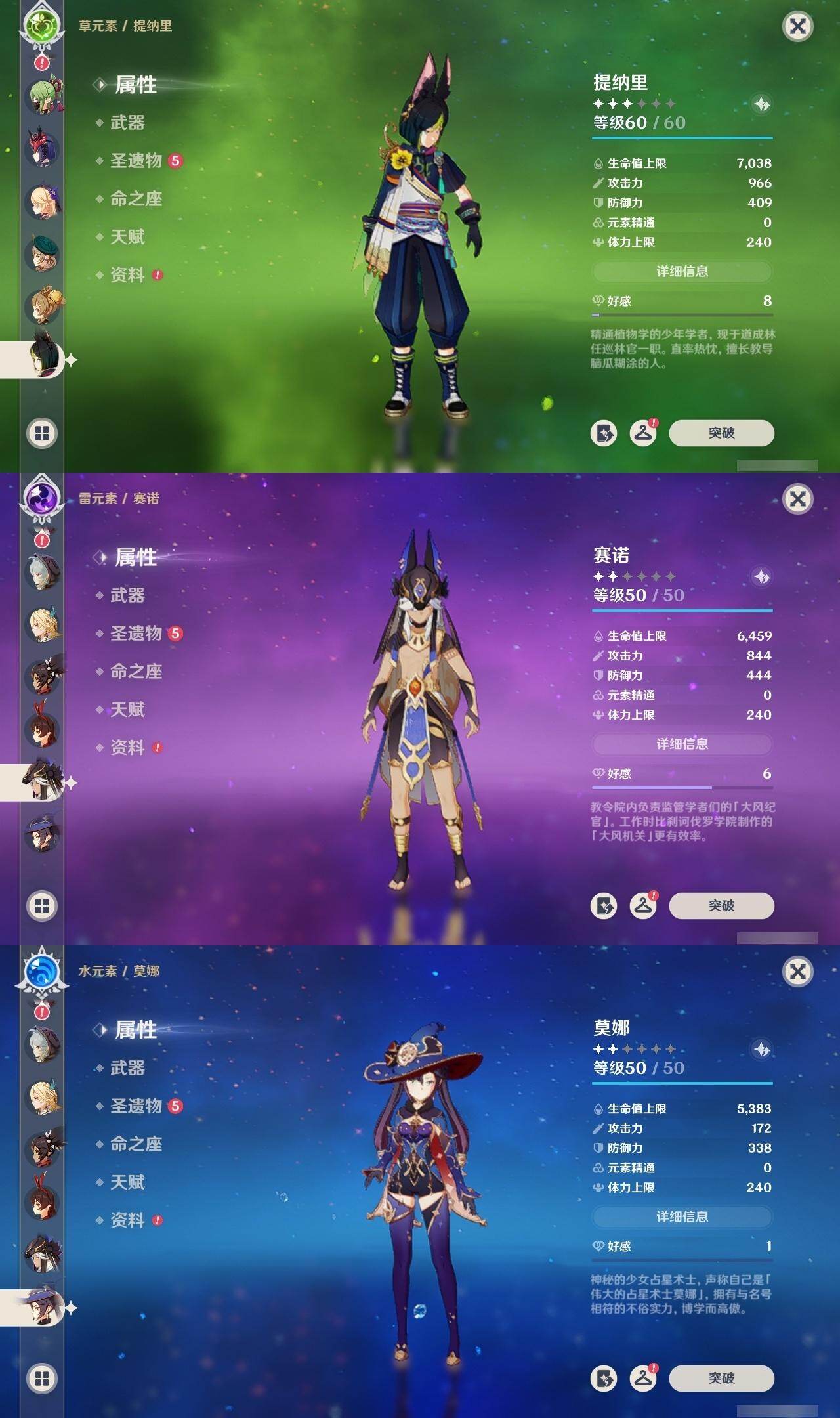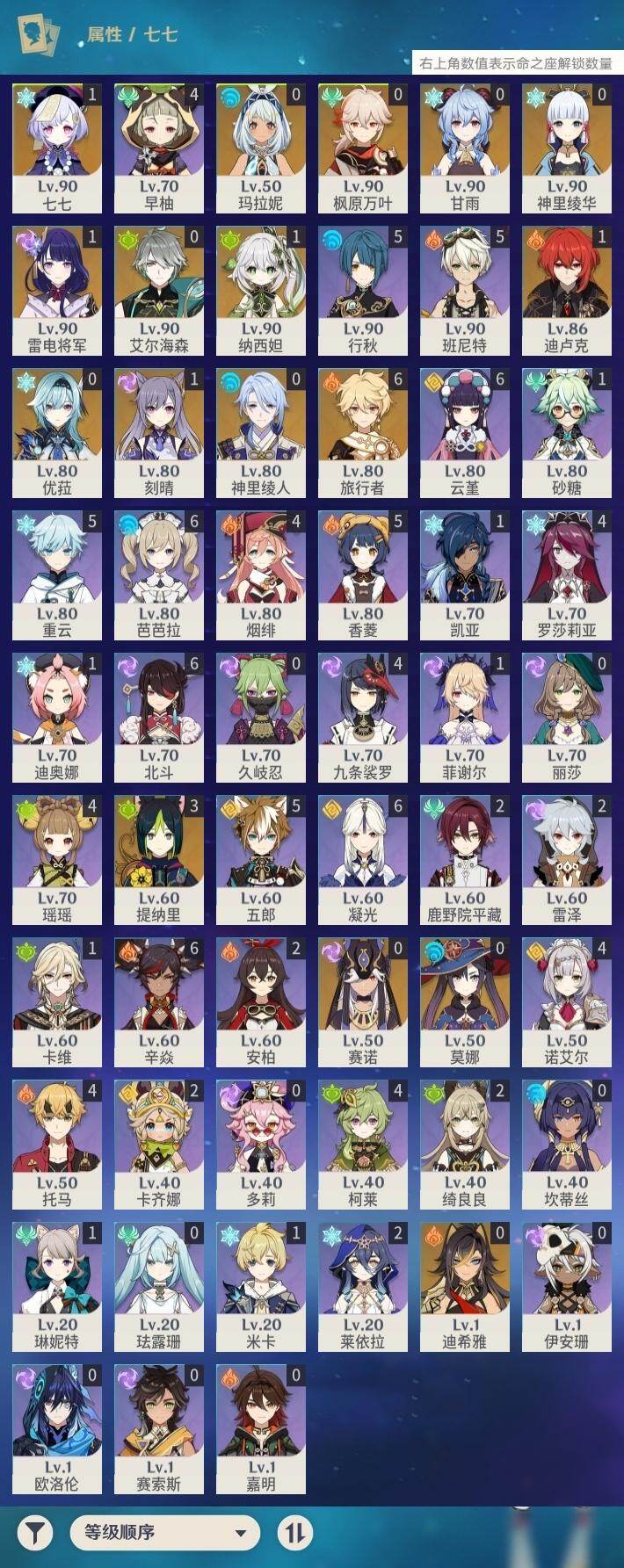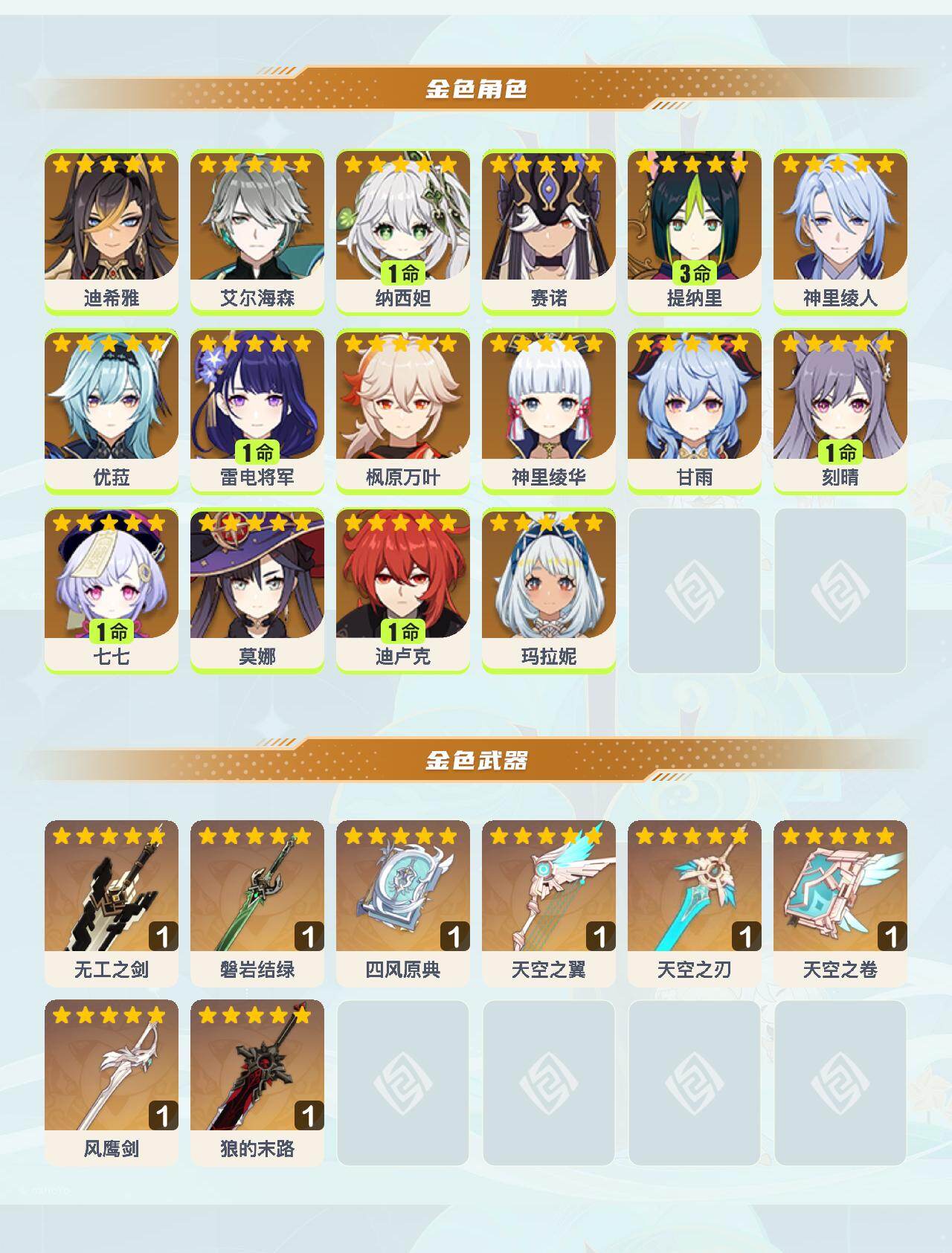 59级/32黄/男主/16个五星角色/8个五星武器 0命迪希雅0命艾尔海森1命纳西妲0命赛诺3命提纳里0命神里绫人0命优菈1命雷电将军0命枫原万叶0命神里绫华0命甘雨1命刻晴1命七七0命莫娜1命迪卢克0命玛拉妮精1无工之剑精1磐岩结绿精1四风原典精1天空之翼精1天空之刃精1天空之卷精1风鹰剑精1狼的末路