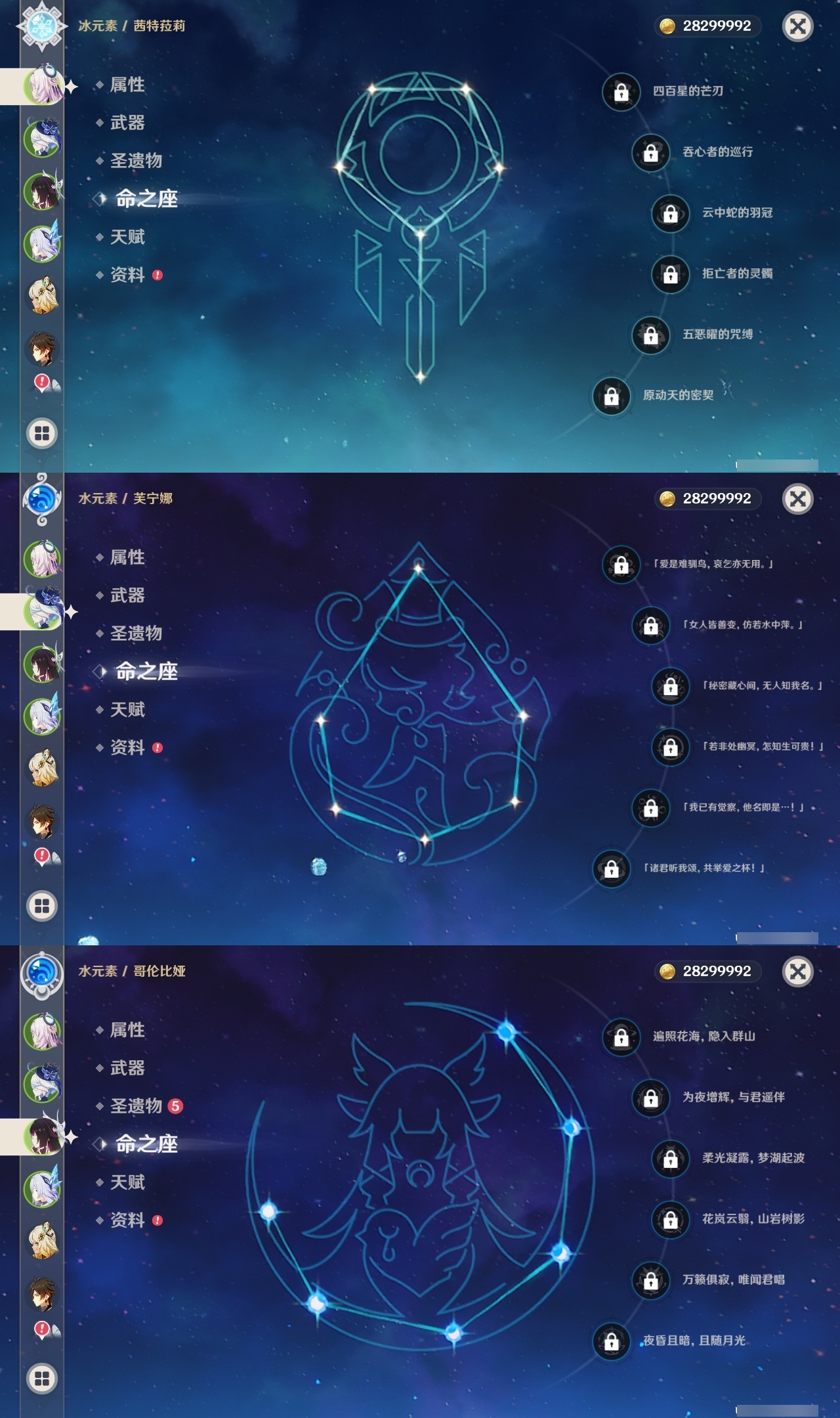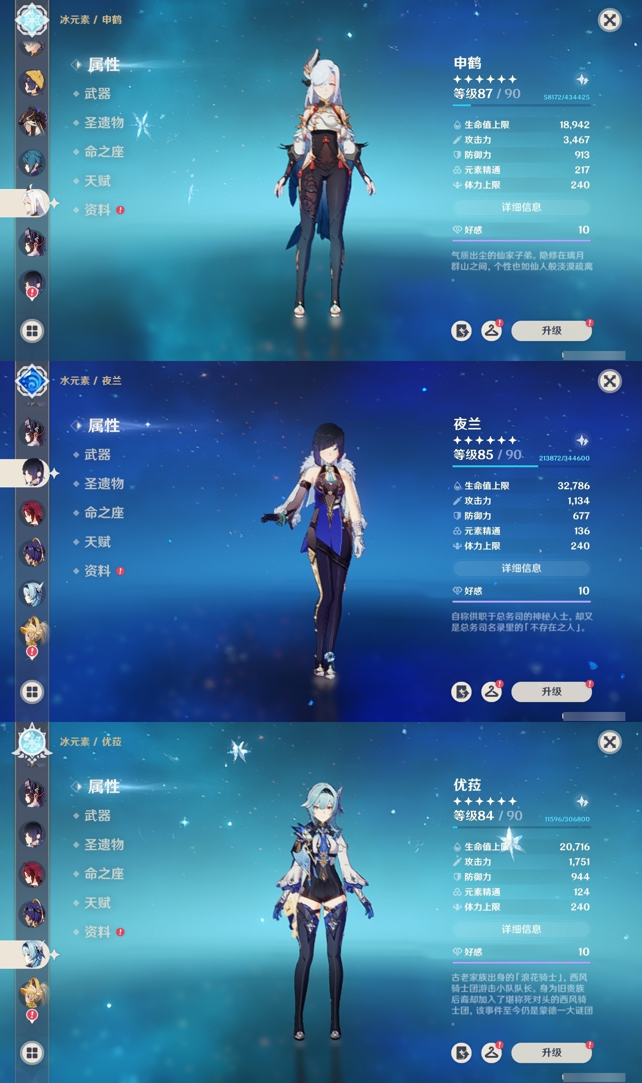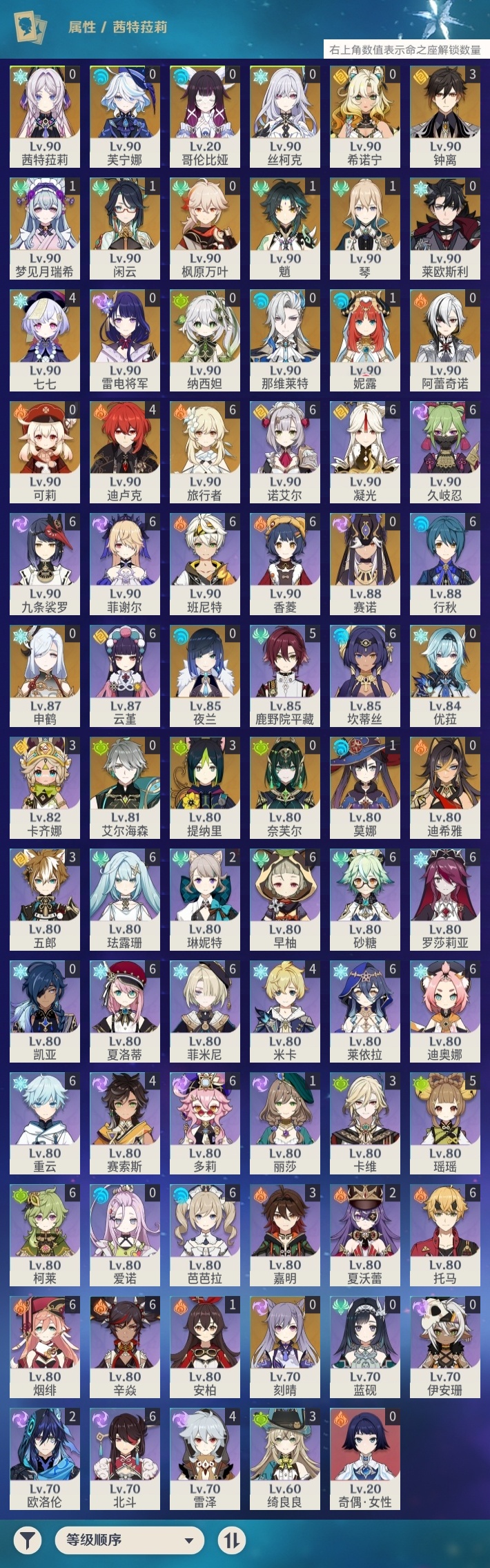 【原神】【lyys11269】冒险等级:60,五星数量:46,五星角色:迪卢克 4命七七 4命钟离 3命提纳里 3命梦见月瑞希 1命闲云 1命魈 1命莫娜 1命琴 1命妮露 1命希诺宁茜特菈莉优菈迪希雅申鹤那维莱特莱欧斯利夜兰芙宁娜赛诺阿蕾奇诺丝柯克纳西妲艾尔海森奈芙尔哥伦比娅枫原万叶可莉刻晴雷电将军__五星武器:风鹰剑 2精天空之傲 2精岩峰巡歌苇海信标静水流涌之辉裁断鹤鸣余音赤月之形裁叶萃光图莱杜拉的回忆四风原典天空之刃天空之翼薙草之稻光千夜浮梦__四星角色:班尼特 6命行秋 6命九条裟罗 6命香菱 6命久岐忍 6命珐露珊 6命凝光 6命迪奥娜 6命砂糖 6命莱依拉 6命坎蒂丝 6命多莉 6命柯莱 6命芭芭拉 6命云堇 6命早柚 6命托马 6命烟绯 6命重云 6命辛焱 6命诺艾尔 6命罗莎莉亚 6命菲谢尔 6命北斗 6命菲米尼 6命夏洛蒂 6命鹿野院平藏 5命瑶瑶 5命米卡 4命雷泽 4命赛索斯 4命卡齐娜 3命绮良良 3命卡维 3命五郎 3命嘉明 3命欧洛伦 2命琳妮特 2命夏沃蕾 2命奇偶·女性蓝砚伊安珊爱诺