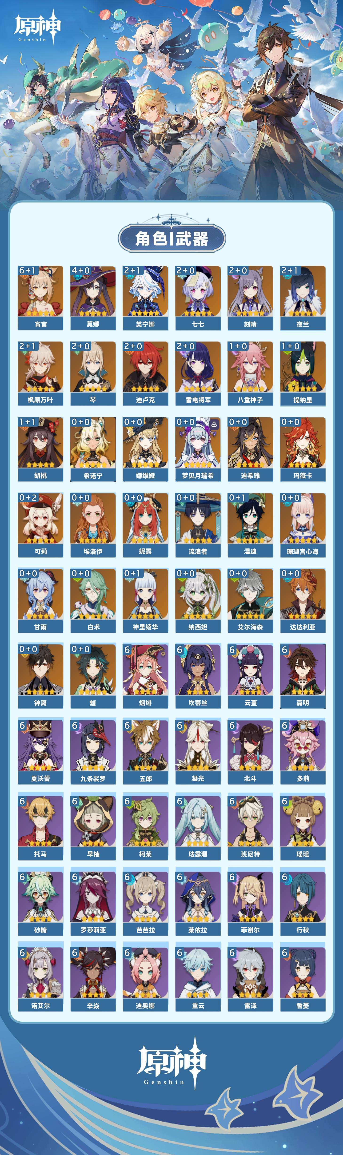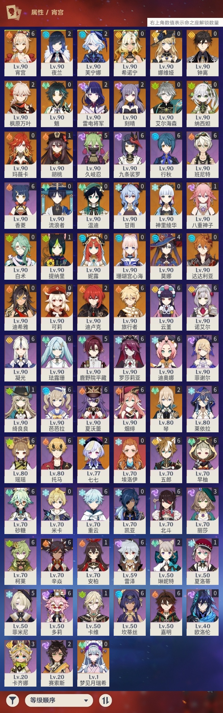【原神】【lyys11272】冒险等级:60,五星数量:45,五星角色:宵宫 6命莫娜 4命芙宁娜 2命迪卢克 2命枫原万叶 2命刻晴 2命雷电将军 2命七七 2命琴 2命夜兰 2命胡桃 1命八重神子 1命提纳里 1命珊瑚宫心海希诺宁白术神里绫华温迪玛薇卡迪希雅钟离达达利亚梦见月瑞希娜维娅妮露纳西妲艾尔海森流浪者甘雨魈可莉__五星武器:风鹰剑 2精四风原典 2精天空之脊 2精祭星者之望静水流涌之辉苍古自由之誓飞雷之弦振护摩之杖天空之卷雾切之回光终末嗟叹之诗若水白雨心弦__四星角色:班尼特 6命行秋 6命九条裟罗 6命香菱 6命珐露珊 6命凝光 6命迪奥娜 6命砂糖 6命瑶瑶 6命莱依拉 6命坎蒂丝 6命多莉 6命柯莱 6命芭芭拉 6命云堇 6命早柚 6命托马 6命五郎 6命烟绯 6命重云 6命辛焱 6命诺艾尔 6命罗莎莉亚 6命雷泽 6命菲谢尔 6命北斗 6命夏沃蕾 6命嘉明 6命久岐忍 5命鹿野院平藏 5命菲米尼 5命卡齐娜 3命琳妮特 2命赛索斯 2命绮良良 1命卡维 1命夏洛蒂 1命埃洛伊米卡欧洛伦