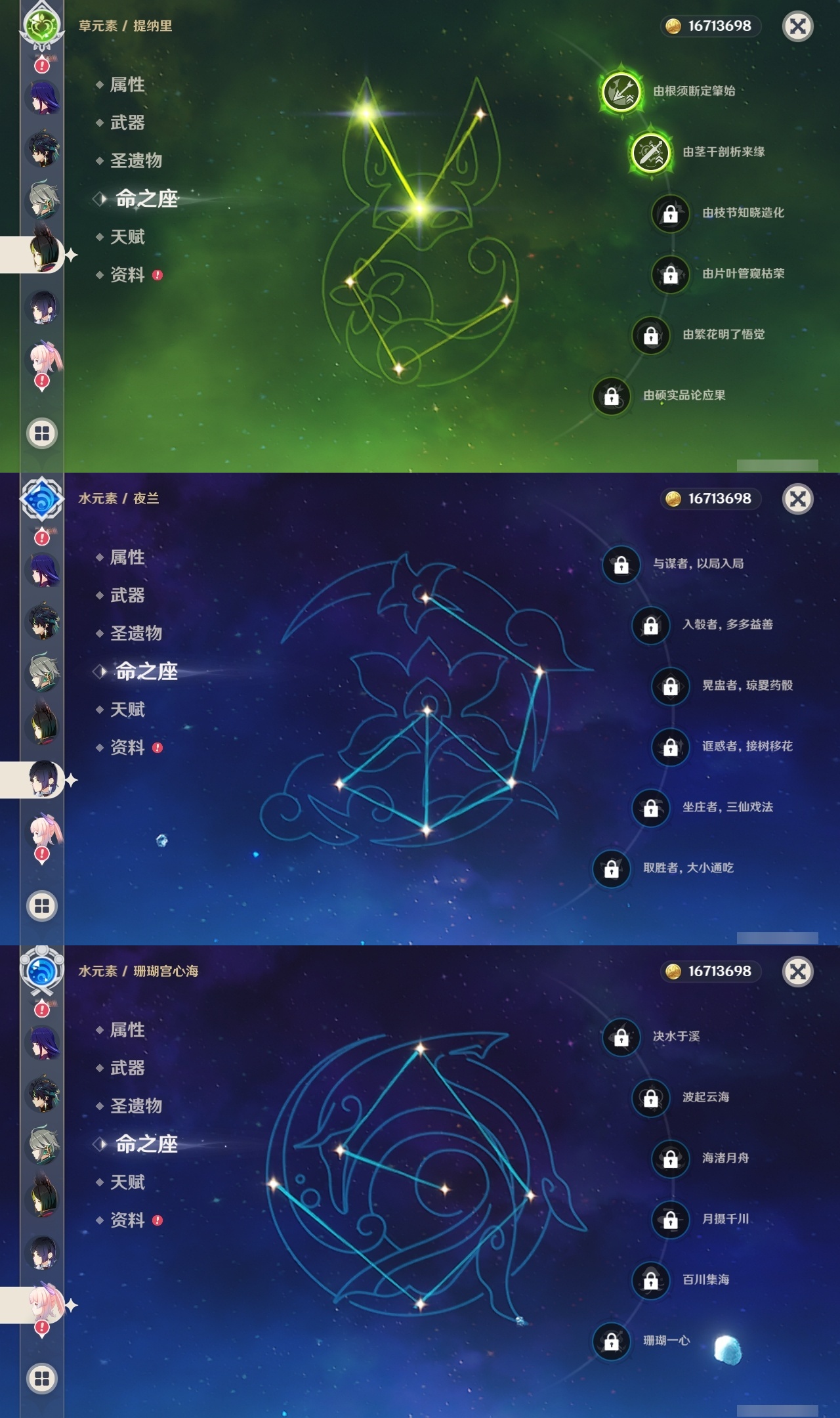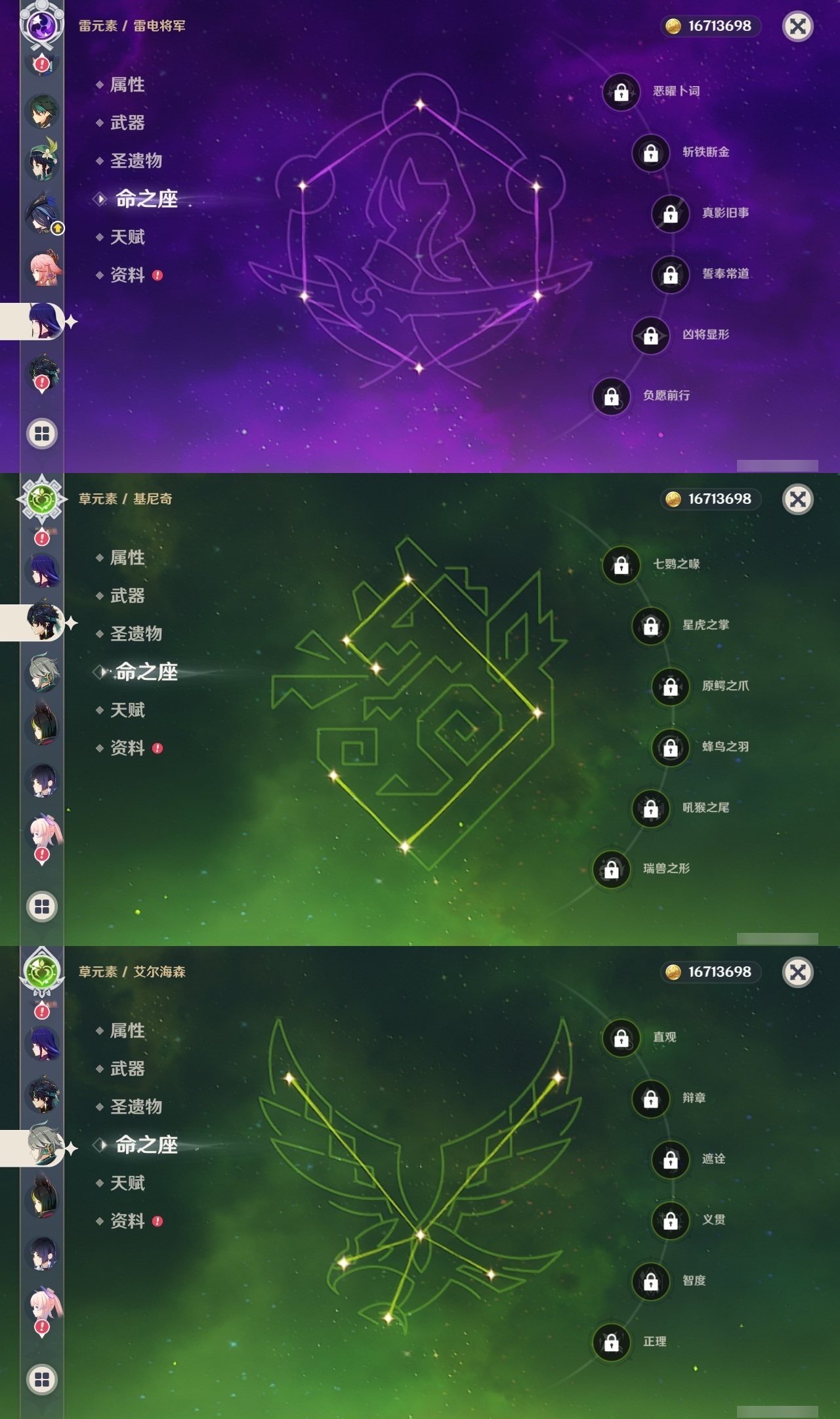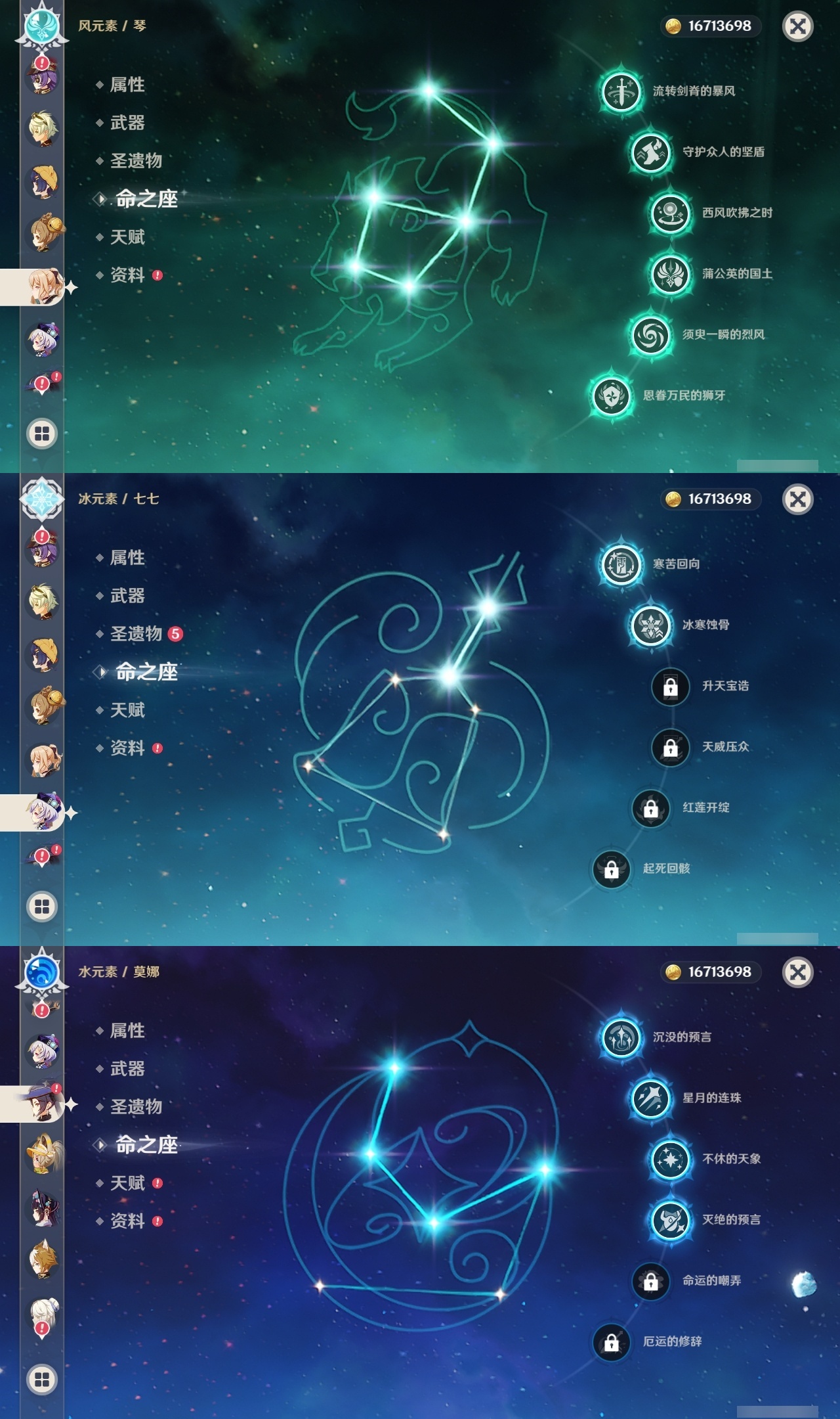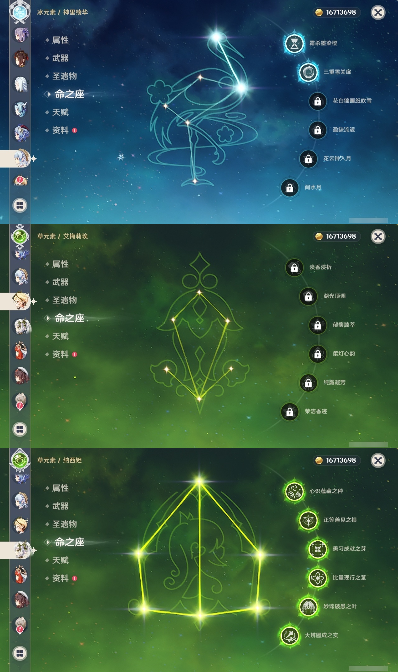 【原神】满命,冒险等级:60,五星数量:53,五星角色:刻晴 6命琴 6命纳西妲 6命莫娜 4命迪卢克 3命那维莱特 2命闲云 2命阿蕾奇诺 2命七七 2命神里绫华 2命提纳里 2命迪希雅 1命芙宁娜 1命枫原万叶 1命胡桃 1命艾梅莉埃基尼奇珊瑚宫心海希诺宁温迪玛薇卡优菈钟离申鹤瓦雷莎八重神子阿贝多夜兰千织爱可菲妮露艾尔海森流浪者甘雨魈克洛琳德雷电将军__五星武器:万世流涌大典有乐御簾切阿莫斯之弓苍古自由之誓风鹰剑和璞鸢护摩之杖狼的末路四风原典天空之傲天空之卷天空之翼雾切之回光若水千夜浮梦__四星角色:班尼特 6命行秋 6命香菱 6命久岐忍 6命鹿野院平藏 6命珐露珊 6命凝光 6命迪奥娜 6命砂糖 6命莱依拉 6命多莉 6命柯莱 6命卡维 6命芭芭拉 6命云堇 6命早柚 6命托马 6命五郎 6命烟绯 6命重云 6命辛焱 6命诺艾尔 6命罗莎莉亚 6命雷泽 6命菲谢尔 6命北斗 6命琳妮特 6命夏洛蒂 6命夏沃蕾 6命嘉明 6命绮良良 5命瑶瑶 5命坎蒂丝 5命欧洛伦 5命伊法 5命米卡 4命卡齐娜 3命九条裟罗 3命蓝砚 3命赛索斯 3命菲米尼 1命爱诺 1命埃洛伊伊安珊塔利雅