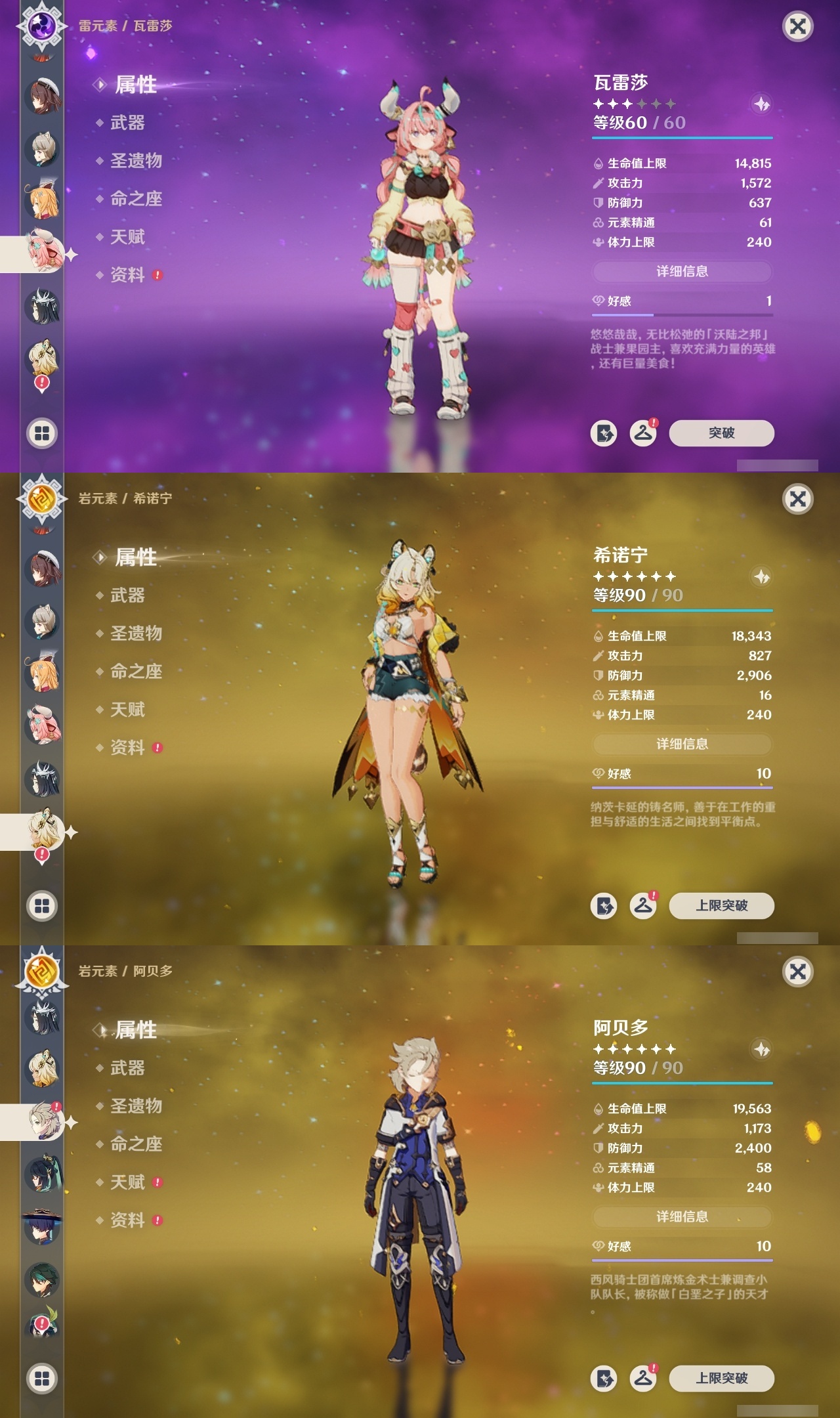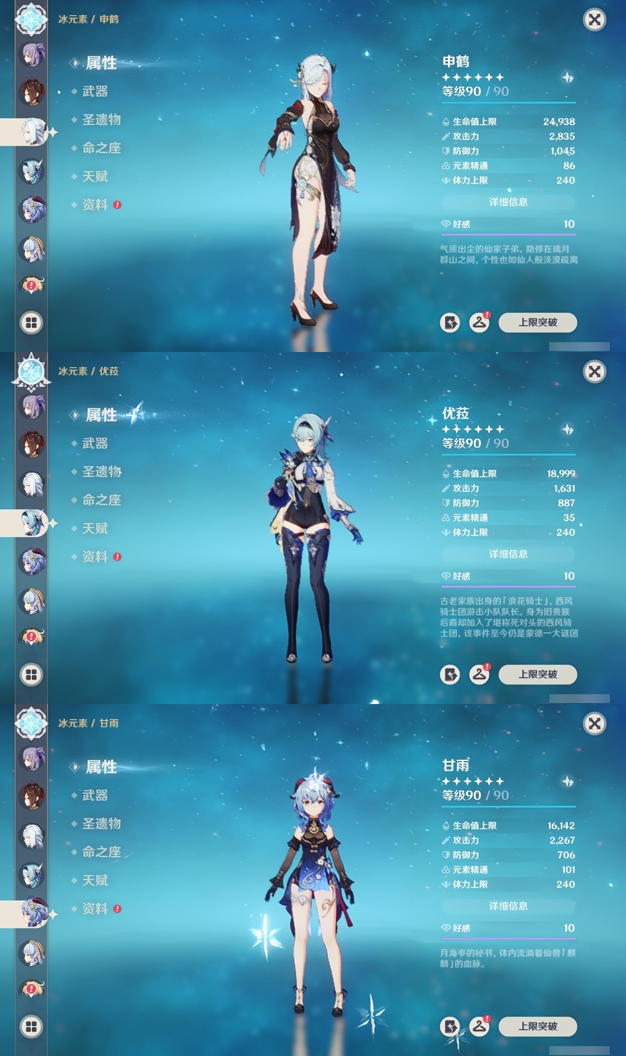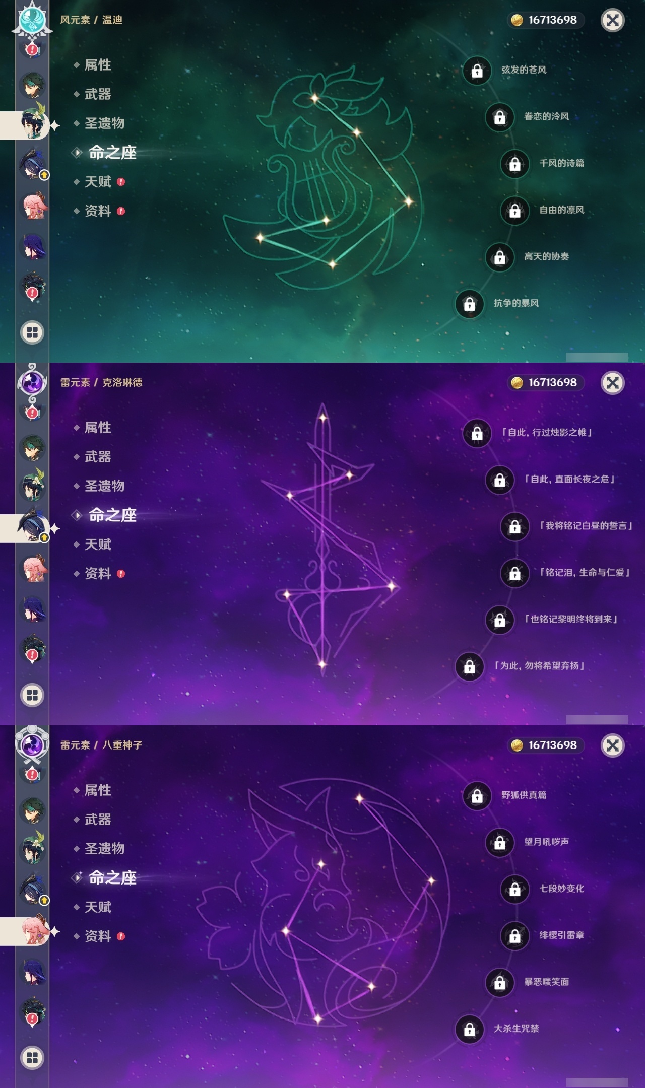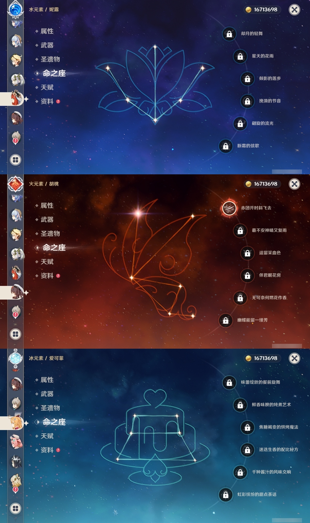 【原神】满命,冒险等级:60,五星数量:53,五星角色:刻晴 6命琴 6命纳西妲 6命莫娜 4命迪卢克 3命那维莱特 2命闲云 2命阿蕾奇诺 2命七七 2命神里绫华 2命提纳里 2命迪希雅 1命芙宁娜 1命枫原万叶 1命胡桃 1命艾梅莉埃基尼奇珊瑚宫心海希诺宁温迪玛薇卡优菈钟离申鹤瓦雷莎八重神子阿贝多夜兰千织爱可菲妮露艾尔海森流浪者甘雨魈克洛琳德雷电将军__五星武器:万世流涌大典有乐御簾切阿莫斯之弓苍古自由之誓风鹰剑和璞鸢护摩之杖狼的末路四风原典天空之傲天空之卷天空之翼雾切之回光若水千夜浮梦__四星角色:班尼特 6命行秋 6命香菱 6命久岐忍 6命鹿野院平藏 6命珐露珊 6命凝光 6命迪奥娜 6命砂糖 6命莱依拉 6命多莉 6命柯莱 6命卡维 6命芭芭拉 6命云堇 6命早柚 6命托马 6命五郎 6命烟绯 6命重云 6命辛焱 6命诺艾尔 6命罗莎莉亚 6命雷泽 6命菲谢尔 6命北斗 6命琳妮特 6命夏洛蒂 6命夏沃蕾 6命嘉明 6命绮良良 5命瑶瑶 5命坎蒂丝 5命欧洛伦 5命伊法 5命米卡 4命卡齐娜 3命九条裟罗 3命蓝砚 3命赛索斯 3命菲米尼 1命爱诺 1命埃洛伊伊安珊塔利雅