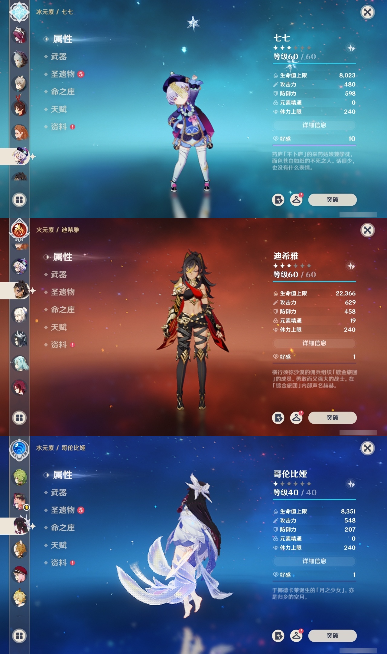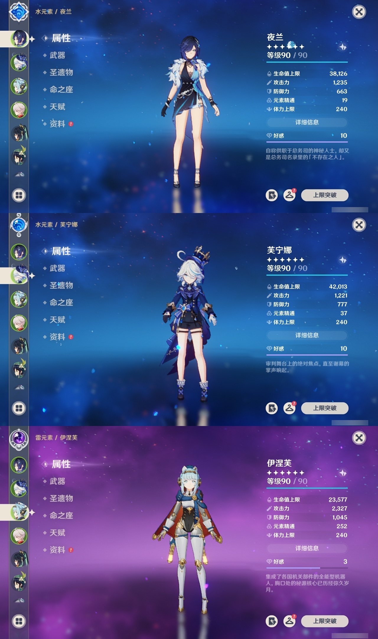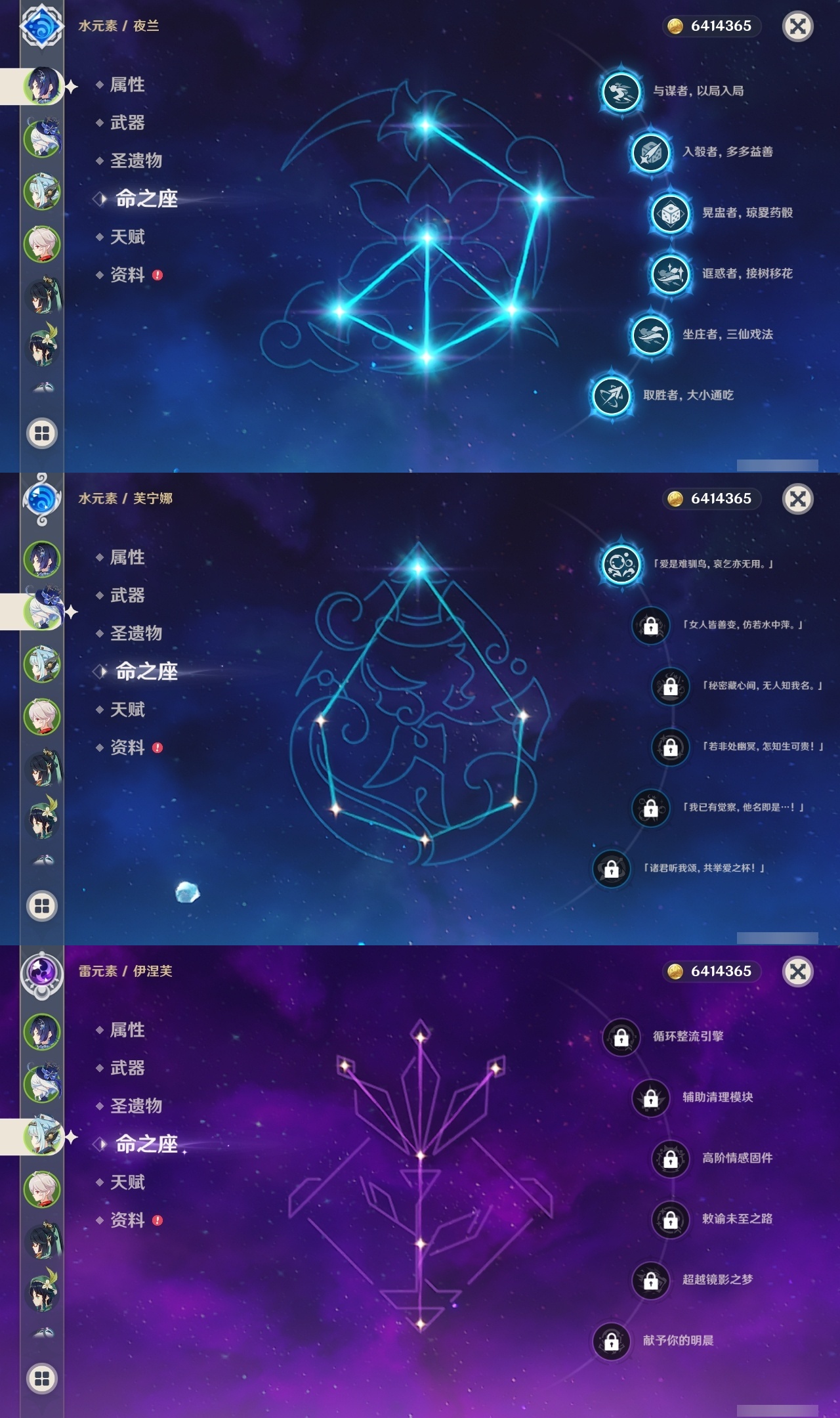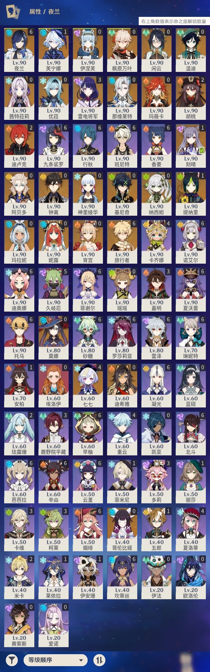 【原神】【lyys11282】冒险等级:60,五星数量:48,五星角色:夜兰 6命七七 4命雷电将军 3命迪卢克 2命胡桃 2命芙宁娜 1命刻晴 1命提纳里 1命莫娜玛拉妮基尼奇神里绫华温迪玛薇卡茜特菈莉宵宫优菈迪希雅钟离阿贝多那维莱特闲云妮露伊涅芙纳西妲哥伦比娅枫原万叶__五星武器:天空之脊 3精星鹫赤羽祭星者之望万世流涌大典飞雷之弦振风鹰剑和璞鸢护摩之杖狼的末路磐岩结绿四风原典天空之傲天空之卷天空之翼雾切之回光薙草之稻光终末嗟叹之诗贯虹之槊若水圣显之钥__四星角色:班尼特 6命行秋 6命九条裟罗 6命香菱 6命凝光 6命迪奥娜 6命砂糖 6命坎蒂丝 6命芭芭拉 6命云堇 6命早柚 6命托马 6命烟绯 6命辛焱 6命诺艾尔 6命罗莎莉亚 6命雷泽 6命菲谢尔 6命北斗 6命琳妮特 6命夏沃蕾 6命久岐忍 5命卡齐娜 4命重云 4命夏洛蒂 4命鹿野院平藏 3命多莉 3命柯莱 3命卡维 3命嘉明 3命珐露珊 2命米卡 2命莱依拉 1命五郎 1命菲米尼 1命伊安珊 1命埃洛伊瑶瑶欧洛伦蓝砚伊法爱诺赛索斯