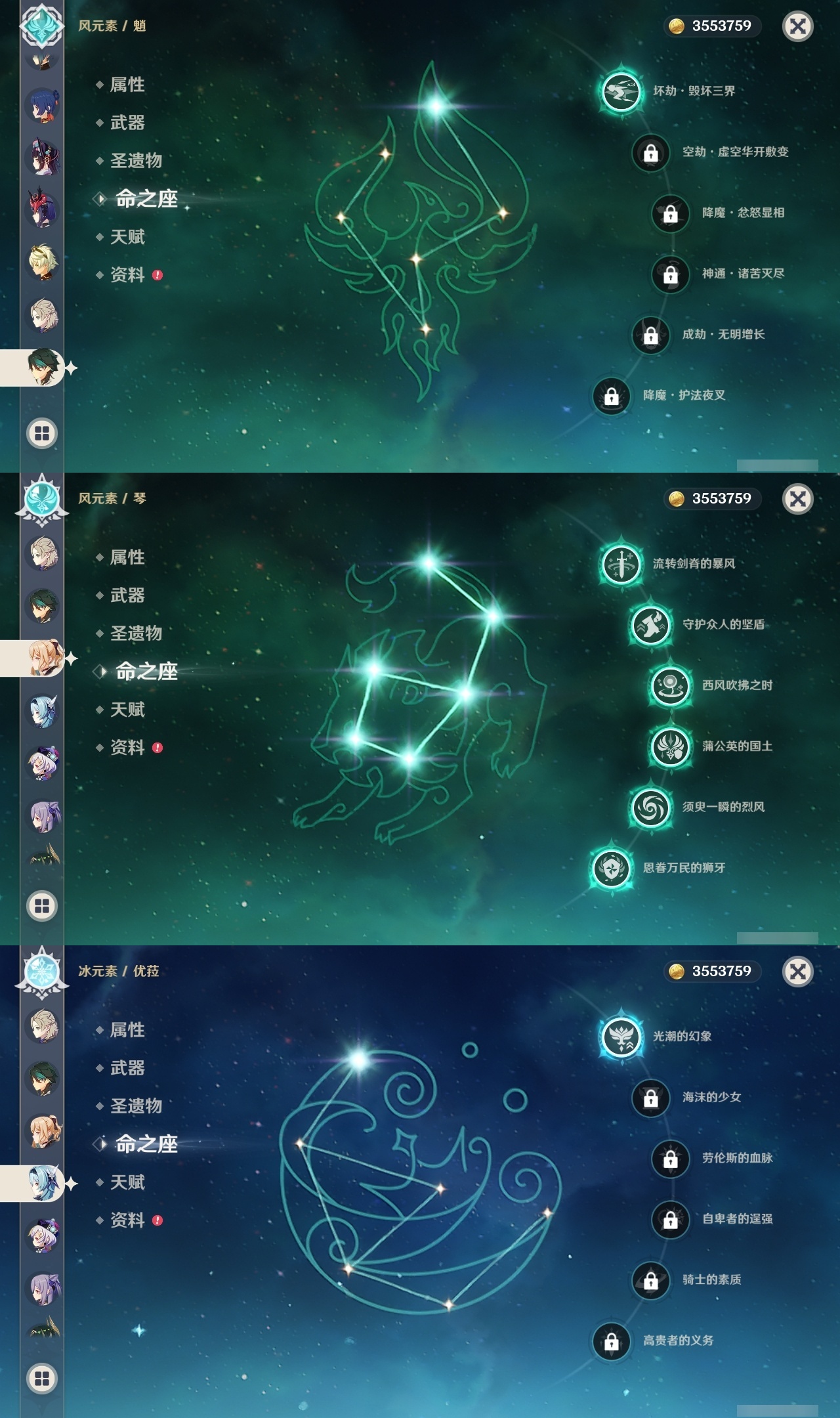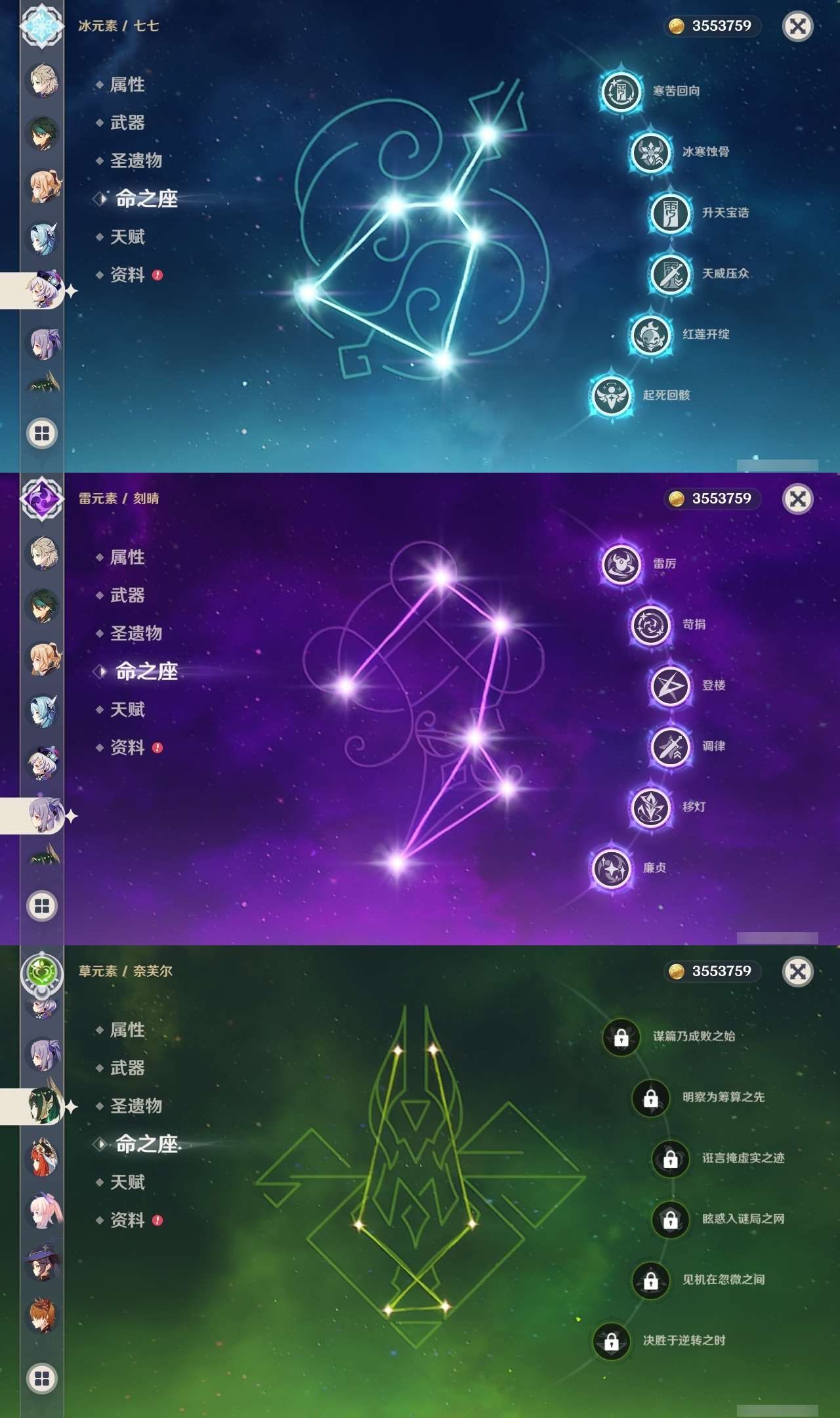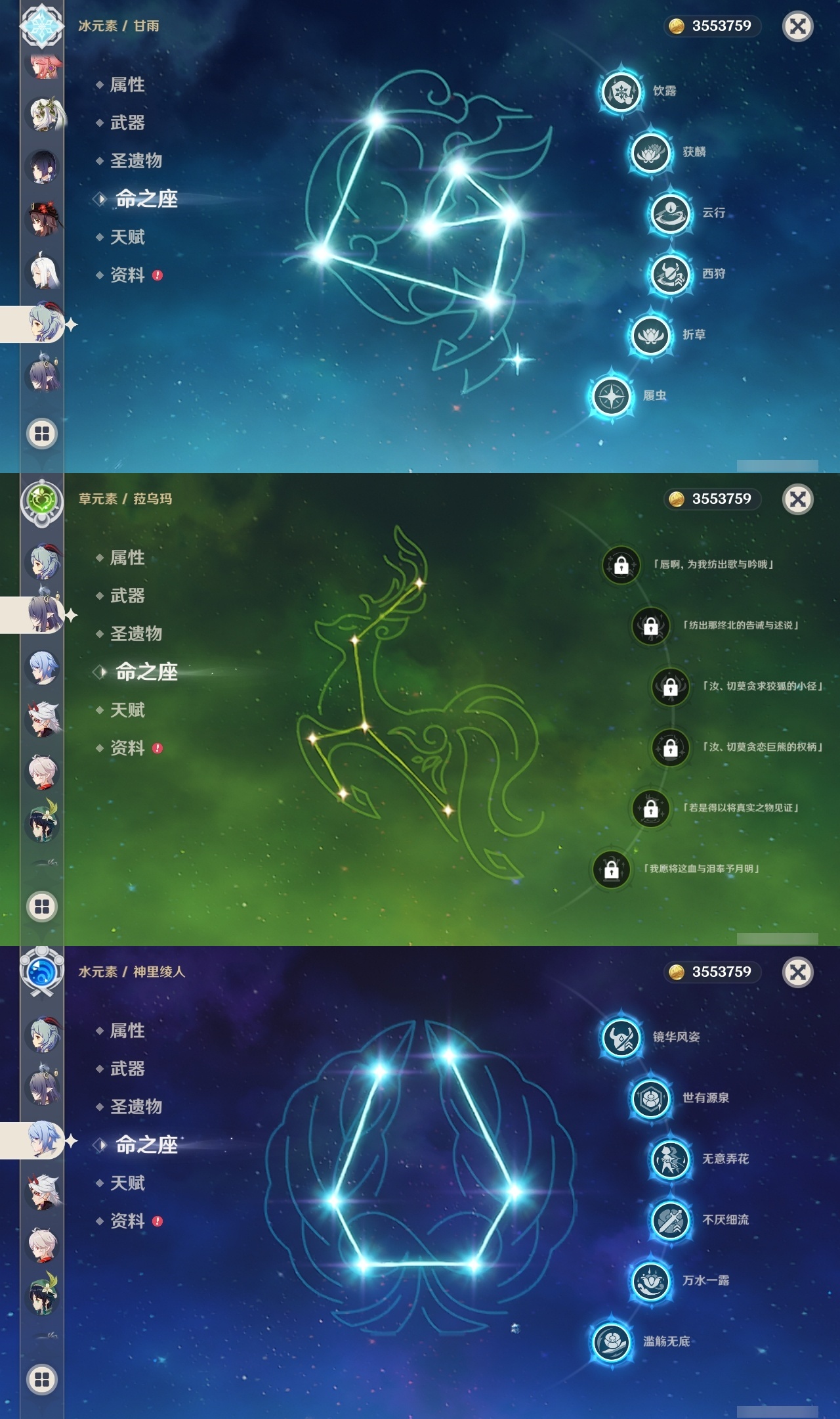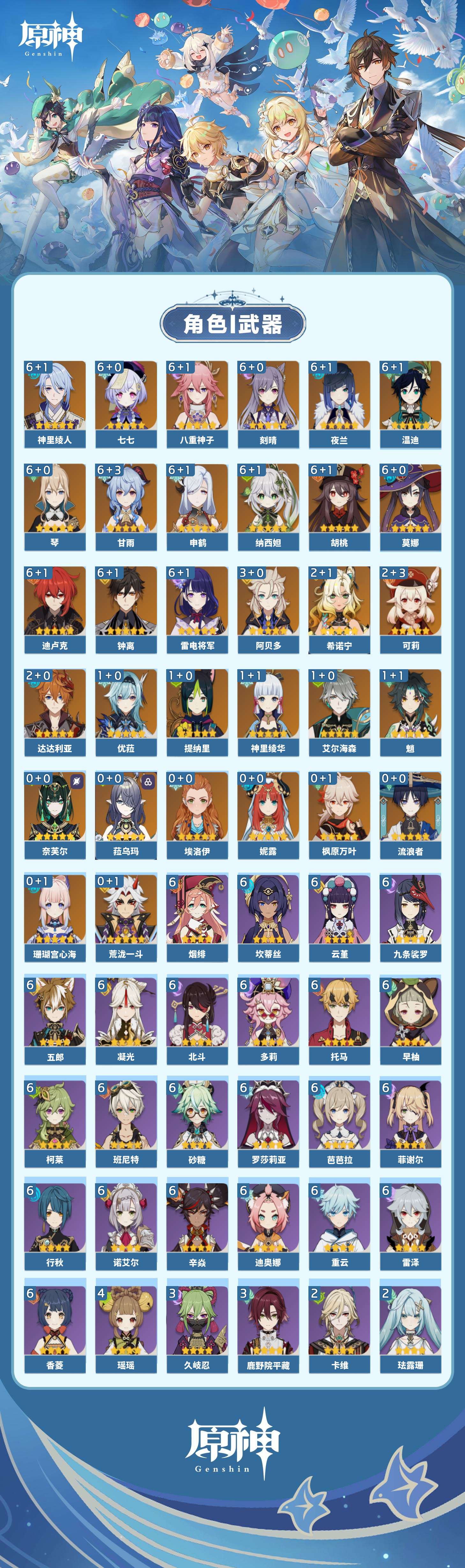 【原神】5满命,冒险等级:60,五星数量:61,五星角色:迪卢克 6命甘雨 6命胡桃 6命刻晴 6命雷电将军 6命莫娜 6命七七 6命琴 6命温迪 6命钟离 6命申鹤 6命八重神子 6命神里绫人 6命夜兰 6命纳西妲 6命阿贝多 3命希诺宁 2命达达利亚 2命可莉 2命魈 1命神里绫华 1命优菈 1命提纳里 1命艾尔海森 1命珊瑚宫心海荒泷一斗妮露菈乌玛奈芙尔流浪者枫原万叶__五星武器:阿莫斯之弓 3精四风原典 3精岩峰巡歌有乐御簾切黑蚀不灭月华苍古自由之誓尘世之锁风鹰剑和璞鸢护摩之杖狼的末路磐岩结绿天空之傲天空之脊天空之刃天空之翼无工之剑雾切之回光薙草之稻光终末嗟叹之诗赤角石溃杵息灾神乐之真意贯虹之槊波乱月白经津若水千夜浮梦__四星角色:班尼特 6命行秋 6命九条裟罗 6命香菱 6命凝光 6命迪奥娜 6命砂糖 6命坎蒂丝 6命多莉 6命柯莱 6命芭芭拉 6命云堇 6命早柚 6命托马 6命五郎 6命烟绯 6命重云 6命辛焱 6命诺艾尔 6命罗莎莉亚 6命雷泽 6命菲谢尔 6命北斗 6命瑶瑶 4命久岐忍 3命鹿野院平藏 3命珐露珊 2命卡维 2命莱依拉 1命伊法 1命爱诺 1命赛索斯 1命埃洛伊奇偶·女性卡齐娜绮良良菲米尼琳妮特塔利雅