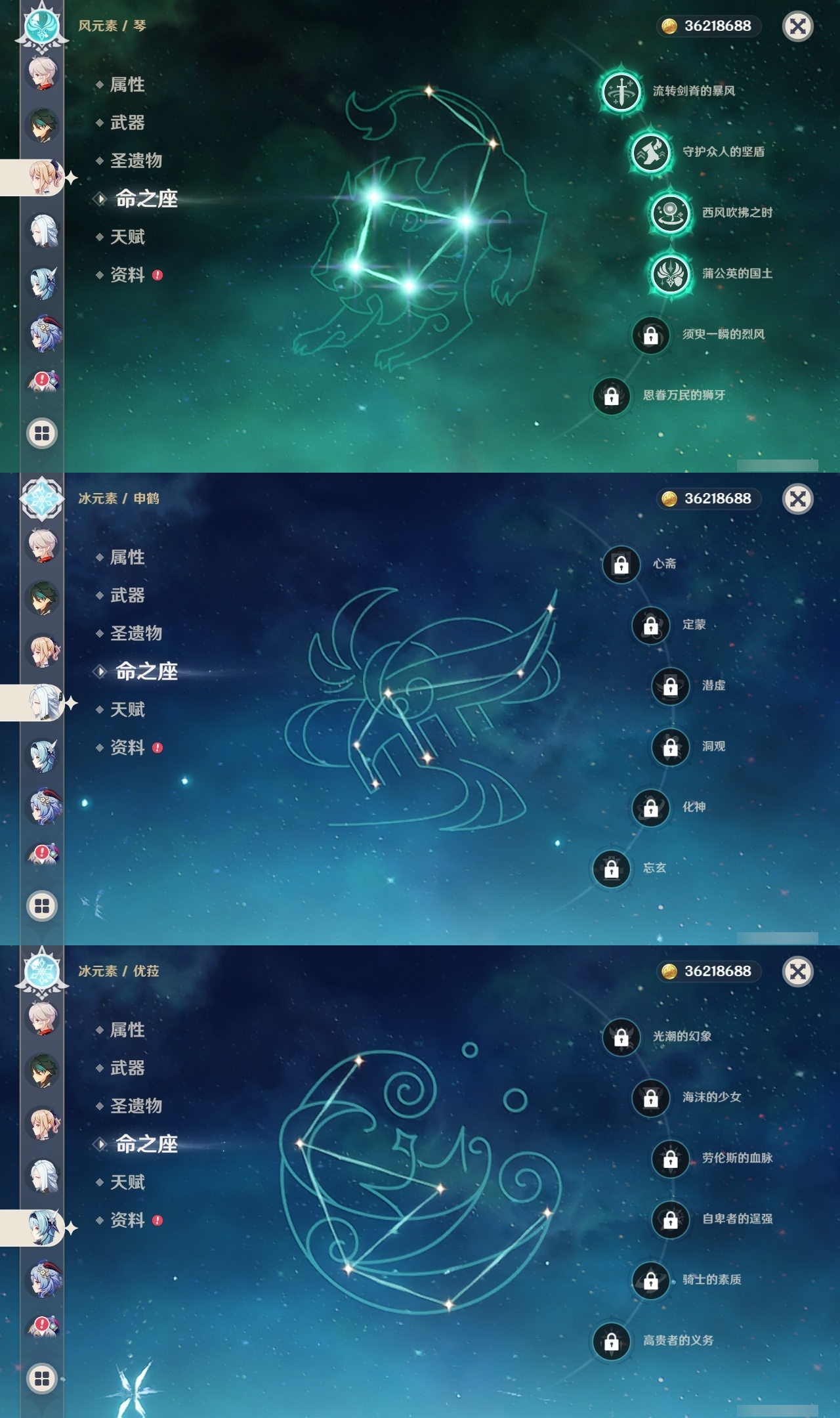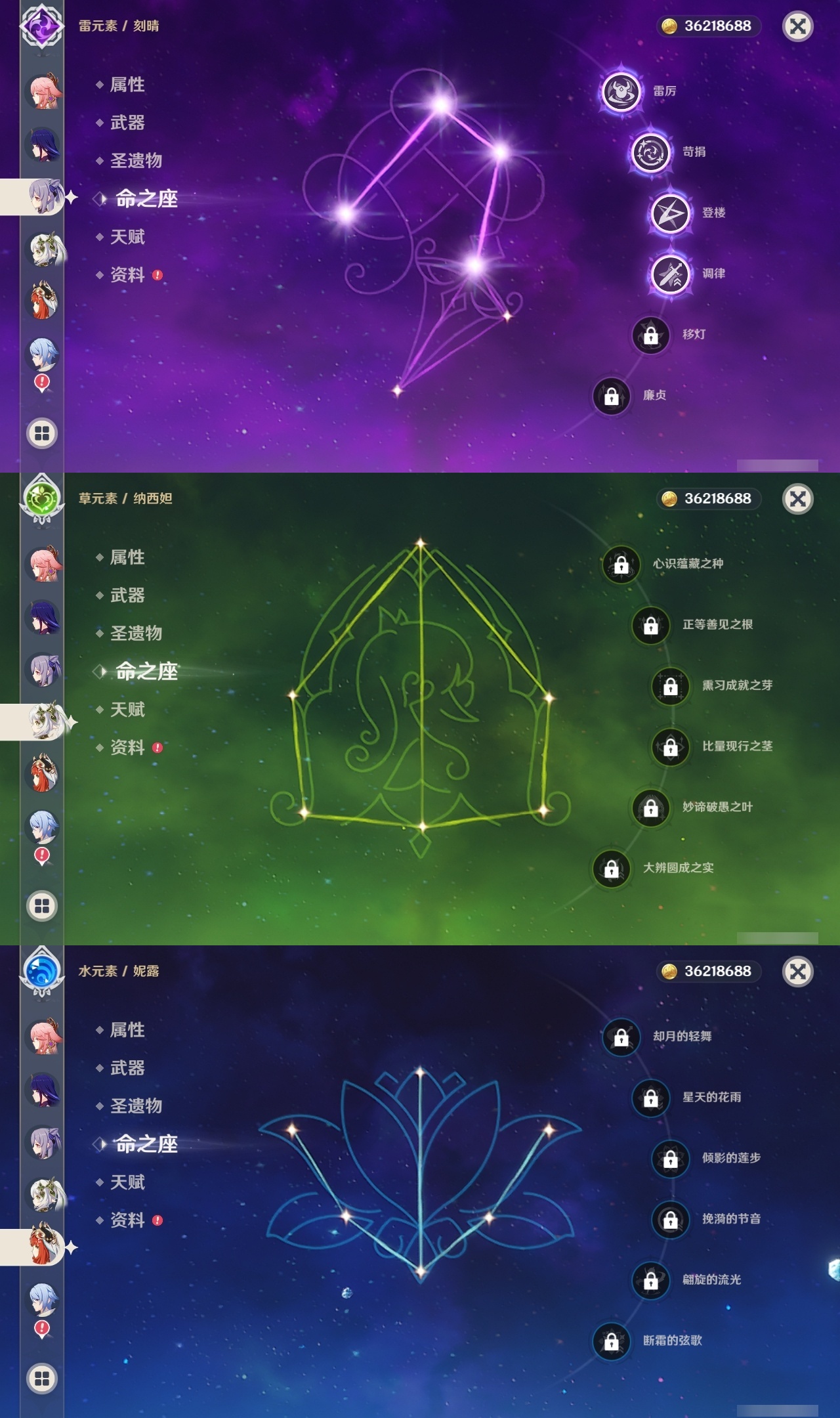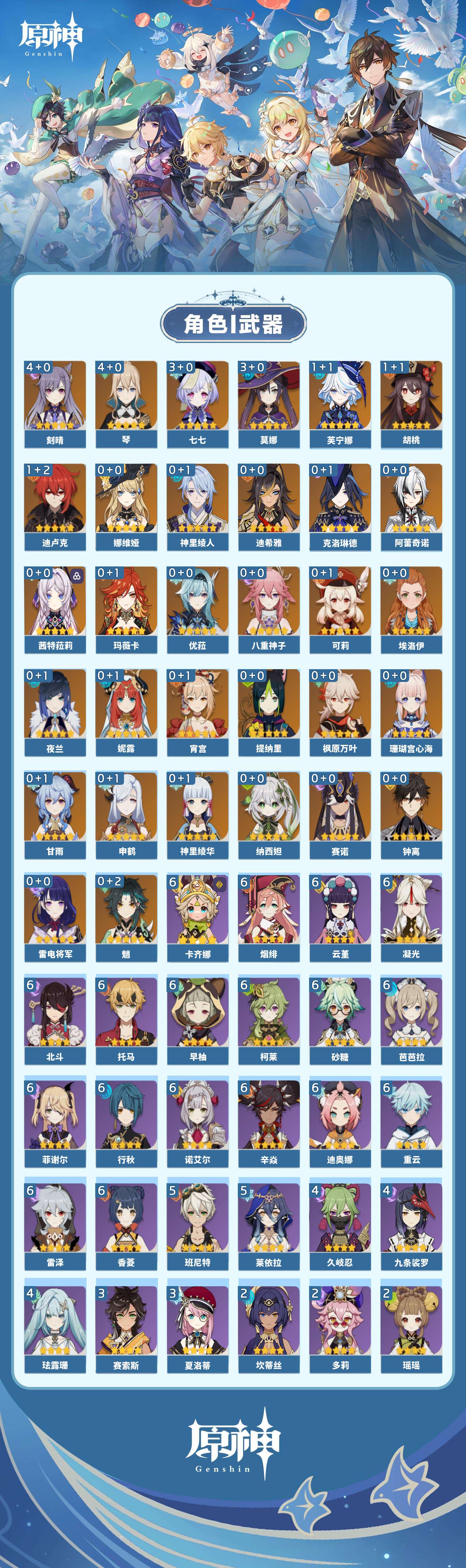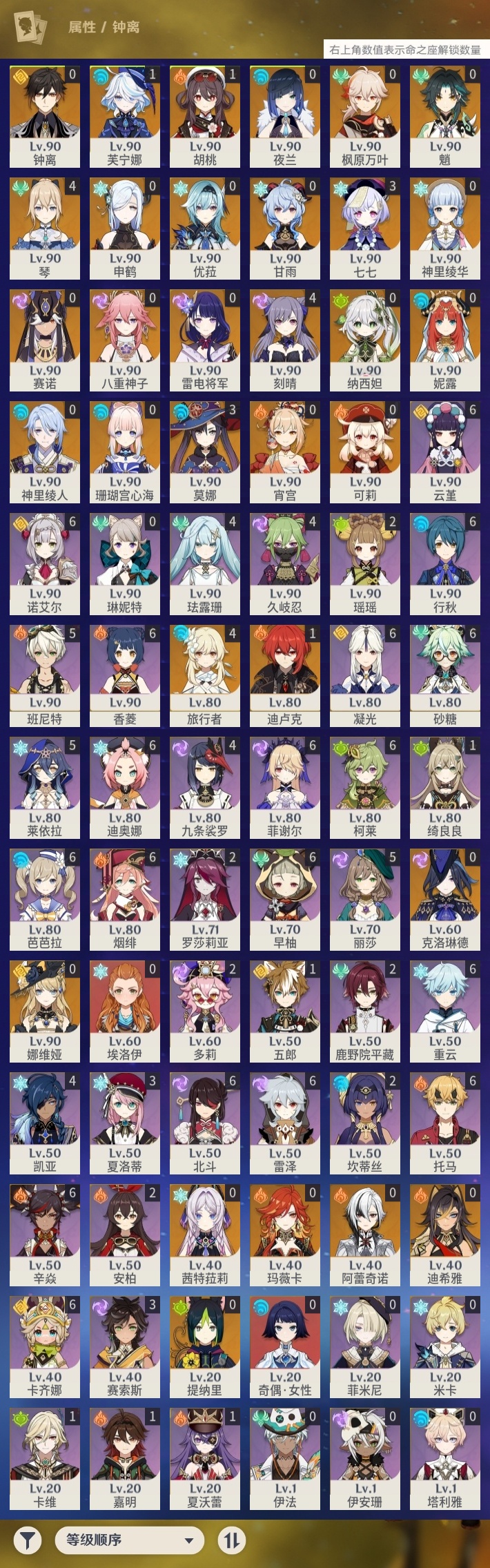 【原神】【lyys11285】冒险等级:60,五星数量:52,五星角色:刻晴 4命琴 4命莫娜 3命七七 3命芙宁娜 1命迪卢克 1命胡桃 1命珊瑚宫心海神里绫华玛薇卡茜特菈莉宵宫优菈迪希雅钟离申鹤八重神子神里绫人夜兰娜维娅提纳里赛诺阿蕾奇诺妮露纳西妲枫原万叶甘雨魈克洛琳德可莉雷电将军__五星武器:天空之翼 4精和璞鸢 2精狼的末路 2精碧落之珑焚曜千阳静水流涌之辉阿莫斯之弓飞雷之弦振风鹰剑护摩之杖四风原典天空之卷雾切之回光斫峰之刃息灾波乱月白经津若水圣显之钥赦罪__四星角色:卡齐娜 6命行秋 6命香菱 6命凝光 6命迪奥娜 6命砂糖 6命柯莱 6命芭芭拉 6命云堇 6命早柚 6命托马 6命烟绯 6命重云 6命辛焱 6命诺艾尔 6命雷泽 6命菲谢尔 6命北斗 6命班尼特 5命莱依拉 5命九条裟罗 4命久岐忍 4命珐露珊 4命夏洛蒂 3命赛索斯 3命鹿野院平藏 2命瑶瑶 2命坎蒂丝 2命多莉 2命罗莎莉亚 2命绮良良 1命卡维 1命五郎 1命夏沃蕾 1命嘉明 1命埃洛伊奇偶·女性米卡菲米尼琳妮特伊法伊安珊塔利雅