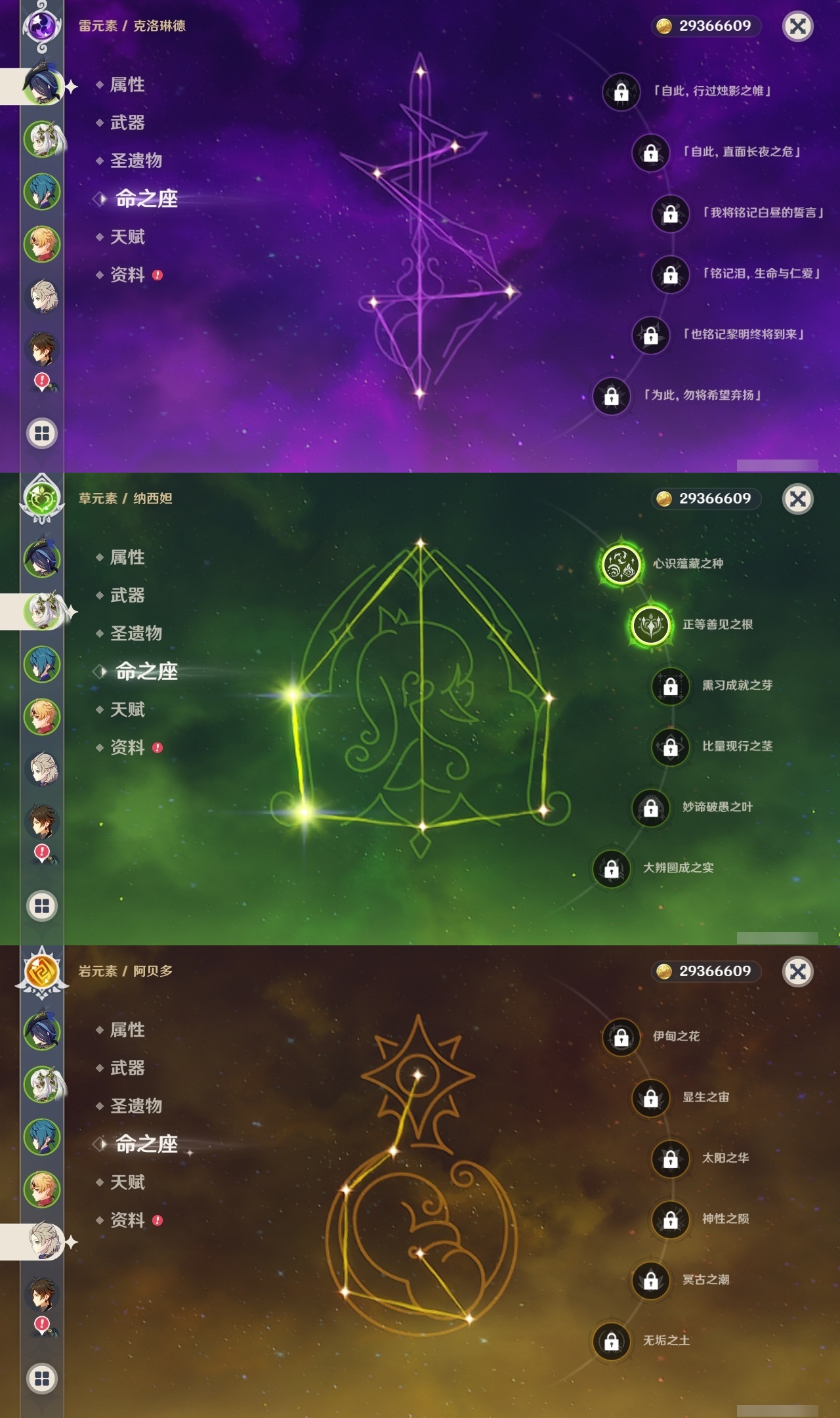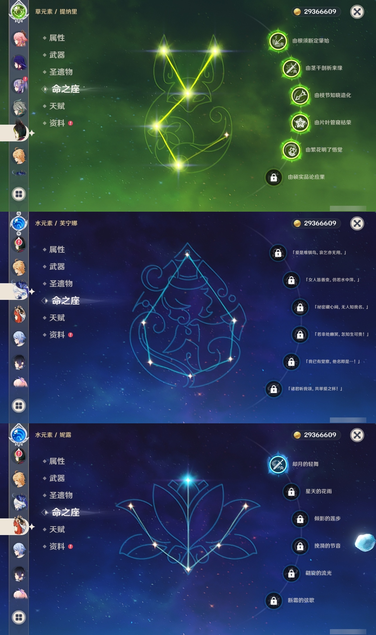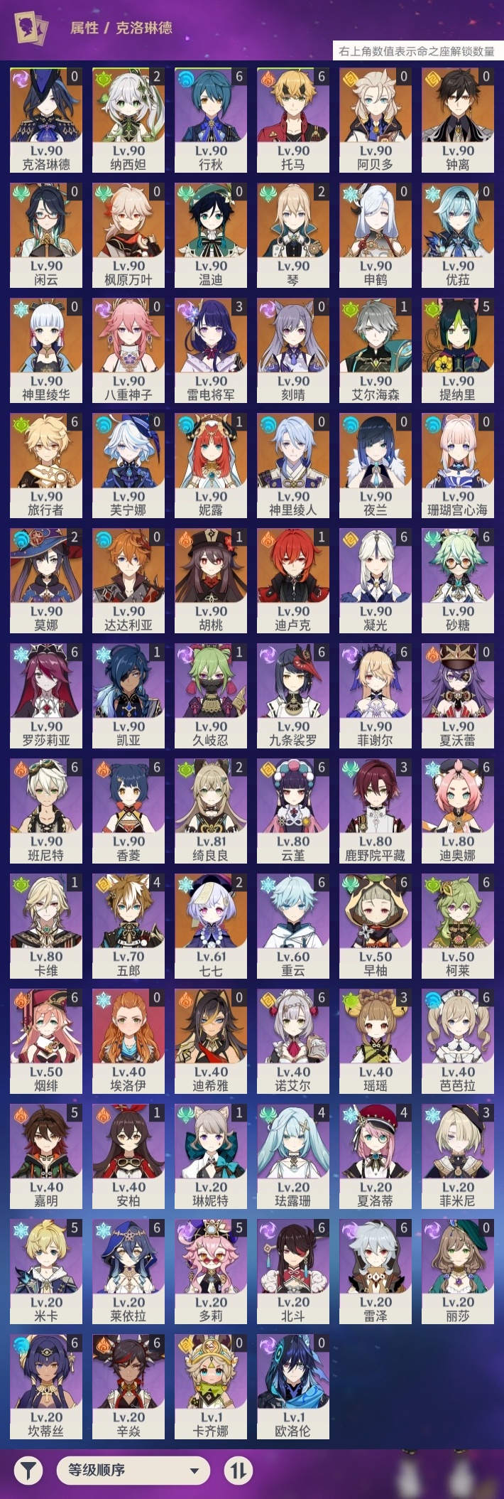 【原神】【lyys11291】冒险等级:60,五星数量:51,五星角色:提纳里 5命雷电将军 3命莫娜 2命七七 2命琴 2命纳西妲 2命迪卢克 1命胡桃 1命妮露 1命艾尔海森 1命珊瑚宫心海神里绫华温迪优菈迪希雅钟离达达利亚申鹤八重神子神里绫人阿贝多夜兰芙宁娜闲云枫原万叶克洛琳德刻晴__五星武器:碧落之珑静水流涌之辉裁叶萃光尘世之锁飞雷之弦振风鹰剑护摩之杖磐岩结绿四风原典松籁响起之时天空之傲天空之脊天空之刃天空之翼无工之剑雾切之回光薙草之稻光终末嗟叹之诗神乐之真意波乱月白经津猎人之径圣显之钥千夜浮梦__四星角色:班尼特 6命行秋 6命九条裟罗 6命香菱 6命凝光 6命迪奥娜 6命砂糖 6命莱依拉 6命坎蒂丝 6命柯莱 6命芭芭拉 6命云堇 6命早柚 6命托马 6命烟绯 6命重云 6命辛焱 6命诺艾尔 6命罗莎莉亚 6命雷泽 6命菲谢尔 6命北斗 6命米卡 5命多莉 5命嘉明 5命珐露珊 4命五郎 4命夏洛蒂 4命鹿野院平藏 3命瑶瑶 3命菲米尼 3命绮良良 2命久岐忍 1命卡维 1命琳妮特 1命埃洛伊卡齐娜欧洛伦夏沃蕾