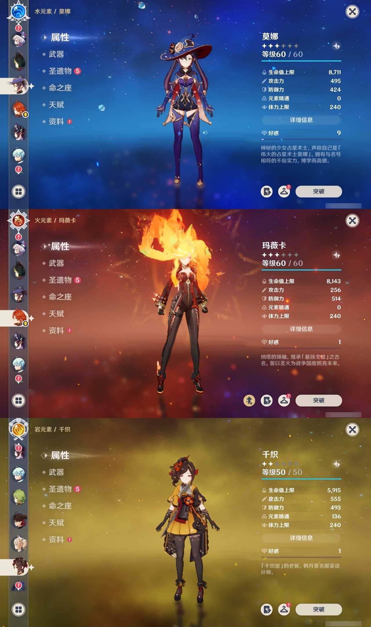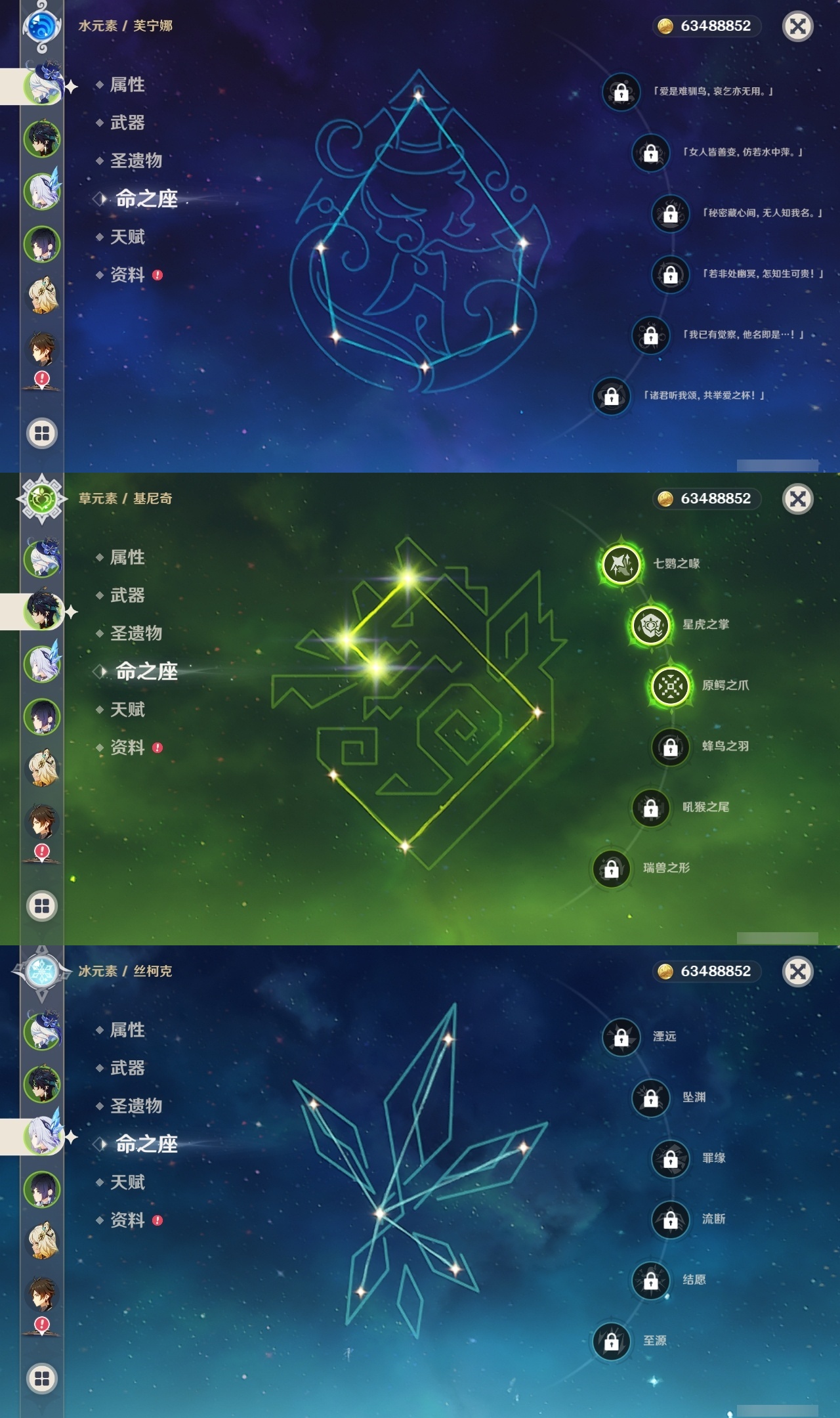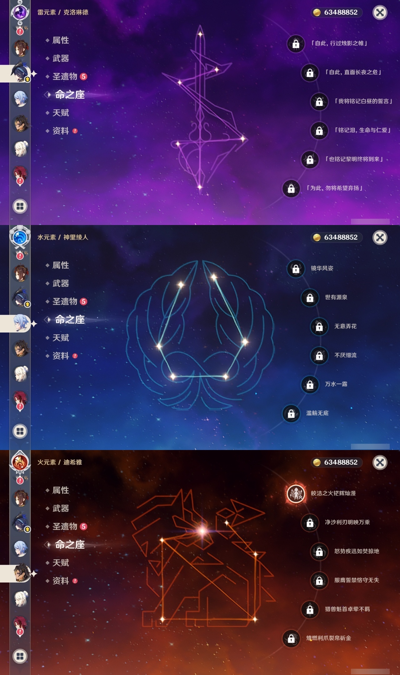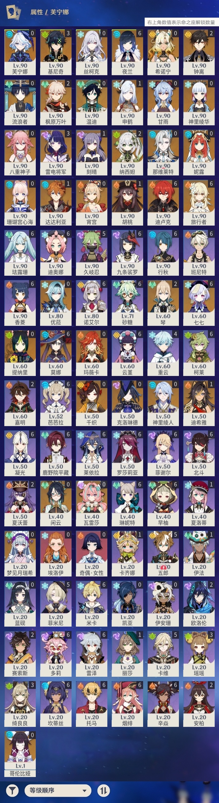 【原神】满命,冒险等级:60,五星数量:60,五星角色:迪卢克 6命莫娜 6命七七 6命夜兰 6命基尼奇 3命雷电将军 3命枫原万叶 2命琴 2命钟离 2命纳西妲 2命迪希雅 1命达达利亚 1命胡桃 1命刻晴 1命申鹤 1命珊瑚宫心海希诺宁神里绫华温迪玛薇卡宵宫优菈梦见月瑞希瓦雷莎八重神子神里绫人那维莱特芙宁娜提纳里闲云千织丝柯克妮露流浪者哥伦比娅甘雨克洛琳德__五星武器:若水 5精千夜浮梦 2精山王长牙岩峰巡歌苍耀阿莫斯之弓苍古自由之誓飞雷之弦振风鹰剑和璞鸢护摩之杖狼的末路四风原典天空之卷天空之刃天空之翼雾切之回光薙草之稻光贯虹之槊猎人之径圣显之钥__四星角色:班尼特 6命行秋 6命九条裟罗 6命香菱 6命鹿野院平藏 6命珐露珊 6命凝光 6命迪奥娜 6命砂糖 6命莱依拉 6命米卡 6命坎蒂丝 6命多莉 6命柯莱 6命芭芭拉 6命云堇 6命早柚 6命托马 6命烟绯 6命辛焱 6命诺艾尔 6命罗莎莉亚 6命雷泽 6命菲谢尔 6命北斗 6命琳妮特 6命久岐忍 5命卡维 5命五郎 5命菲米尼 5命重云 4命绮良良 3命瑶瑶 3命欧洛伦 2命夏沃蕾 2命嘉明 2命赛索斯 2命卡齐娜 1命夏洛蒂 1命伊法 1命埃洛伊奇偶·女性蓝砚伊安珊多个哥伦