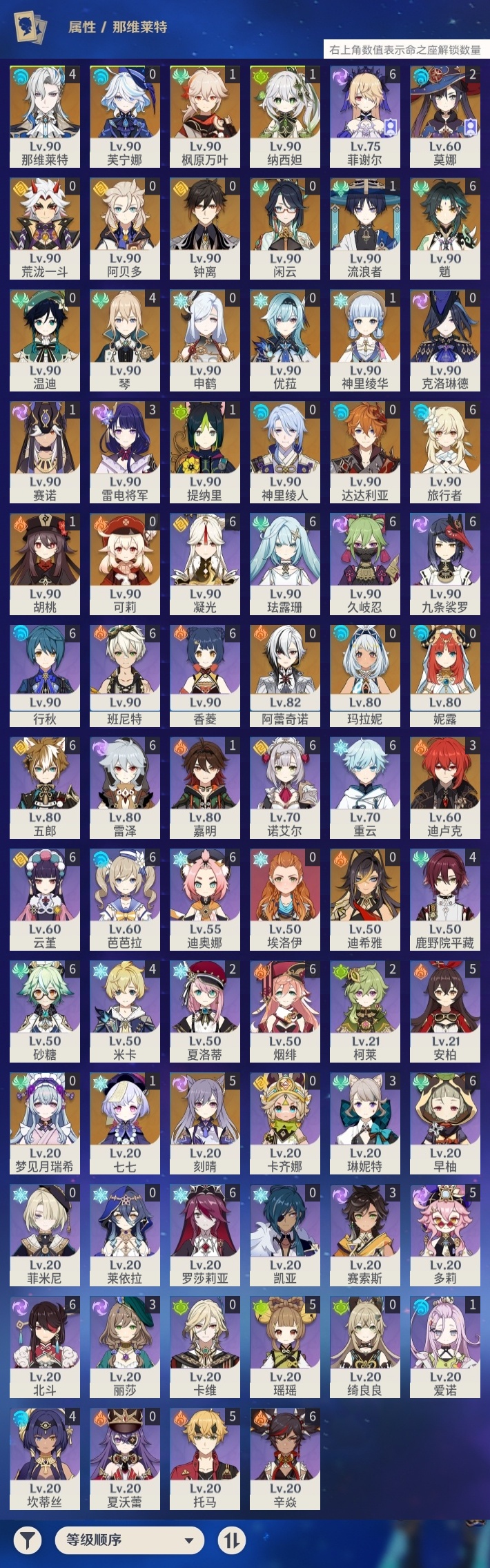 【原神】【lyys11273】冒险等级:60,五星数量:48,五星角色:魈 6命刻晴 5命那维莱特 4命琴 4命迪卢克 3命雷电将军 3命莫娜 2命枫原万叶 1命胡桃 1命七七 1命神里绫华 1命提纳里 1命赛诺 1命纳西妲 1命流浪者 1命玛拉妮温迪优菈迪希雅钟离荒泷一斗达达利亚梦见月瑞希申鹤神里绫人阿贝多芙宁娜闲云阿蕾奇诺妮露克洛琳德可莉__五星武器:万世流涌大典赤月之形图莱杜拉的回忆阿莫斯之弓和璞鸢护摩之杖狼的末路天空之傲天空之脊无工之剑雾切之回光薙草之稻光赤角石溃杵千夜浮梦白雨心弦__四星角色:班尼特 6命行秋 6命九条裟罗 6命香菱 6命久岐忍 6命珐露珊 6命凝光 6命迪奥娜 6命砂糖 6命芭芭拉 6命云堇 6命早柚 6命五郎 6命烟绯 6命重云 6命辛焱 6命诺艾尔 6命罗莎莉亚 6命雷泽 6命菲谢尔 6命北斗 6命瑶瑶 5命多莉 5命托马 5命鹿野院平藏 4命米卡 4命坎蒂丝 4命琳妮特 3命赛索斯 3命柯莱 2命夏洛蒂 2命嘉明 1命爱诺 1命埃洛伊卡齐娜绮良良莱依拉卡维菲米尼夏沃蕾