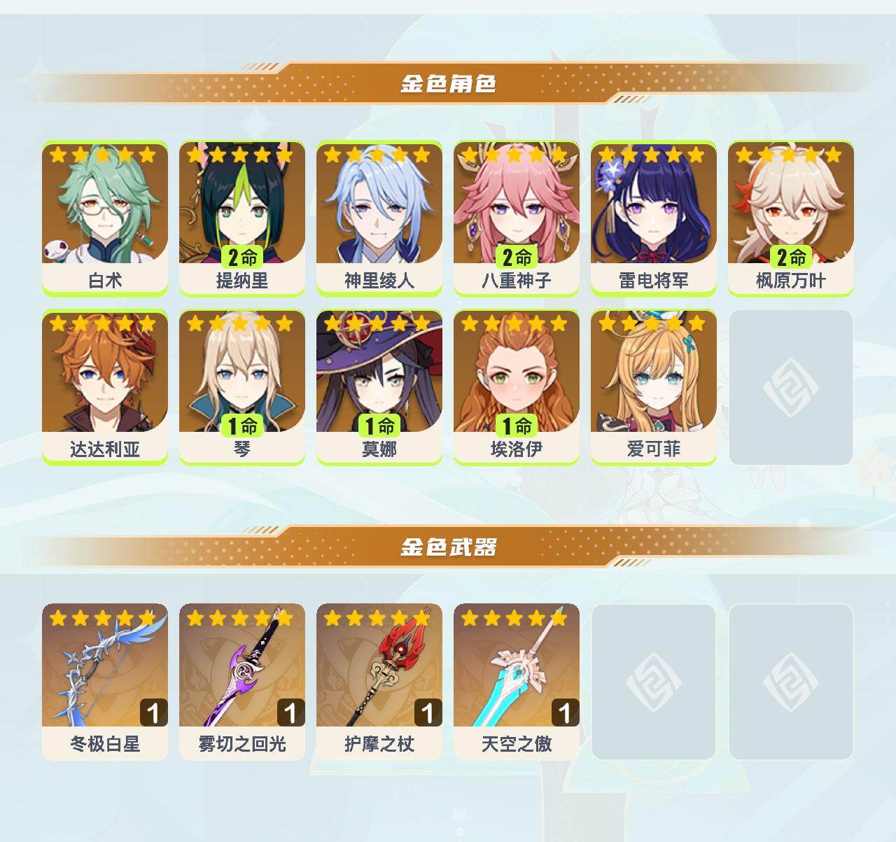 【ysn2311】56级/24黄/女主/11个五星角色/5个五星武器/2命枫原万叶/0命达达利亚/2命提纳里/0命神里绫人/2命八重神子/0命雷电将军/0命白术/1命莫娜/1命琴/0命埃洛伊/0命爱可菲/精1冬极白星/精1护摩之杖/精1雾切之回光/精1天空之傲