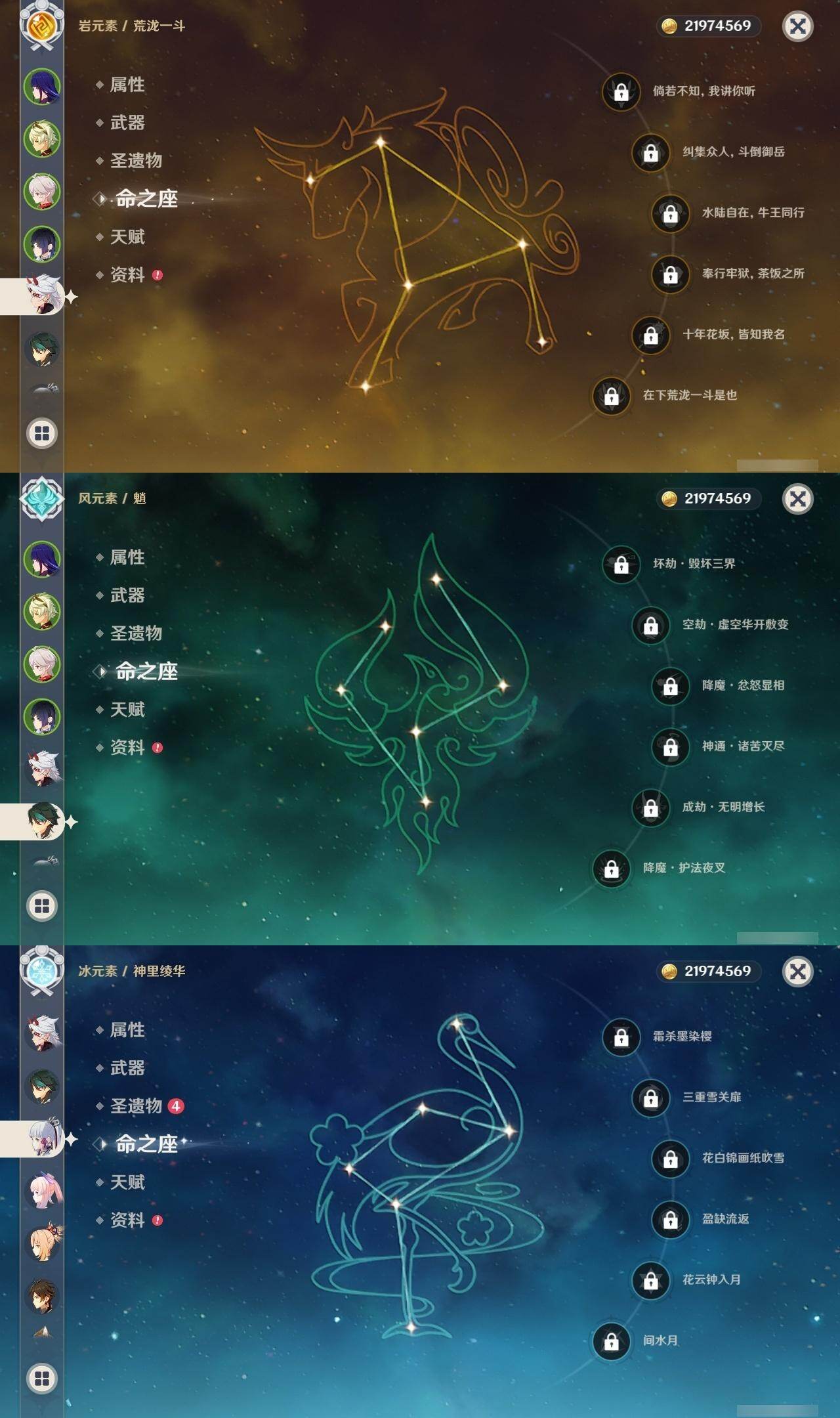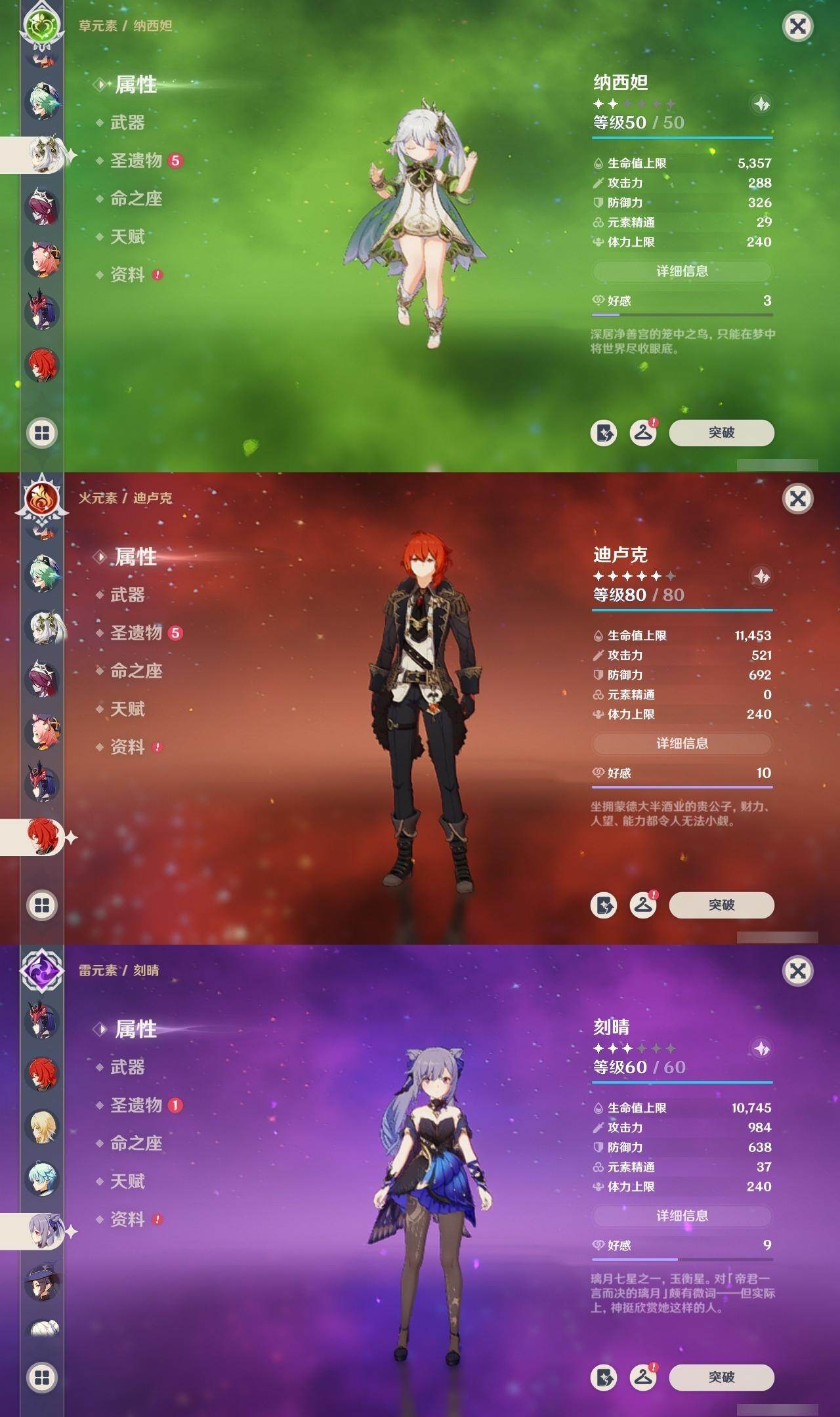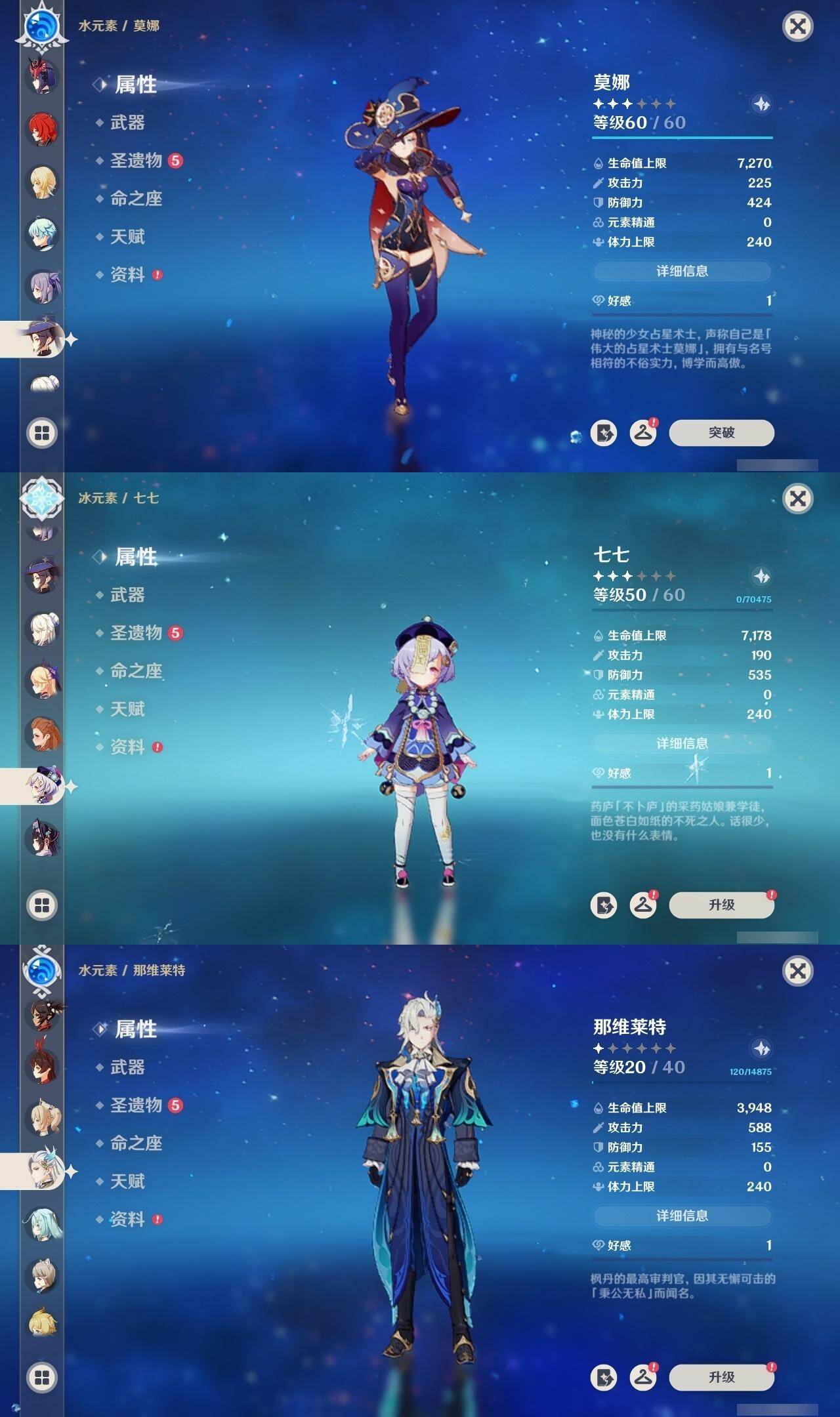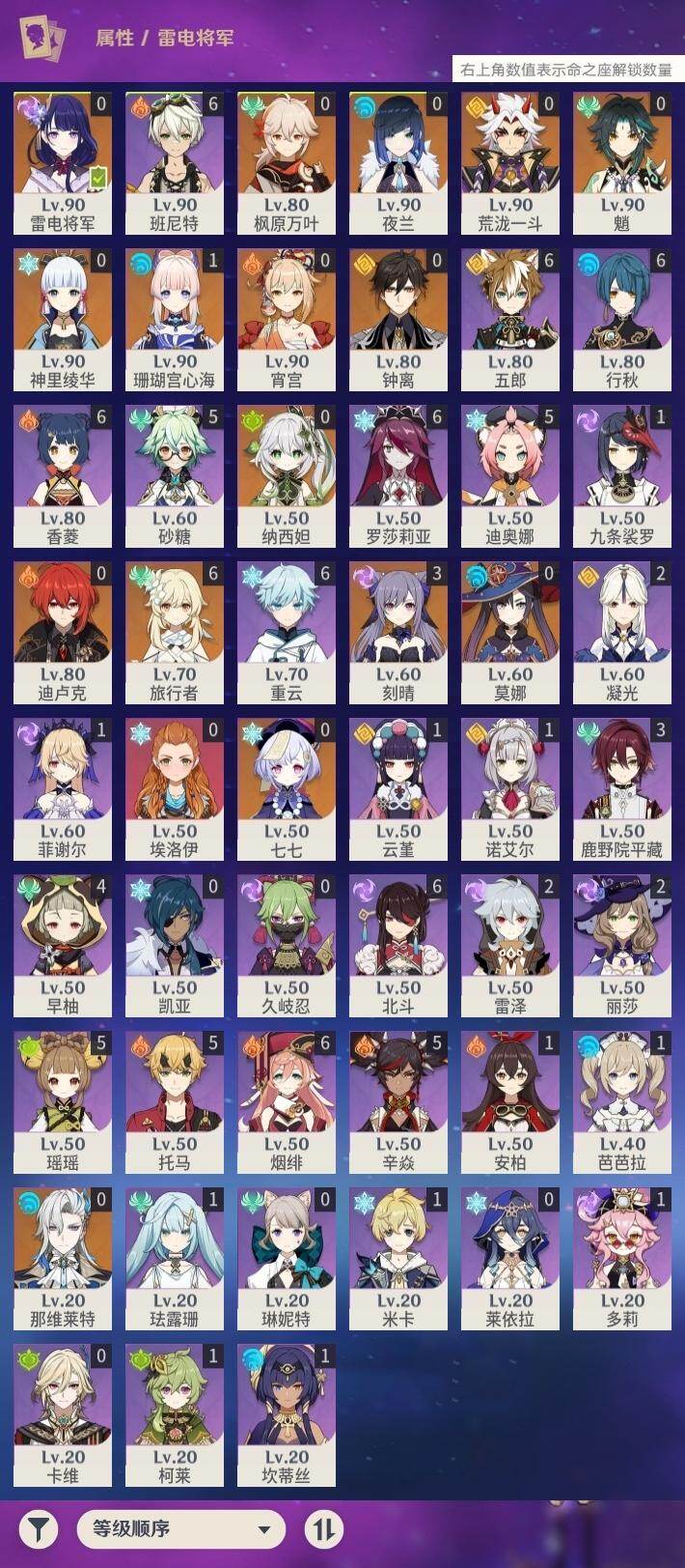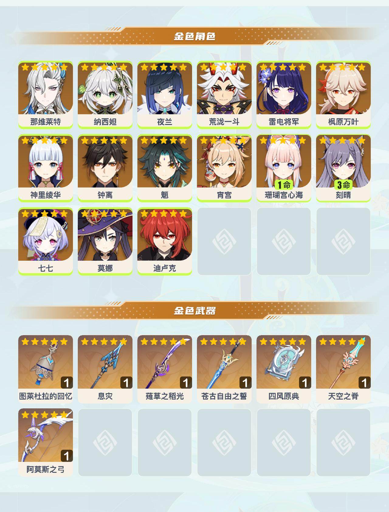 57级/26黄/女主/15个五星角色/7个五星武器 0命那维莱特0命纳西妲0命夜兰0命荒泷一斗0命雷电将军0命枫原万叶0命神里绫华0命钟离0命魈0命宵宫1命珊瑚宫心海3命刻晴0命七七0命莫娜0命迪卢克精1图莱杜拉的回忆精1息灾精1薙草之稻光精1苍古自由之誓精1四风原典精1天空之脊精1阿莫斯之弓