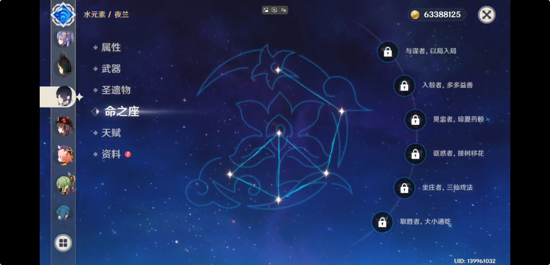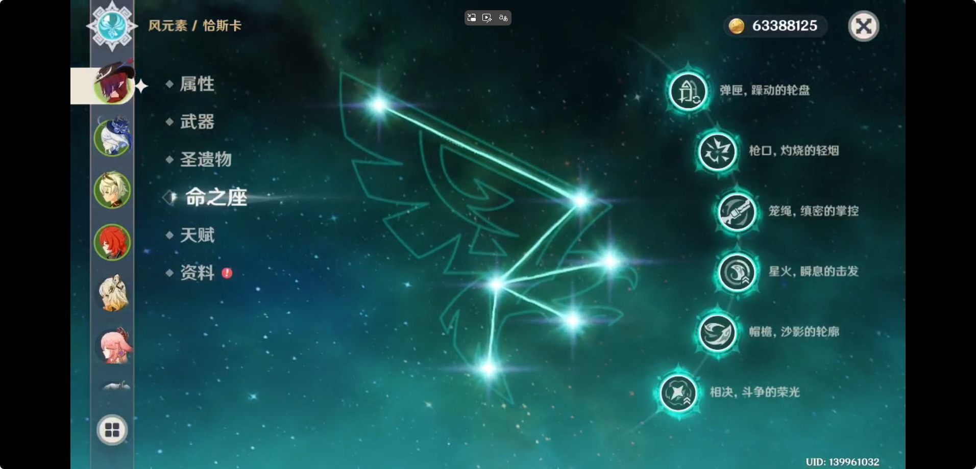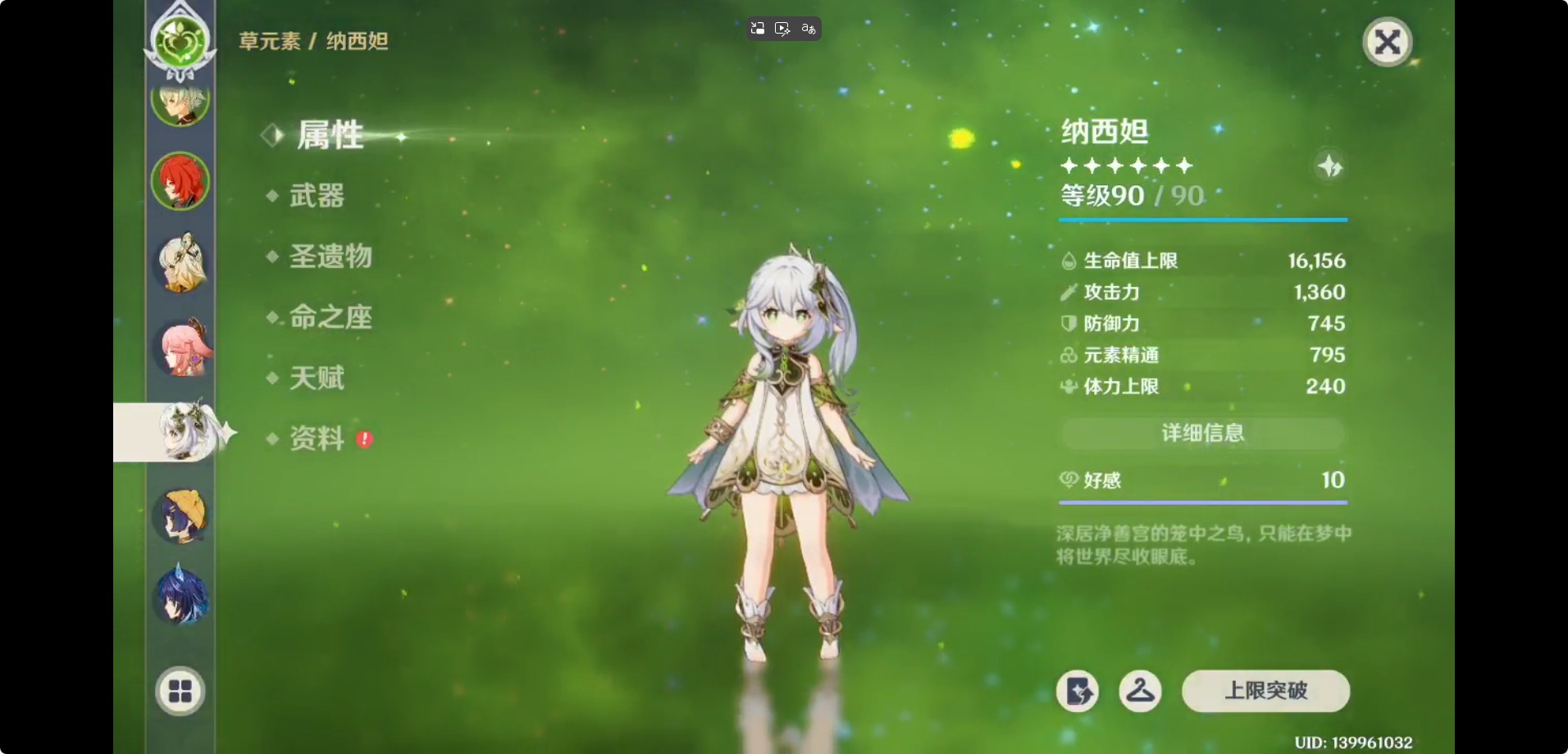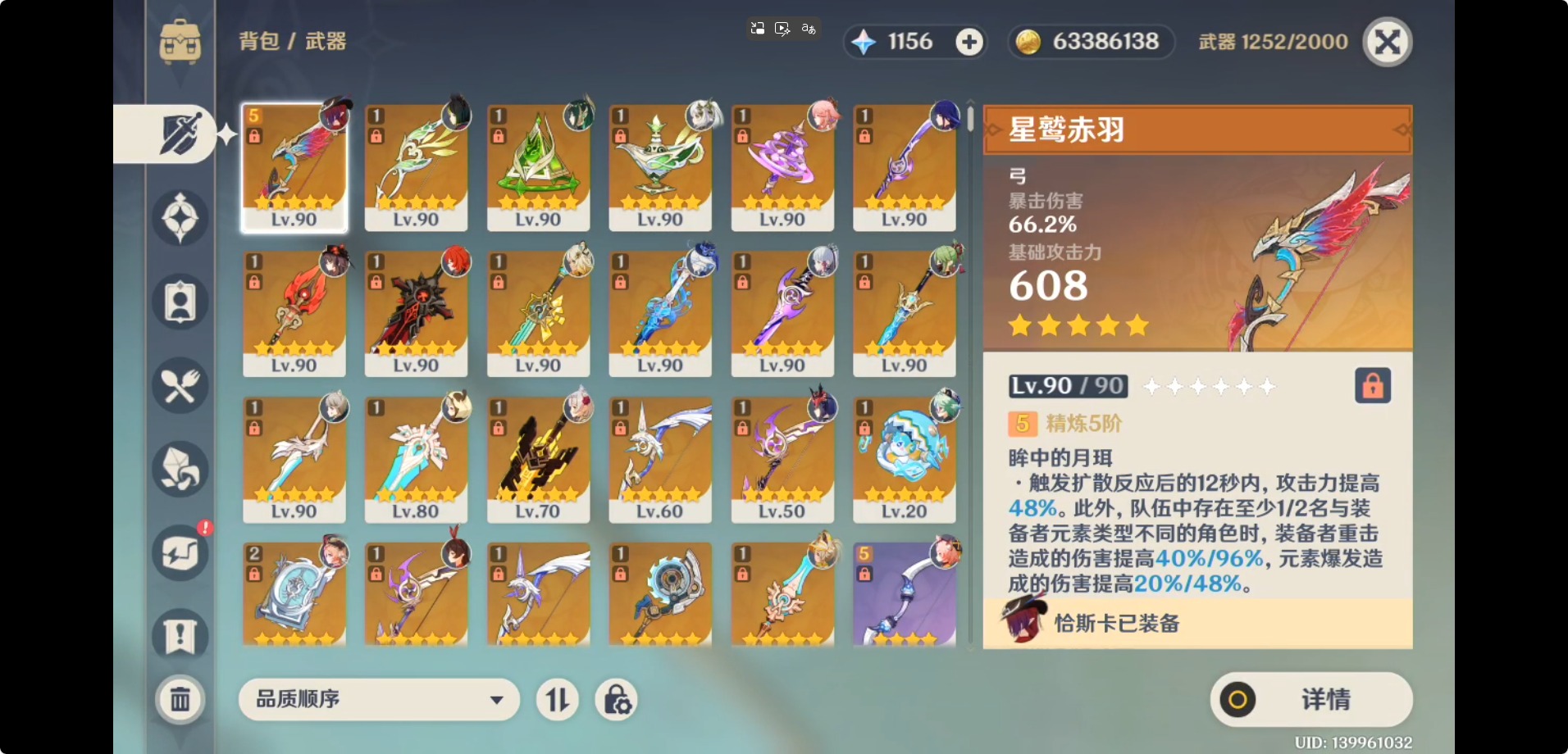 [16280595]【邮箱】不送邮/死邮 【总黄数】83 【冒险等级】60 【6命金色角色】满命恰斯卡满命芙宁娜满命纳西妲满命七七 【4命金色角色】四命八重神子四命提纳里 【3命金色角色】三命琴三命莫娜 【2命金色角色】二命希诺宁二命迪卢克 【1命金色角色】一命妮露一命枫原万叶一命胡桃一命刻晴 【0命金色角色】哥伦比娅奈芙尔夜兰雷电将军神里绫华钟离 【拥有武器】星鹫赤羽 【1精武器】真语秘匣支离轮光岩峰巡歌冲浪时光静水流涌之辉千夜浮梦神乐之真意薙草之稻光飞雷之弦振雾切之回光苍古自由之誓护摩之杖阿莫斯之弓猎人之径狼的末路风鹰剑天空之傲无工之剑天空之脊四风原典