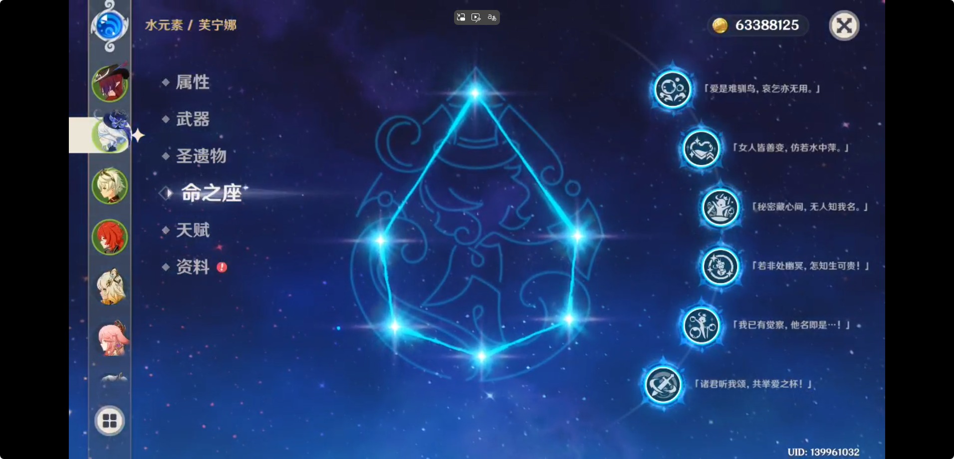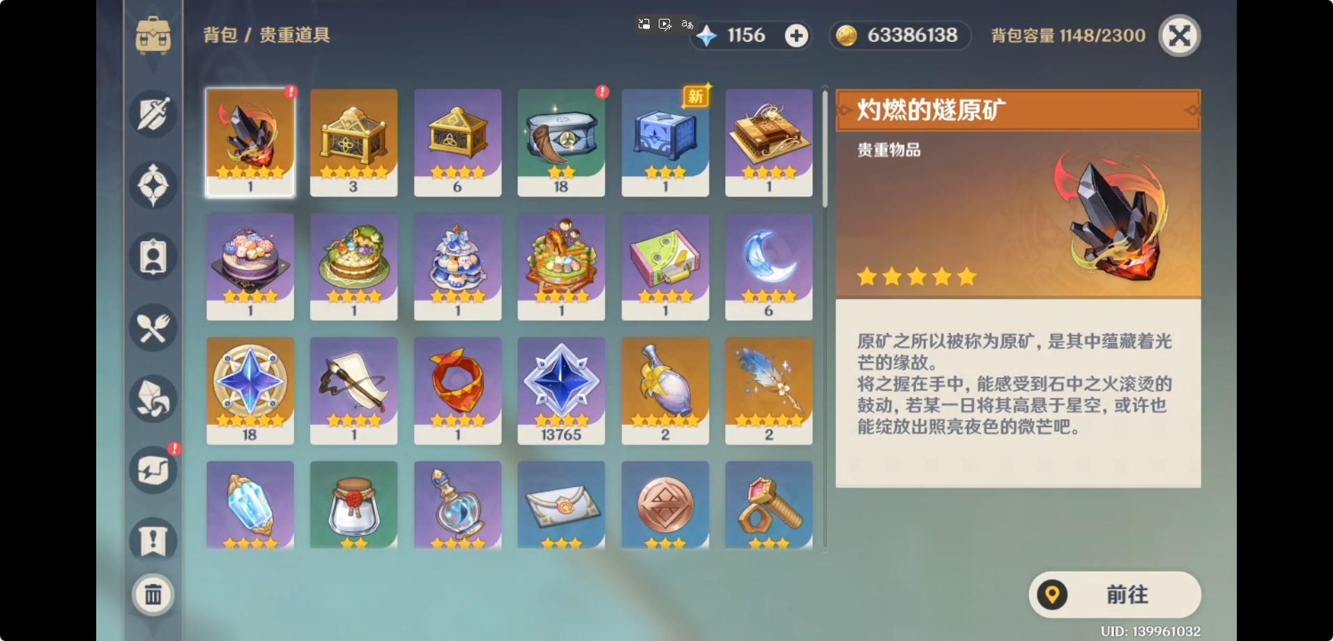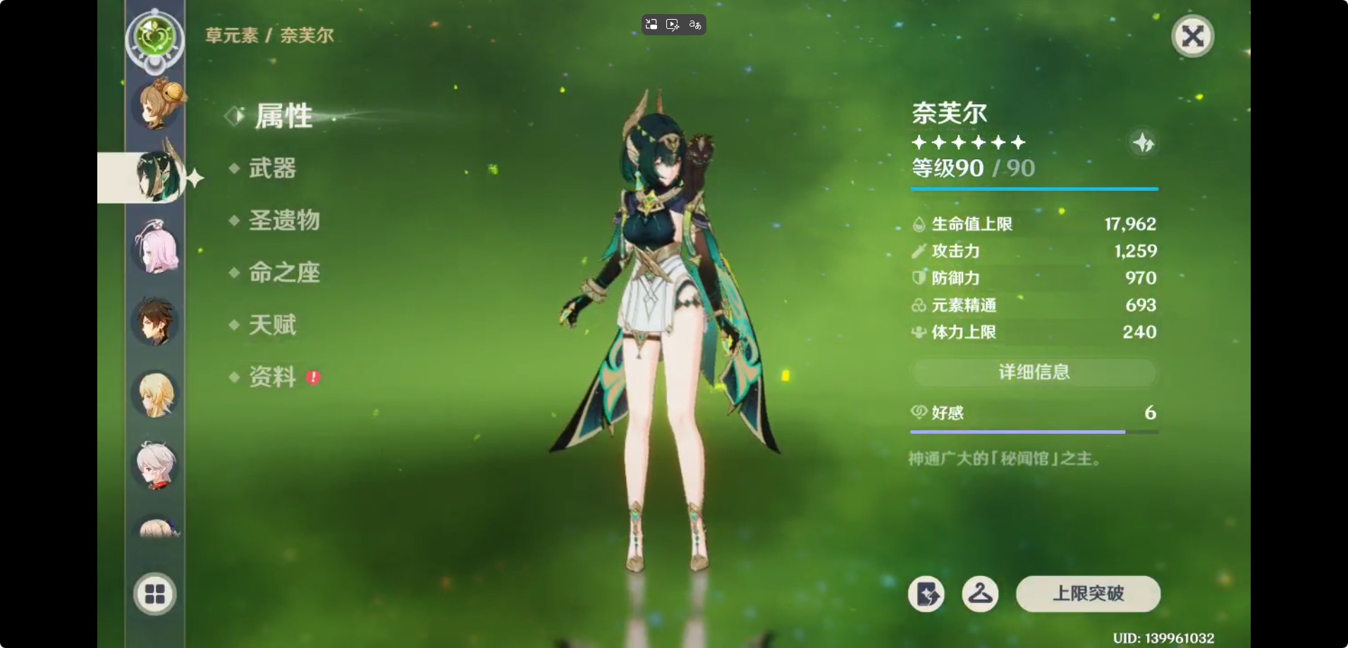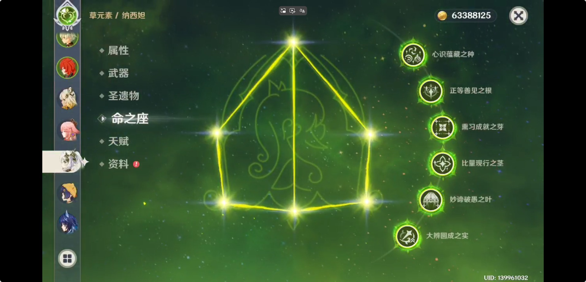 [16280595]【邮箱】不送邮/死邮 【总黄数】83 【冒险等级】60 【6命金色角色】满命恰斯卡满命芙宁娜满命纳西妲满命七七 【4命金色角色】四命八重神子四命提纳里 【3命金色角色】三命琴三命莫娜 【2命金色角色】二命希诺宁二命迪卢克 【1命金色角色】一命妮露一命枫原万叶一命胡桃一命刻晴 【0命金色角色】哥伦比娅奈芙尔夜兰雷电将军神里绫华钟离 【拥有武器】星鹫赤羽 【1精武器】真语秘匣支离轮光岩峰巡歌冲浪时光静水流涌之辉千夜浮梦神乐之真意薙草之稻光飞雷之弦振雾切之回光苍古自由之誓护摩之杖阿莫斯之弓猎人之径狼的末路风鹰剑天空之傲无工之剑天空之脊四风原典