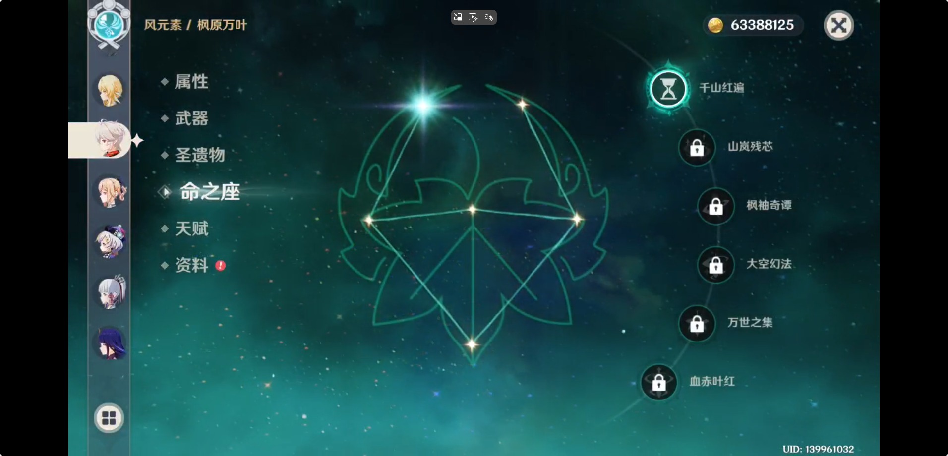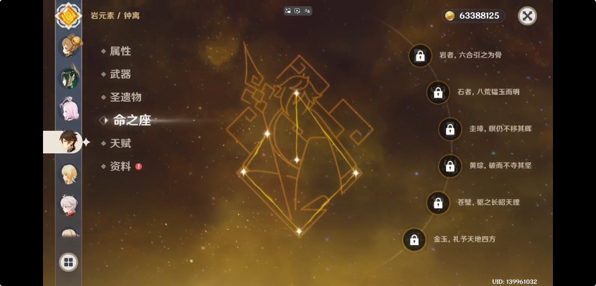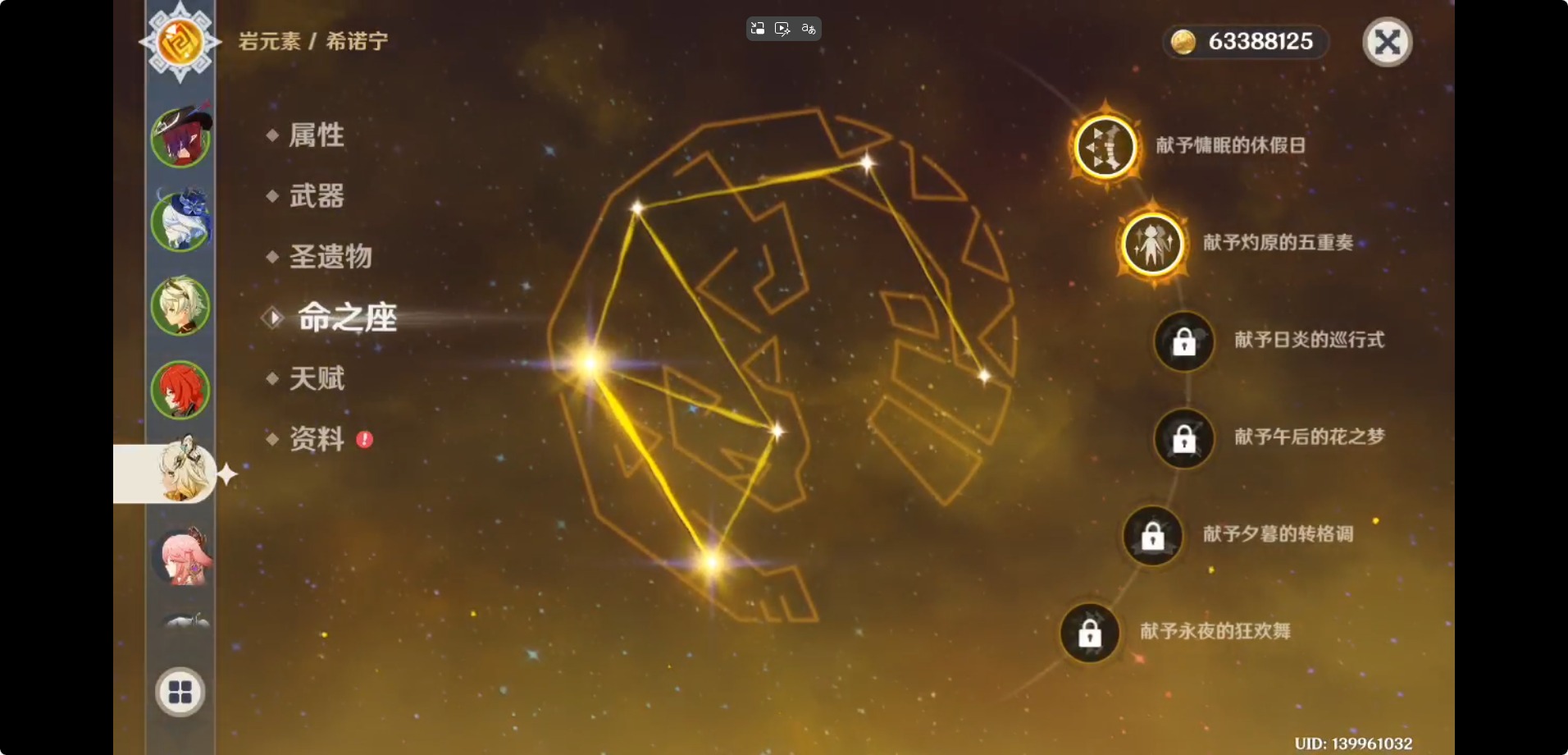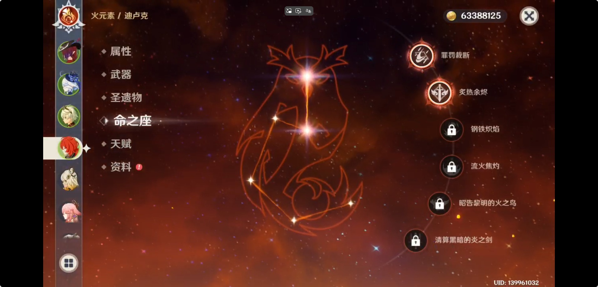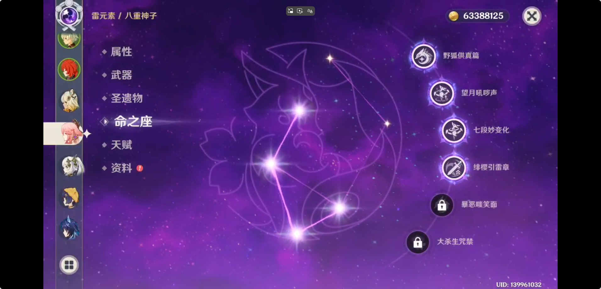 [16280595]【邮箱】不送邮/死邮 【总黄数】83 【冒险等级】60 【6命金色角色】满命恰斯卡满命芙宁娜满命纳西妲满命七七 【4命金色角色】四命八重神子四命提纳里 【3命金色角色】三命琴三命莫娜 【2命金色角色】二命希诺宁二命迪卢克 【1命金色角色】一命妮露一命枫原万叶一命胡桃一命刻晴 【0命金色角色】哥伦比娅奈芙尔夜兰雷电将军神里绫华钟离 【拥有武器】星鹫赤羽 【1精武器】真语秘匣支离轮光岩峰巡歌冲浪时光静水流涌之辉千夜浮梦神乐之真意薙草之稻光飞雷之弦振雾切之回光苍古自由之誓护摩之杖阿莫斯之弓猎人之径狼的末路风鹰剑天空之傲无工之剑天空之脊四风原典