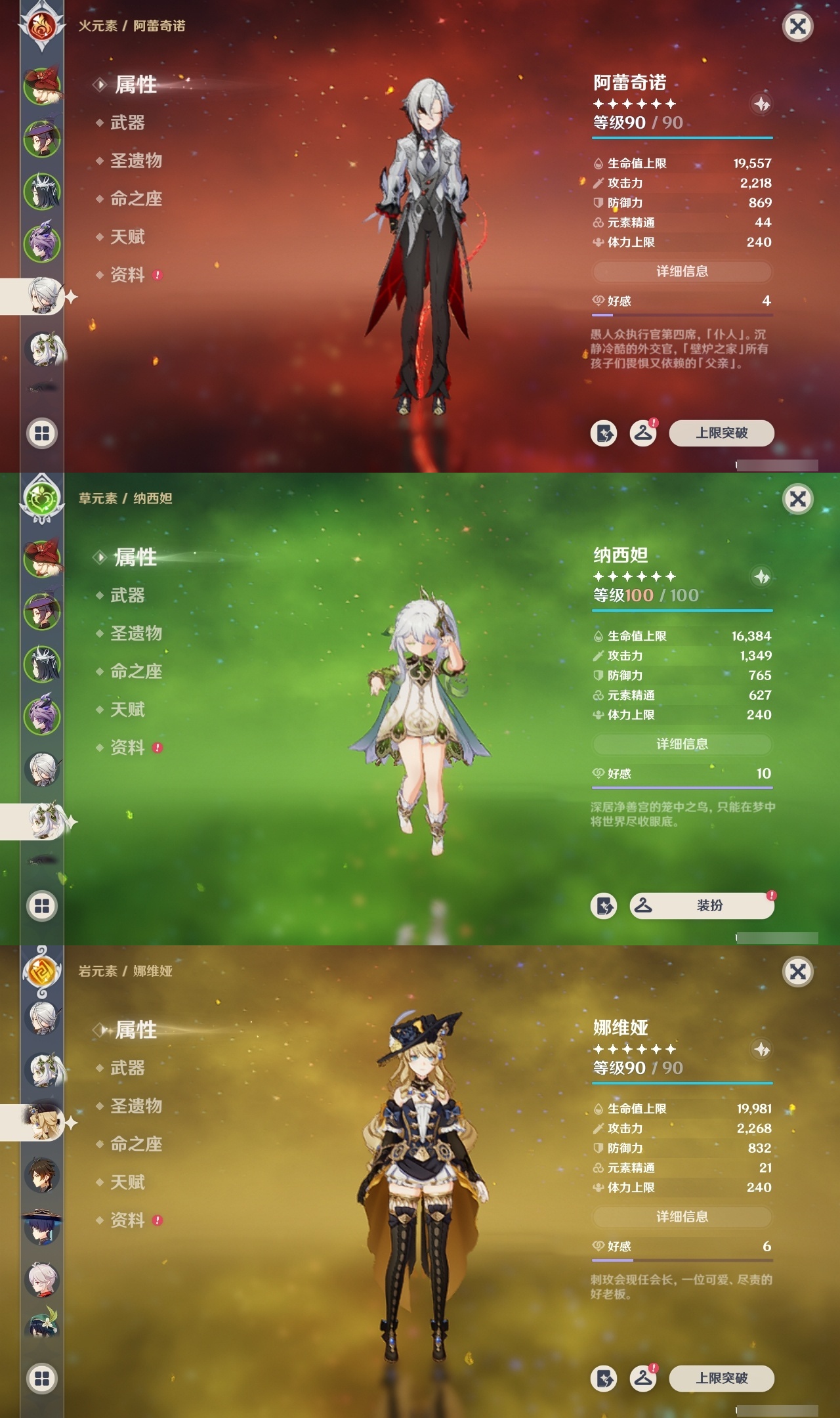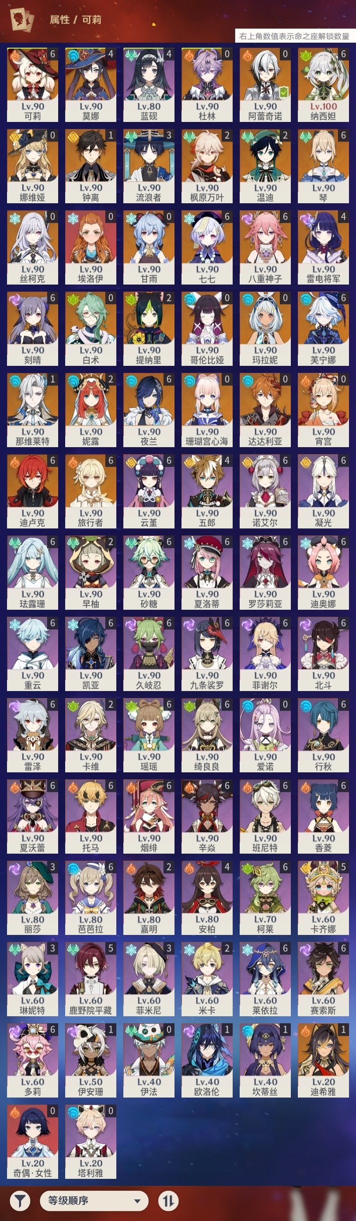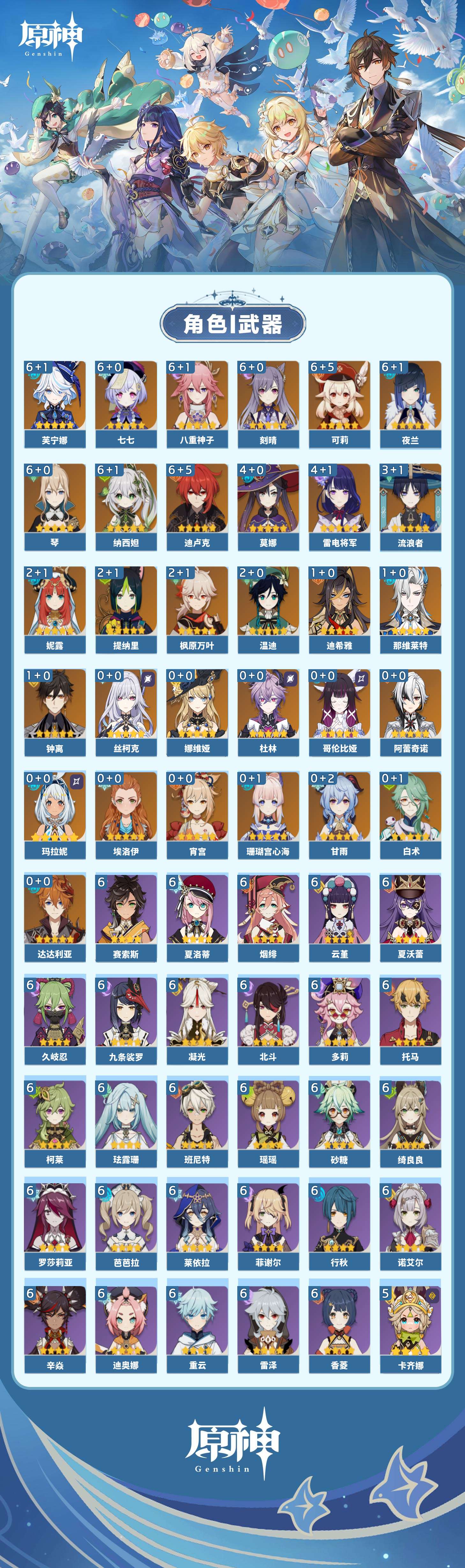 【原神】满命,冒险等级:60,五星数量:55,五星角色:芙宁娜 6命迪卢克 6命可莉 6命刻晴 6命七七 6命琴 6命八重神子 6命夜兰 6命纳西妲 6命雷电将军 4命莫娜 4命流浪者 3命枫原万叶 2命温迪 2命提纳里 2命妮露 2命迪希雅 1命那维莱特 1命钟离 1命玛拉妮珊瑚宫心海白术宵宫达达利亚娜维娅阿蕾奇诺丝柯克杜林哥伦比娅甘雨__五星武器:狼的末路 5精四风原典 5精天空之卷 3精阿莫斯之弓 2精碧落之珑静水流涌之辉支离轮光图莱杜拉的回忆不灭月华苍古自由之誓风鹰剑和璞鸢磐岩结绿天空之傲天空之脊天空之翼无工之剑薙草之稻光神乐之真意若水猎人之径圣显之钥千夜浮梦__四星角色:班尼特 6命行秋 6命九条裟罗 6命香菱 6命久岐忍 6命珐露珊 6命凝光 6命迪奥娜 6命砂糖 6命绮良良 6命瑶瑶 6命莱依拉 6命多莉 6命柯莱 6命芭芭拉 6命云堇 6命托马 6命烟绯 6命重云 6命辛焱 6命诺艾尔 6命罗莎莉亚 6命雷泽 6命菲谢尔 6命北斗 6命夏洛蒂 6命夏沃蕾 6命赛索斯 6命卡齐娜 5命鹿野院平藏 5命蓝砚 4命五郎 4命菲米尼 3命琳妮特 3命米卡 2命卡维 2命早柚 2命嘉明 2命坎蒂丝 1命欧洛伦 1命伊安珊 1命埃洛伊奇偶·女性伊法塔利雅爱诺