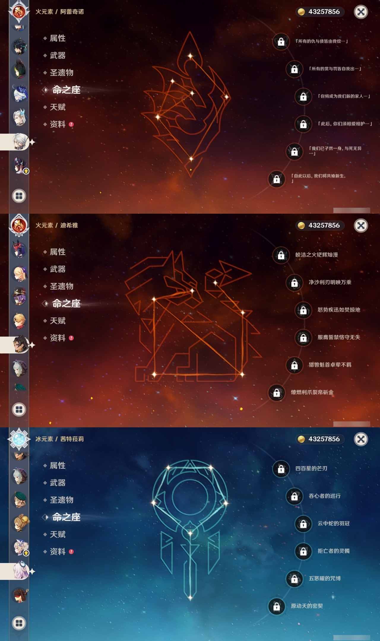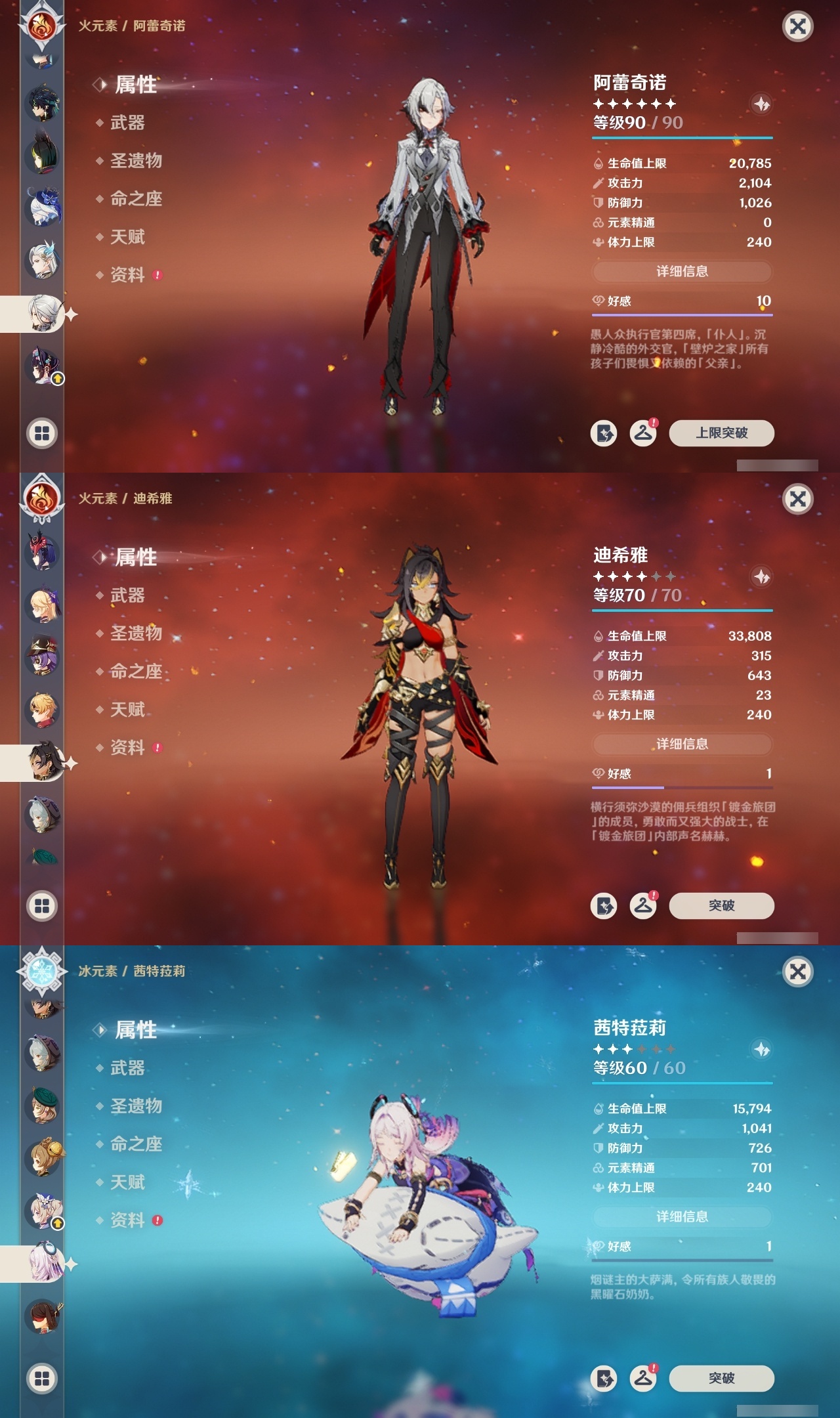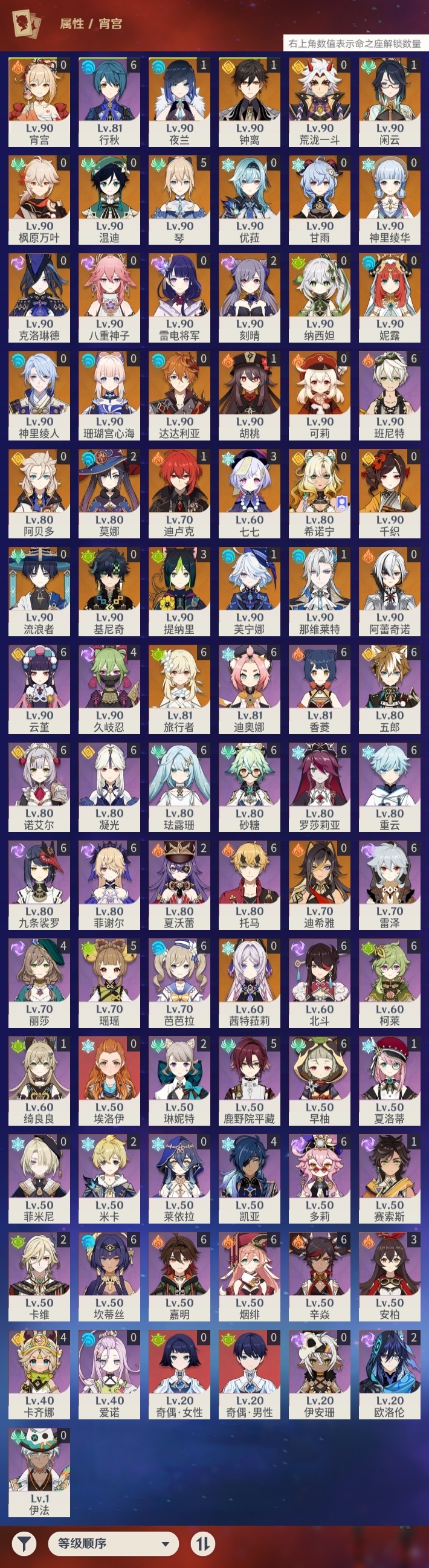 【原神】【lyys11323】冒险等级:60,五星数量:62,五星角色:琴 5命七七 3命提纳里 3命刻晴 2命莫娜 2命那维莱特 1命芙宁娜 1命闲云 1命迪卢克 1命胡桃 1命钟离 1命夜兰 1命基尼奇珊瑚宫心海希诺宁神里绫华温迪茜特菈莉宵宫优菈迪希雅荒泷一斗达达利亚八重神子神里绫人阿贝多千织阿蕾奇诺妮露纳西妲流浪者枫原万叶甘雨克洛琳德可莉雷电将军__五星武器:阿莫斯之弓 3精天空之脊 2精万世流涌大典静水流涌之辉有乐御簾切不灭月华苍古自由之誓尘世之锁飞雷之弦振风鹰剑和璞鸢护摩之杖天空之傲天空之卷无工之剑雾切之回光薙草之稻光终末嗟叹之诗斫峰之刃冬极白星若水千夜浮梦赦罪__四星角色:班尼特 6命行秋 6命九条裟罗 6命香菱 6命珐露珊 6命凝光 6命迪奥娜 6命砂糖 6命坎蒂丝 6命多莉 6命柯莱 6命芭芭拉 6命云堇 6命早柚 6命托马 6命五郎 6命烟绯 6命重云 6命辛焱 6命诺艾尔 6命罗莎莉亚 6命雷泽 6命菲谢尔 6命北斗 6命嘉明 6命鹿野院平藏 5命瑶瑶 5命卡齐娜 4命久岐忍 4命米卡 2命卡维 2命欧洛伦 2命琳妮特 2命夏沃蕾 2命绮良良 1命夏洛蒂 1命赛索斯 1命埃洛伊奇偶·女性奇偶·男性莱依拉菲米尼伊法伊安珊爱诺