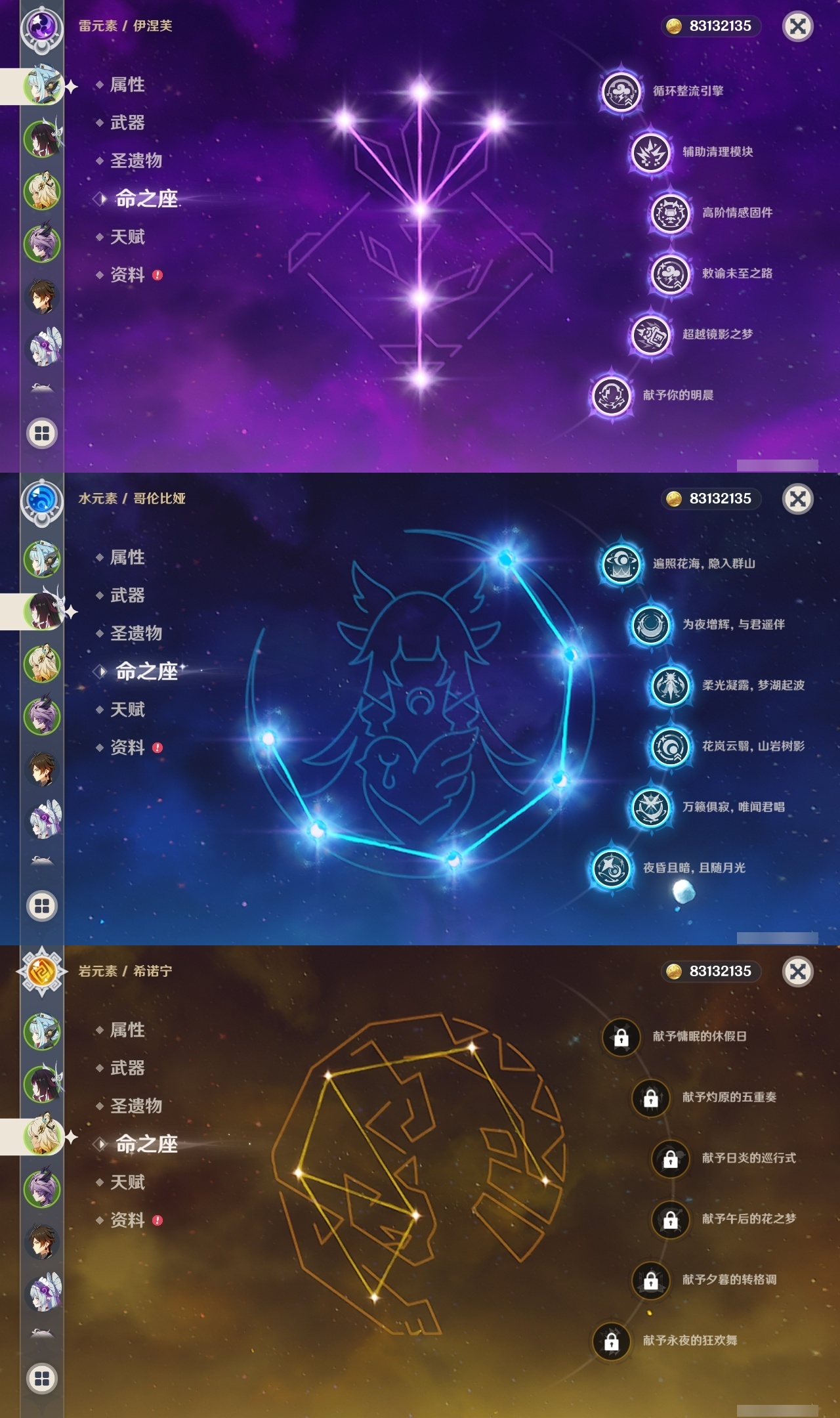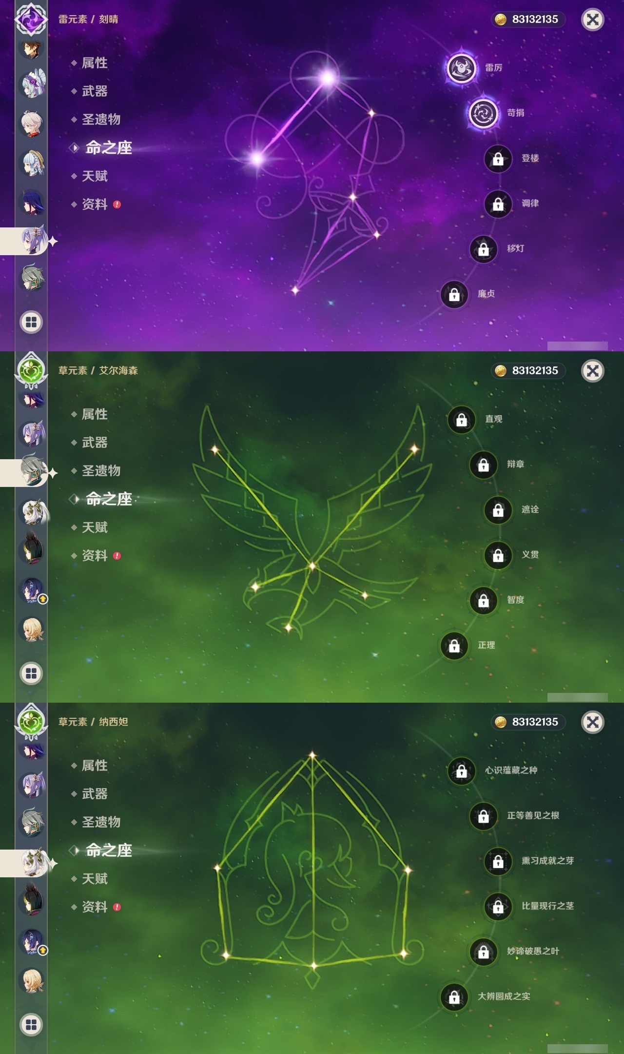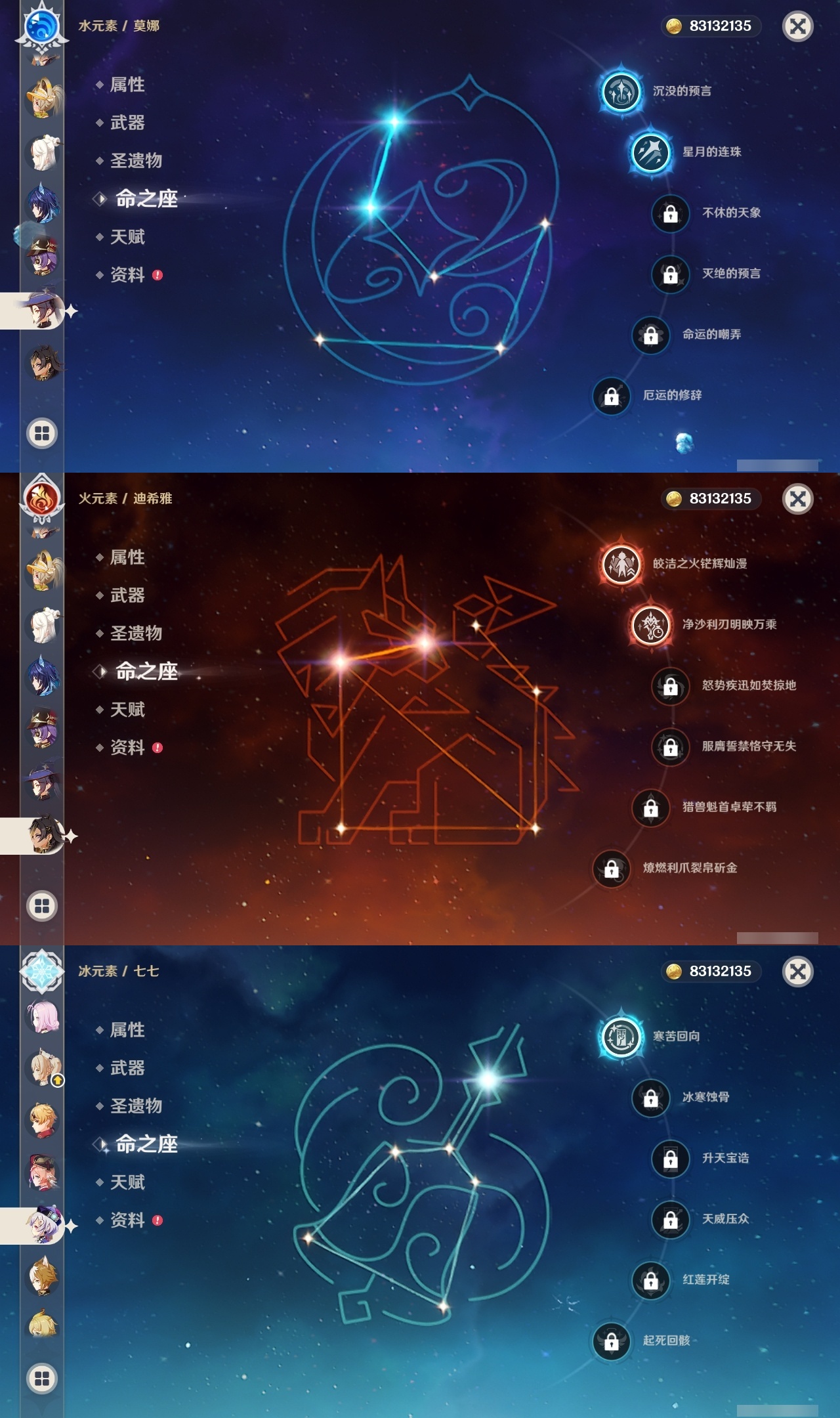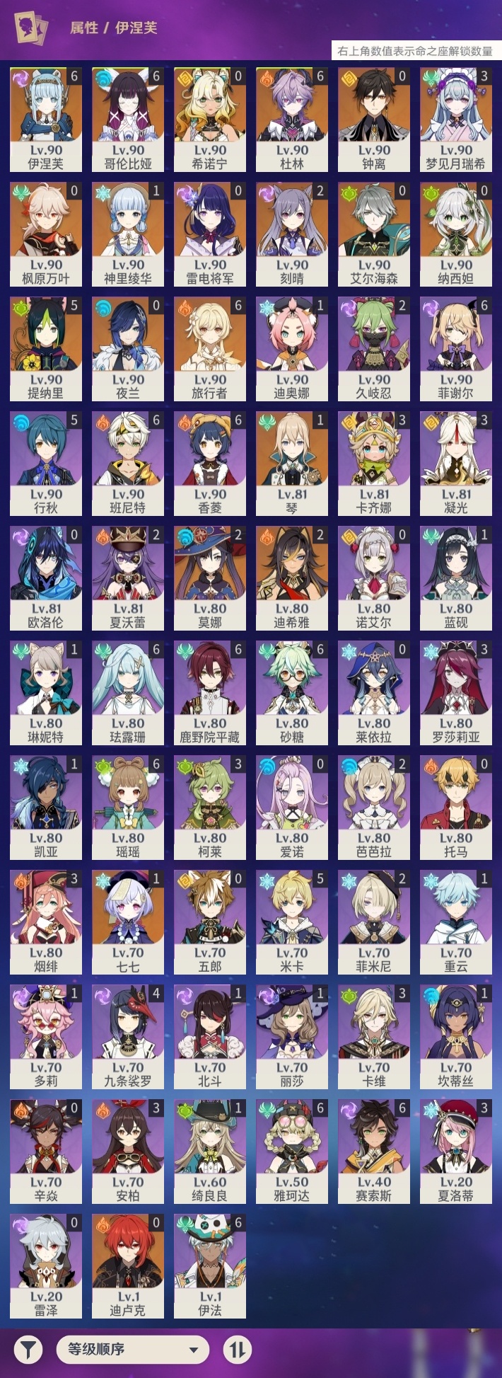 【原神】满命,冒险等级:60,五星数量:25,五星角色:伊涅芙 6命杜林 6命哥伦比娅 6命提纳里 5命梦见月瑞希 3命迪希雅 2命刻晴 2命莫娜 2命七七 1命琴 1命神里绫华 1命希诺宁钟离夜兰纳西妲艾尔海森迪卢克枫原万叶雷电将军__五星武器:支离轮光黑蚀帷间夜曲四风原典天空之傲雾切之回光__四星角色:班尼特 6命香菱 6命鹿野院平藏 6命珐露珊 6命砂糖 6命瑶瑶 6命菲谢尔 6命伊法 6命赛索斯 6命行秋 5命米卡 5命九条裟罗 4命卡齐娜 3命凝光 3命柯莱 3命卡维 3命烟绯 3命罗莎莉亚 3命夏洛蒂 3命久岐忍 2命芭芭拉 2命菲米尼 2命夏沃蕾 2命迪奥娜 1命绮良良 1命坎蒂丝 1命多莉 1命蓝砚 1命重云 1命北斗 1命琳妮特 1命莱依拉欧洛伦托马五郎辛焱诺艾尔雷泽爱诺带131抽