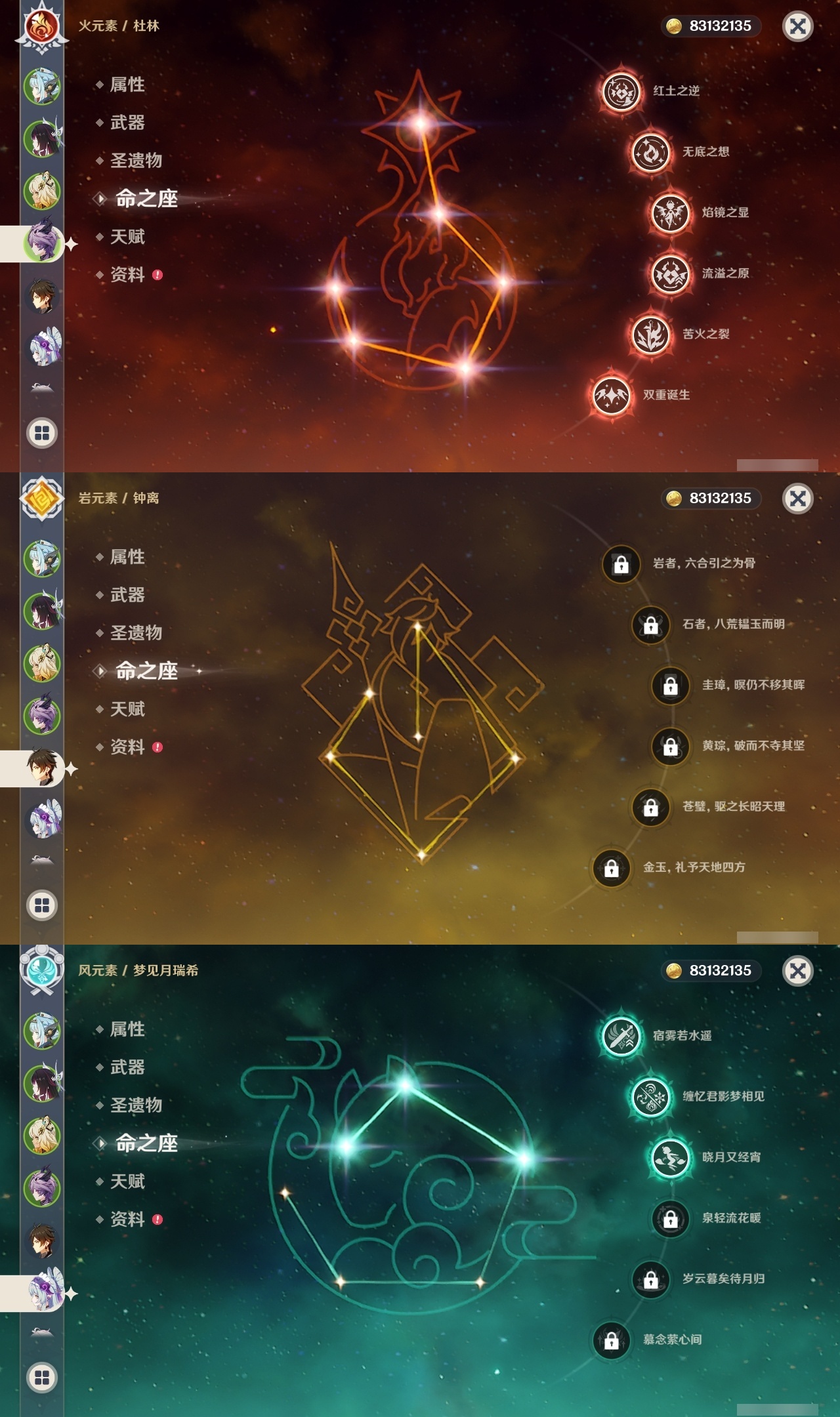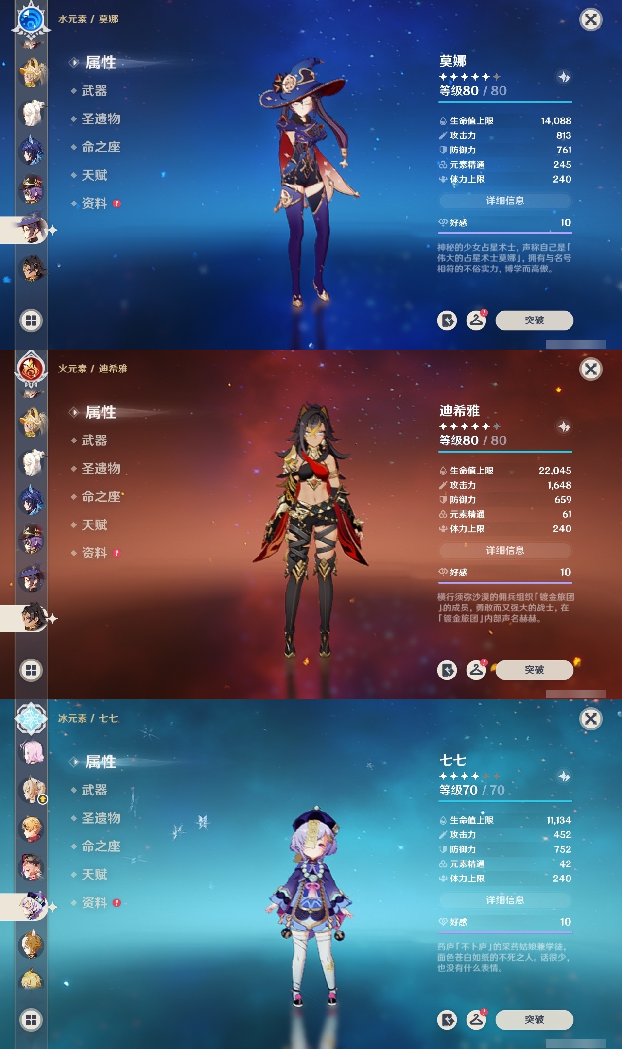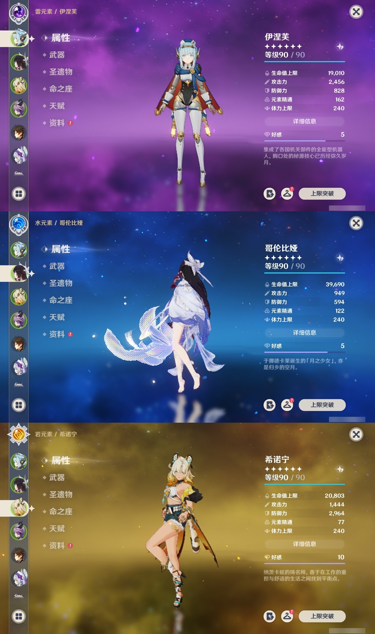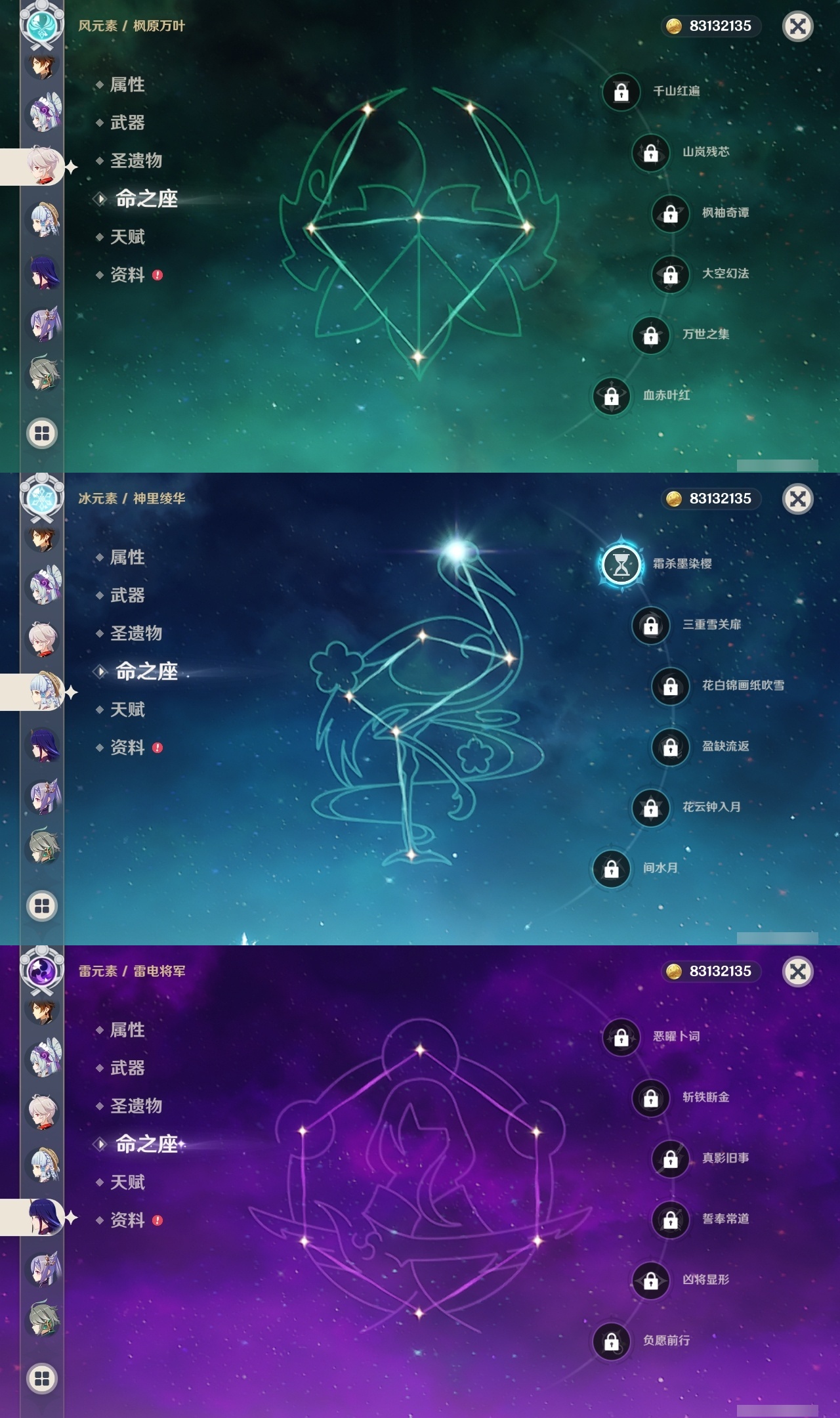 【原神】满命,冒险等级:60,五星数量:25,五星角色:伊涅芙 6命杜林 6命哥伦比娅 6命提纳里 5命梦见月瑞希 3命迪希雅 2命刻晴 2命莫娜 2命七七 1命琴 1命神里绫华 1命希诺宁钟离夜兰纳西妲艾尔海森迪卢克枫原万叶雷电将军__五星武器:支离轮光黑蚀帷间夜曲四风原典天空之傲雾切之回光__四星角色:班尼特 6命香菱 6命鹿野院平藏 6命珐露珊 6命砂糖 6命瑶瑶 6命菲谢尔 6命伊法 6命赛索斯 6命行秋 5命米卡 5命九条裟罗 4命卡齐娜 3命凝光 3命柯莱 3命卡维 3命烟绯 3命罗莎莉亚 3命夏洛蒂 3命久岐忍 2命芭芭拉 2命菲米尼 2命夏沃蕾 2命迪奥娜 1命绮良良 1命坎蒂丝 1命多莉 1命蓝砚 1命重云 1命北斗 1命琳妮特 1命莱依拉欧洛伦托马五郎辛焱诺艾尔雷泽爱诺带131抽