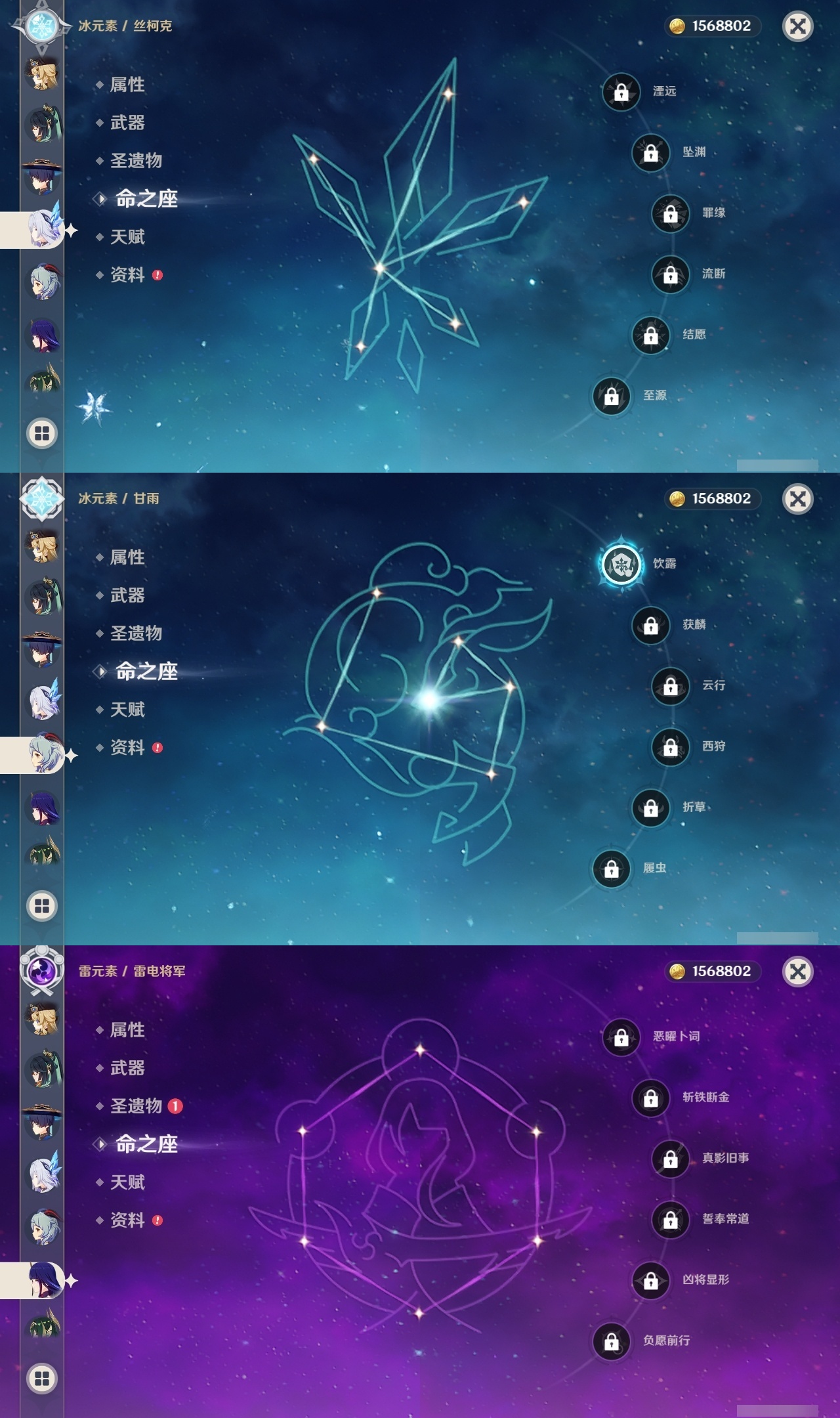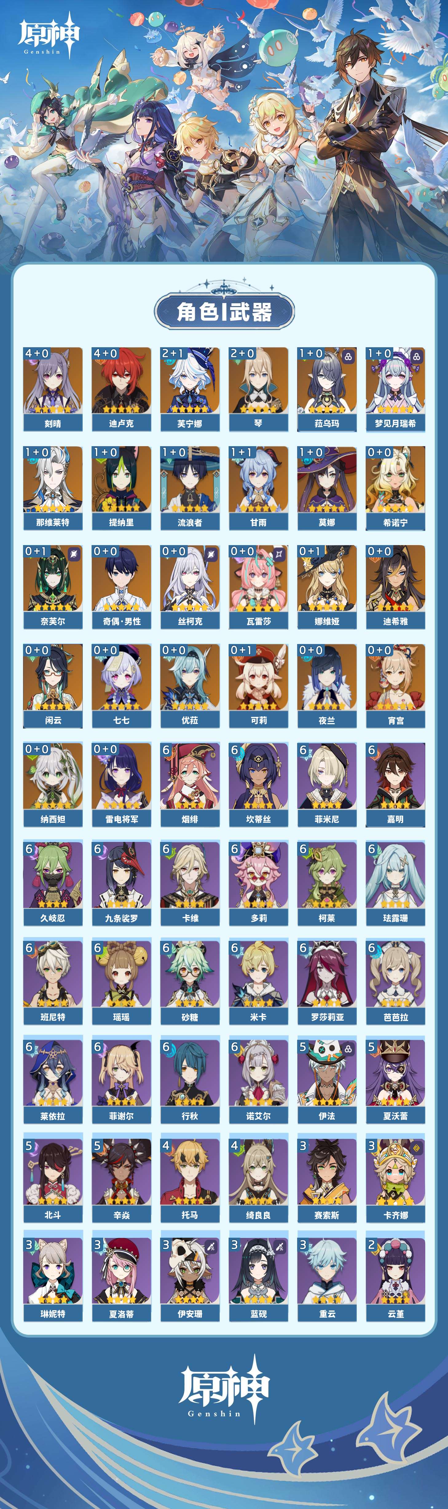 【原神】【lyys11313】冒险等级:60,五星数量:35,五星角色:迪卢克 4命刻晴 4命芙宁娜 2命琴 2命梦见月瑞希 1命那维莱特 1命菈乌玛 1命甘雨 1命莫娜 1命提纳里 1命流浪者 1命七七希诺宁宵宫优菈迪希雅瓦雷莎夜兰娜维娅闲云丝柯克纳西妲奈芙尔可莉雷电将军__五星武器:风鹰剑 2精天空之傲 2精静水流涌之辉裁断真语秘匣阿莫斯之弓四风原典天空之翼息灾__四星角色:班尼特 6命行秋 6命九条裟罗 6命久岐忍 6命珐露珊 6命砂糖 6命瑶瑶 6命莱依拉 6命米卡 6命坎蒂丝 6命多莉 6命柯莱 6命卡维 6命芭芭拉 6命烟绯 6命诺艾尔 6命罗莎莉亚 6命菲谢尔 6命菲米尼 6命嘉明 6命辛焱 5命北斗 5命夏沃蕾 5命伊法 5命绮良良 4命托马 4命卡齐娜 3命蓝砚 3命重云 3命琳妮特 3命夏洛蒂 3命伊安珊 3命赛索斯 3命香菱 2命凝光 2命云堇 2命鹿野院平藏 1命迪奥娜 1命早柚 1命五郎 1命雷泽 1命奇偶·男性欧洛伦塔利雅爱诺