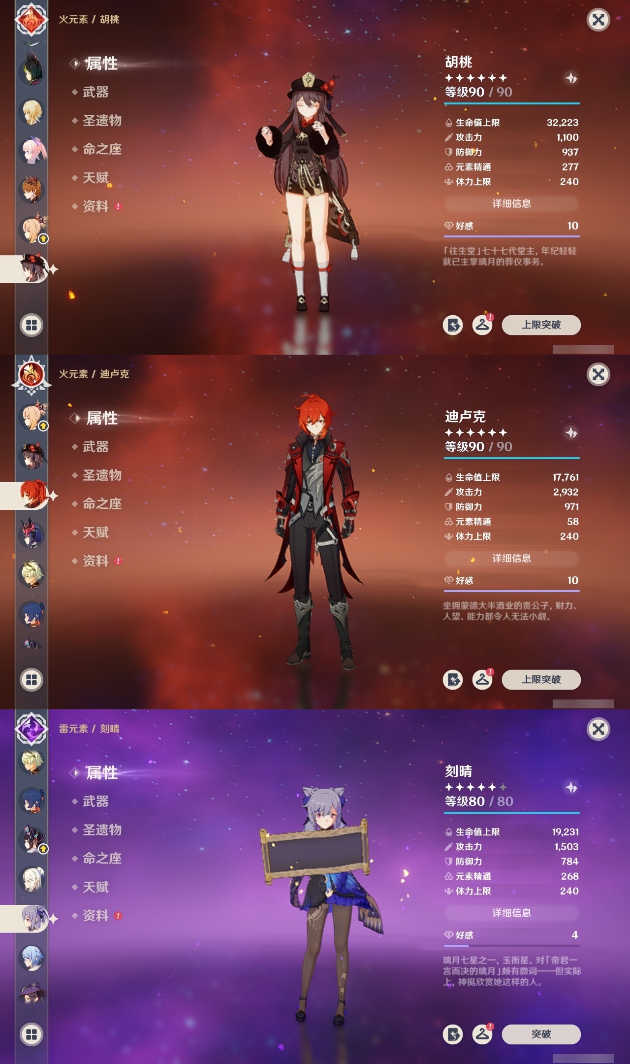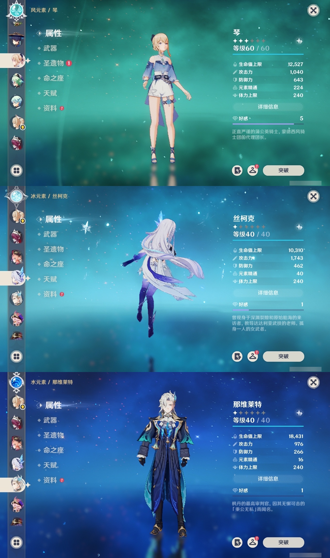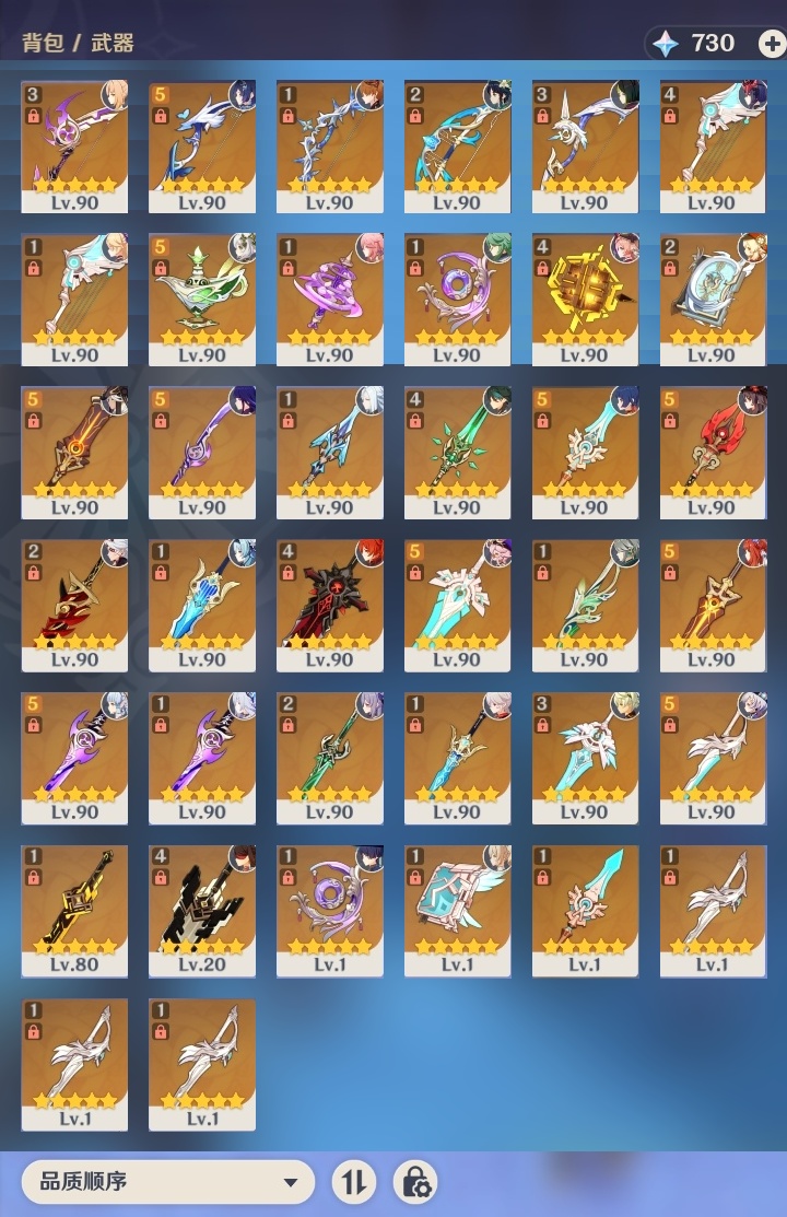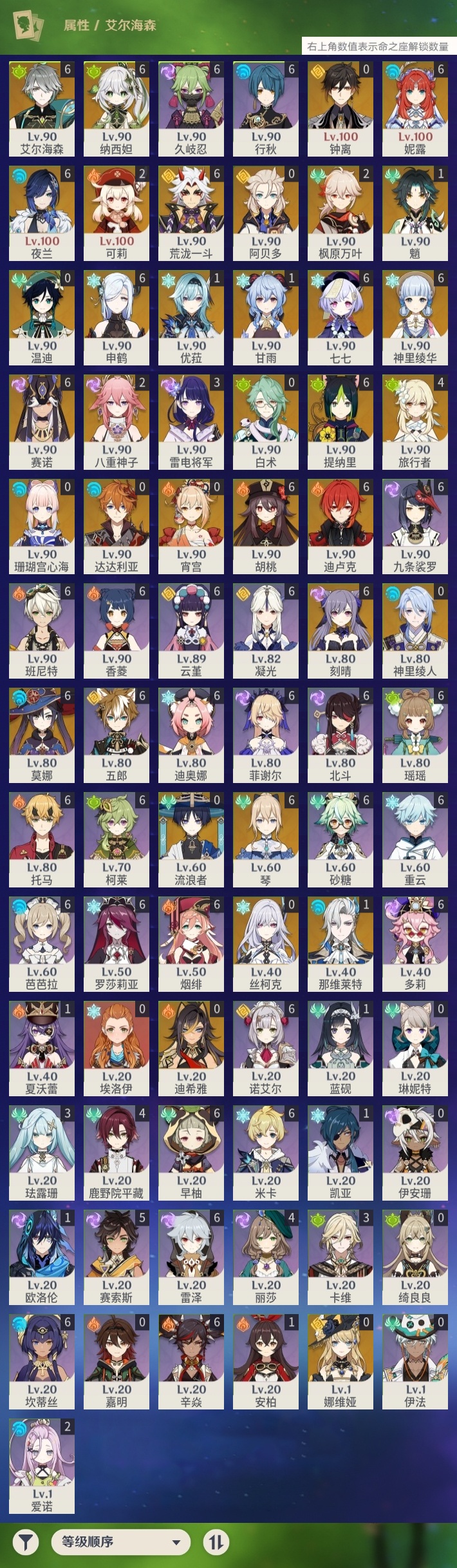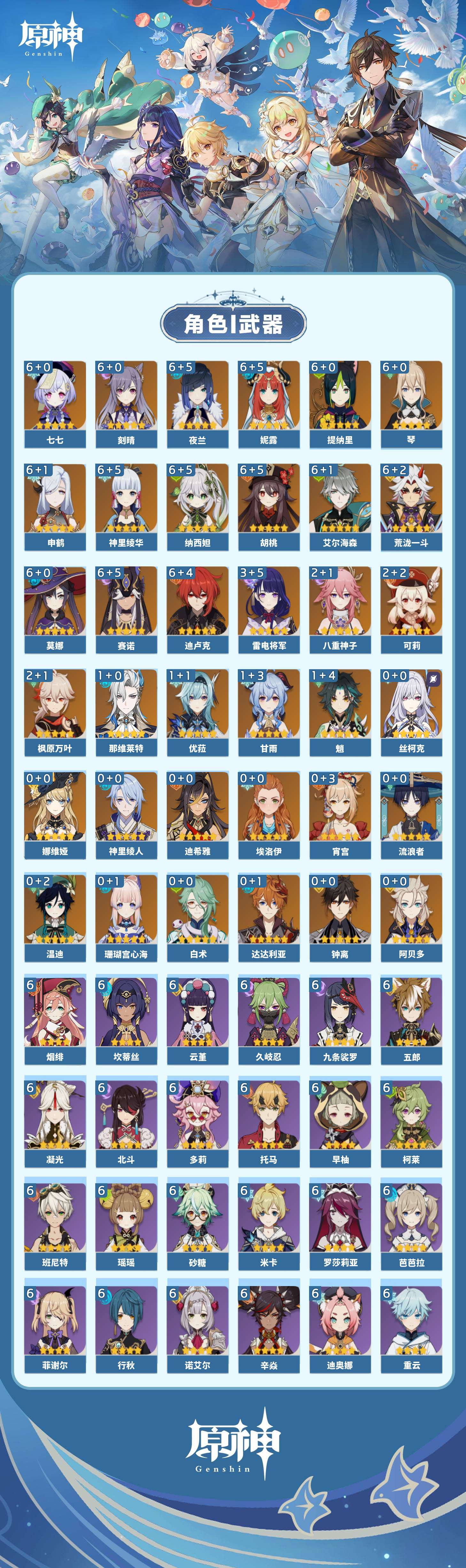 【原神】5满命,冒险等级:60,五星数量:67,五星角色:迪卢克 6命胡桃 6命刻晴 6命莫娜 6命七七 6命琴 6命神里绫华 6命荒泷一斗 6命申鹤 6命夜兰 6命提纳里 6命赛诺 6命妮露 6命纳西妲 6命艾尔海森 6命雷电将军 3命枫原万叶 2命可莉 2命八重神子 2命那维莱特 1命甘雨 1命魈 1命优菈 1命珊瑚宫心海白术温迪宵宫迪希雅钟离达达利亚神里绫人阿贝多娜维娅丝柯克流浪者__五星武器:风鹰剑 5精护摩之杖 5精天空之傲 5精天空之脊 5精雾切之回光 5精薙草之稻光 5精若水 5精赤沙之杖 5精圣显之钥 5精千夜浮梦 5精尘世之锁 4精和璞鸢 4精狼的末路 4精天空之翼 4精无工之剑 4精阿莫斯之弓 3精飞雷之弦振 3精天空之刃 3精磐岩结绿 2精四风原典 2精终末嗟叹之诗 2精赤角石溃杵 2精裁叶萃光不灭月华苍古自由之誓松籁响起之时天空之卷斫峰之刃冬极白星息灾神乐之真意__四星角色:班尼特 6命行秋 6命九条裟罗 6命香菱 6命久岐忍 6命凝光 6命迪奥娜 6命砂糖 6命瑶瑶 6命米卡 6命坎蒂丝 6命多莉 6命柯莱 6命芭芭拉 6命云堇 6命早柚 6命托马 6命五郎 6命烟绯 6命重云 6命辛焱 6命诺艾尔 6命罗莎莉亚 6命雷泽 6命菲谢尔 6命北斗 6命赛索斯 5命鹿野院平藏 4命珐露珊 3命卡维 3命爱诺 2命欧洛伦 1命蓝砚 1命夏沃蕾 1命埃洛伊绮良良琳妮特嘉明伊法伊安珊