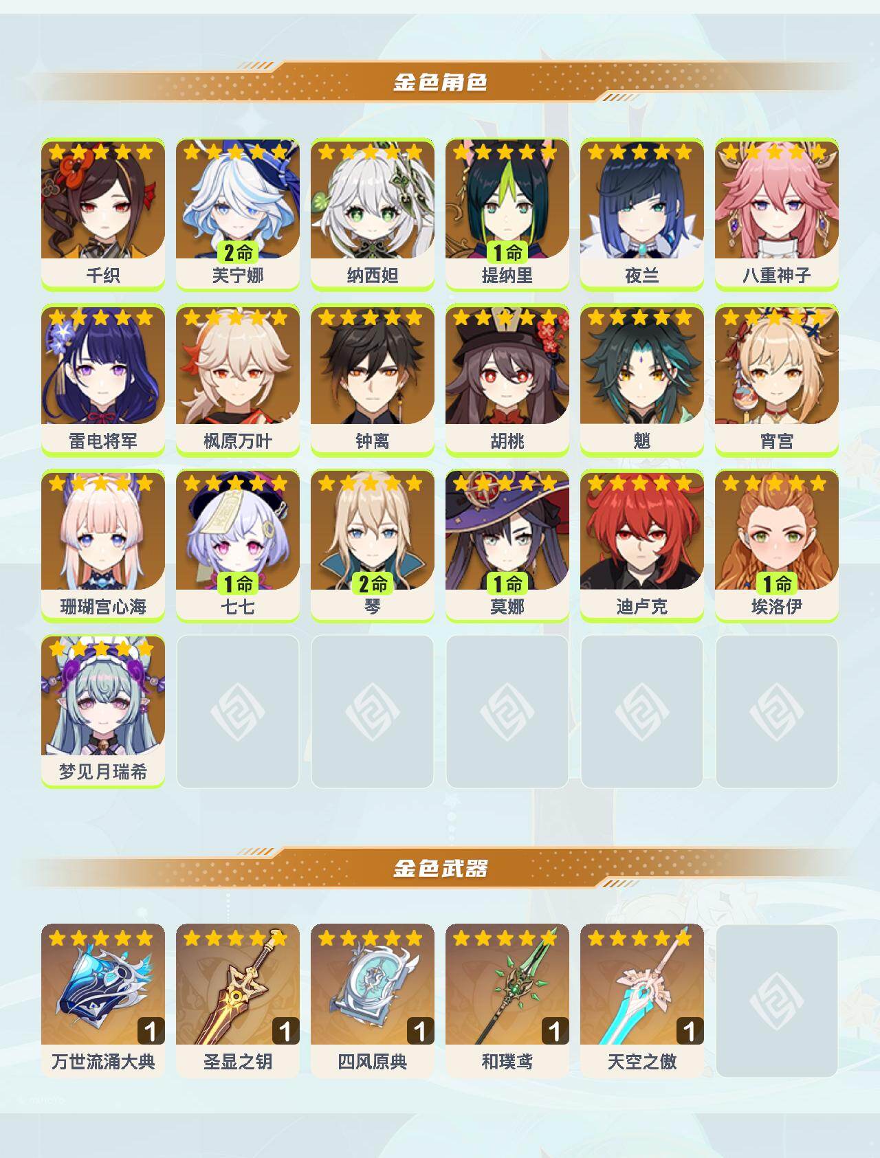【ysyt738】58级/31黄/女主/19个五星角色/5个五星武器/0命夜兰/2命芙宁娜/0命梦见月瑞希/0命钟离/0命枫原万叶/0命魈/0命雷电将军/0命宵宫/0命胡桃/0命八重神子/0命纳西妲/1命提纳里/0命珊瑚宫心海/0命千织/2命琴/0命迪卢克/0命埃洛伊/1命七七/1命莫娜/精1和璞鸢/精1圣显之钥/精1四风原典/精1万世流涌大典/精1天空之傲