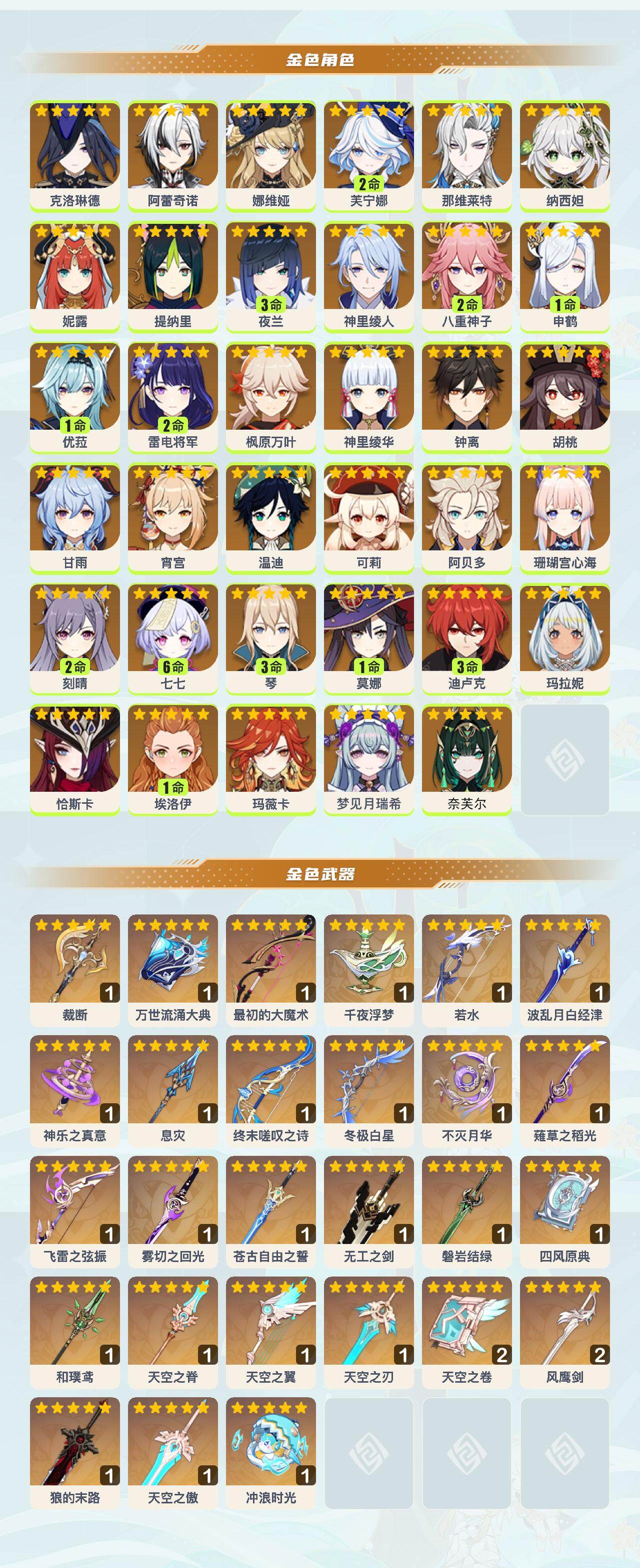 【ysyt733】60级/102黄/女主/35个五星角色/39个五星武器/0命那维莱特/2命芙宁娜/3命夜兰/0命钟离/0命娜维娅/0命恰斯卡/0命枫原万叶/0命温迪/1命申鹤/1命优菈/0命甘雨/0命神里绫华/0命克洛琳德/2命八重神子/2命雷电将军/0命纳西妲/0命玛拉妮/0命妮露/0命神里绫人/0命珊瑚宫心海/0命玛薇卡/0命阿蕾奇诺/0命宵宫/0命胡桃/3命迪卢克/0命阿贝多/满命七七/0命提纳里/3命琴/0命可莉/1命莫娜/0命埃洛伊/2命刻晴/0命梦见月瑞希/0命奈芙尔/精1最初的大魔术/精1飞雷之弦振/精1若水/精1冬极白星/精1终末嗟叹之诗/精1天空之翼/精1冲浪时光/精1万世流涌大典/精1千夜浮梦/精1神乐之真意/精1不灭月华/精1四风原典/精1薙草之稻光/精1息灾/精1和璞鸢/精1天空之脊/精1裁断/精1狼的末路/精1波乱月白经津/精1雾切之回光/精1磐岩结绿/精1苍古自由之誓/精1天空之刃/精2风鹰剑/精2天空之卷/精1无工之剑/精1天空之傲