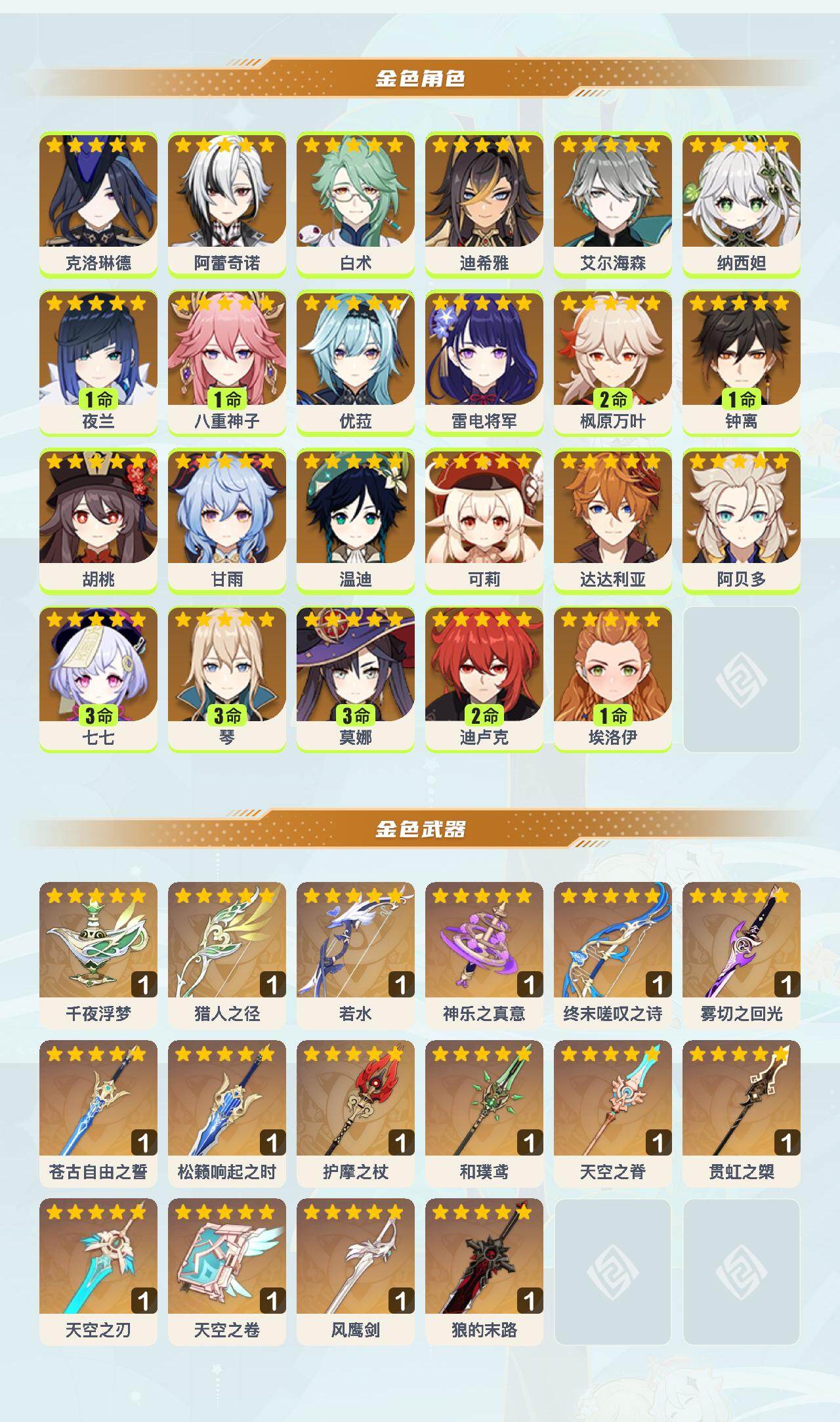 【ysyt734】60级/56黄/女主/23个五星角色/17个五星武器/0命胡桃/1命钟离/1命夜兰/0命阿贝多/2命枫原万叶/0命温迪/0命优菈/0命甘雨/3命七七/1命八重神子/0命雷电将军/0命艾尔海森/0命纳西妲/0命达达利亚/0命可莉/0命白术/3命莫娜/2命迪卢克/3命琴/0命阿蕾奇诺/0命迪希雅/0命克洛琳德/0命埃洛伊/精1猎人之径/精1若水/精1终末嗟叹之诗/精1千夜浮梦/精1神乐之真意/精1天空之卷/精1和璞鸢/精1贯虹之槊/精1天空之脊/精1护摩之杖/精1松籁响起之时/精1狼的末路/精1雾切之回光/精1苍古自由之誓/精1天空之刃/精1风鹰剑