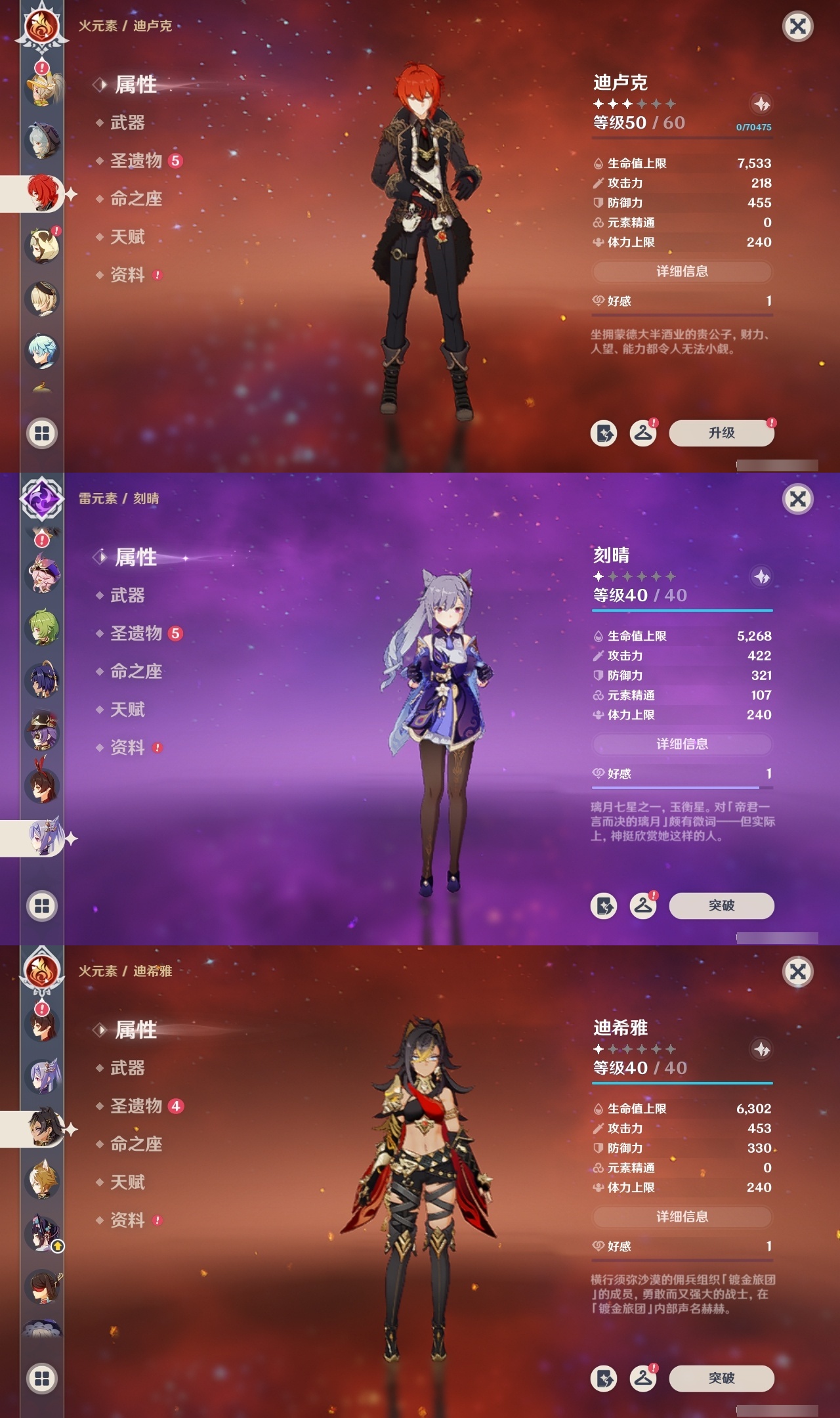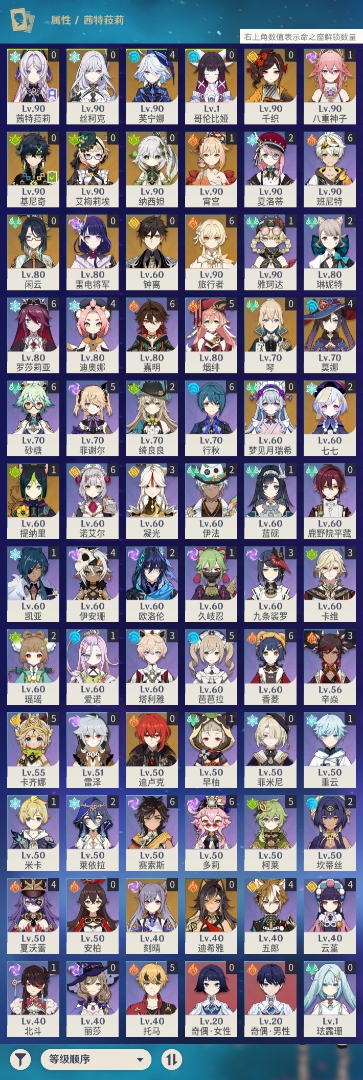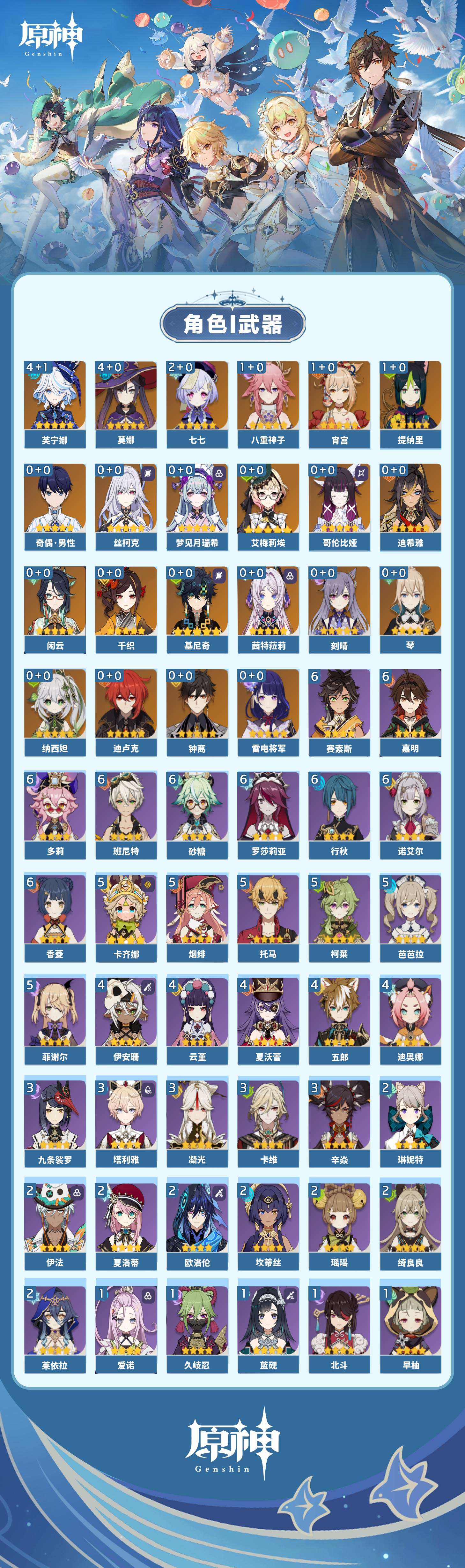 【原神】【lyys11284】冒险等级:59,五星数量:30,五星角色:芙宁娜 4命莫娜 4命七七 2命宵宫 1命八重神子 1命提纳里 1命艾梅莉埃琴基尼奇茜特菈莉迪希雅钟离梦见月瑞希闲云千织丝柯克纳西妲迪卢克哥伦比娅刻晴雷电将军__五星武器:天空之刃 2精静水流涌之辉裁叶萃光风鹰剑天空之傲天空之脊天空之卷__四星角色:班尼特 6命行秋 6命香菱 6命砂糖 6命多莉 6命诺艾尔 6命罗莎莉亚 6命嘉明 6命赛索斯 6命卡齐娜 5命柯莱 5命芭芭拉 5命托马 5命烟绯 5命菲谢尔 5命迪奥娜 4命云堇 4命五郎 4命夏沃蕾 4命伊安珊 4命九条裟罗 3命凝光 3命卡维 3命辛焱 3命塔利雅 3命绮良良 2命瑶瑶 2命莱依拉 2命坎蒂丝 2命欧洛伦 2命琳妮特 2命夏洛蒂 2命伊法 2命久岐忍 1命米卡 1命蓝砚 1命早柚 1命重云 1命北斗 1命爱诺 1命奇偶·女性奇偶·男性鹿野院平藏珐露珊雷泽菲米尼