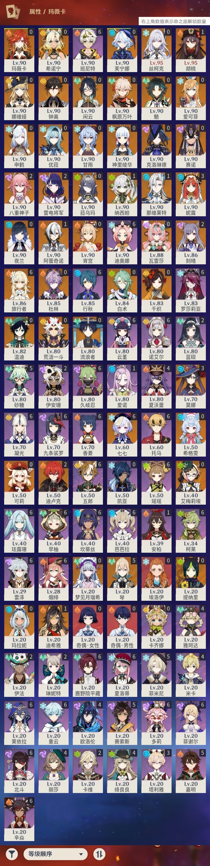 【原神】【lyys11331】冒险等级:60,五星数量:72,五星角色:七七 6命琴 5命莫娜 3命妮露 3命迪卢克 2命刻晴 2命雷电将军 2命八重神子 2命迪希雅 1命那维莱特 1命阿蕾奇诺 1命胡桃 1命纳西妲 1命艾梅莉埃玛拉妮希诺宁白术神里绫华温迪玛薇卡宵宫优菈钟离荒泷一斗梦见月瑞希申鹤瓦雷莎夜兰芙宁娜娜维娅提纳里闲云千织赛诺爱可菲丝柯克菈乌玛流浪者杜林枫原万叶甘雨魈克洛琳德希格雯可莉__五星武器:赤月之形 2精阿莫斯之弓 2精天空之傲 2精若水 2精岩峰巡歌碧落之珑焚曜千阳裁断裁叶萃光风鹰剑和璞鸢护摩之杖狼的末路四风原典天空之脊天空之刃天空之翼雾切之回光薙草之稻光息灾神乐之真意赤沙之杖圣显之钥赦罪__四星角色:班尼特 6命行秋 6命九条裟罗 6命香菱 6命久岐忍 6命鹿野院平藏 6命珐露珊 6命凝光 6命迪奥娜 6命瑶瑶 6命莱依拉 6命坎蒂丝 6命多莉 6命柯莱 6命芭芭拉 6命云堇 6命早柚 6命托马 6命五郎 6命烟绯 6命重云 6命辛焱 6命诺艾尔 6命罗莎莉亚 6命雷泽 6命菲谢尔 6命北斗 6命夏洛蒂 6命砂糖 5命菲米尼 5命嘉明 5命赛索斯 5命绮良良 4命米卡 4命欧洛伦 4命夏沃蕾 4命塔利雅 3命卡维 2命蓝砚 2命琳妮特 2命伊法 2命伊安珊 2命爱诺 1命埃洛伊奇偶·女性奇偶·男性卡齐娜