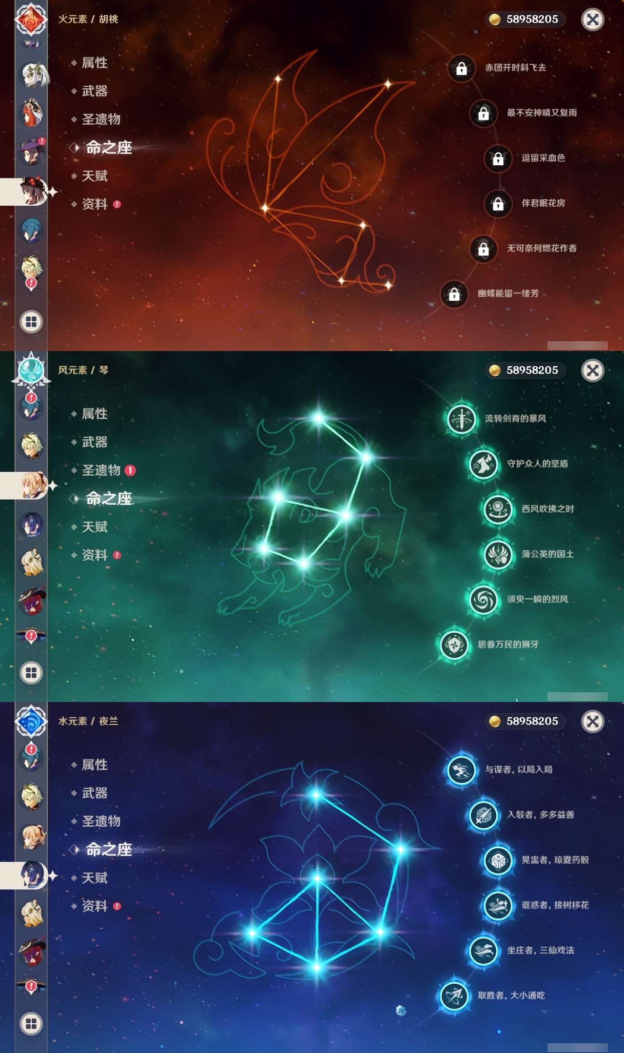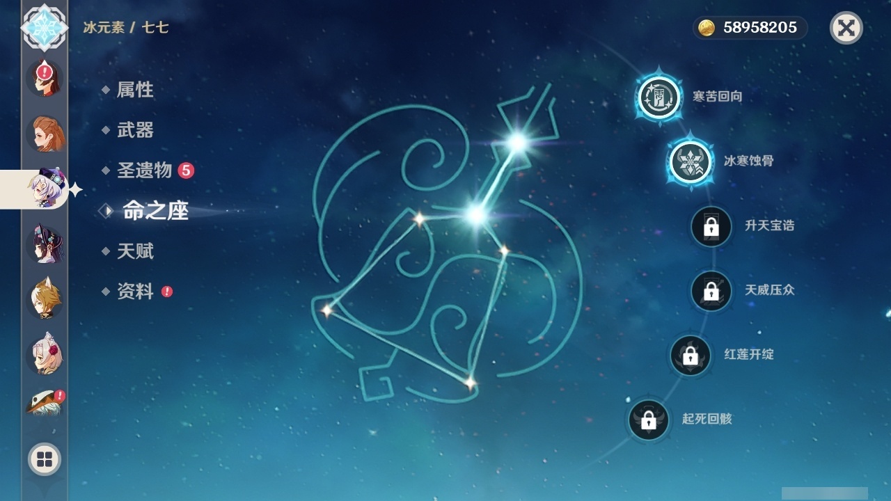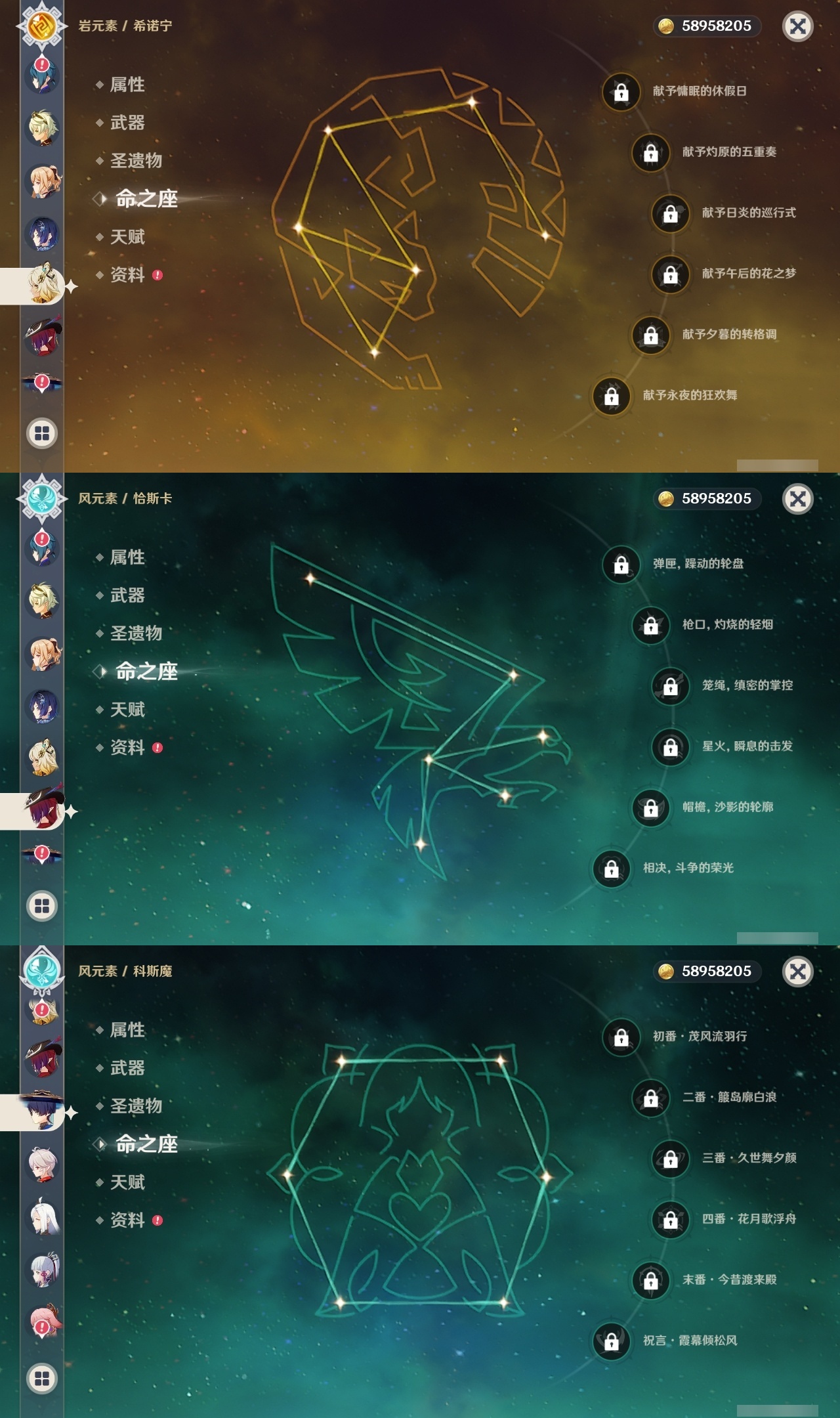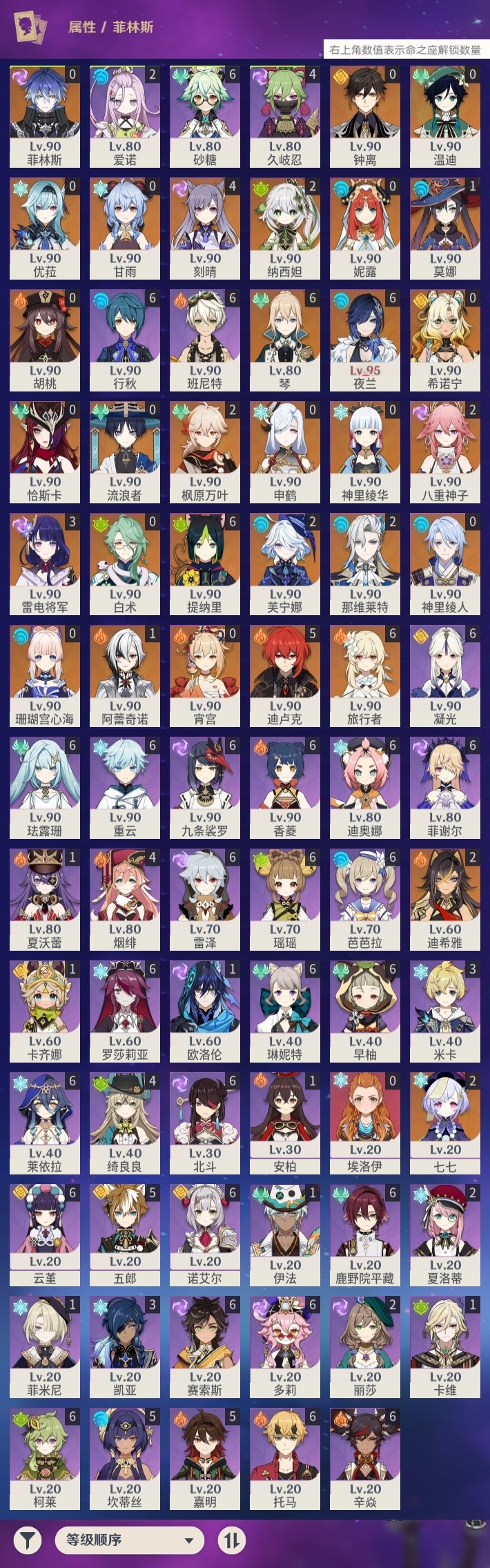 【原神】满命,冒险等级:60,五星数量:58,五星角色:琴 6命夜兰 6命提纳里 6命迪卢克 5命刻晴 4命雷电将军 3命迪希雅 2命那维莱特 2命芙宁娜 2命枫原万叶 2命七七 2命八重神子 2命纳西妲 2命阿蕾奇诺 1命莫娜 1命珊瑚宫心海希诺宁白术神里绫华温迪恰斯卡宵宫优菈钟离申鹤神里绫人妮露菲林斯流浪者甘雨胡桃__五星武器:阿莫斯之弓 5精松籁响起之时 3精和璞鸢 2精天空之傲 2精最初的大魔术万世流涌大典静水流涌之辉支离轮光血染荒城真语秘匣不灭月华苍古自由之誓飞雷之弦振风鹰剑护摩之杖狼的末路天空之刃天空之翼无工之剑雾切之回光薙草之稻光终末嗟叹之诗神乐之真意若水赤沙之杖千夜浮梦__四星角色:班尼特 6命行秋 6命九条裟罗 6命香菱 6命鹿野院平藏 6命珐露珊 6命凝光 6命迪奥娜 6命砂糖 6命瑶瑶 6命莱依拉 6命多莉 6命柯莱 6命芭芭拉 6命云堇 6命早柚 6命托马 6命重云 6命辛焱 6命诺艾尔 6命罗莎莉亚 6命雷泽 6命菲谢尔 6命北斗 6命琳妮特 6命赛索斯 6命坎蒂丝 5命五郎 5命嘉明 5命久岐忍 4命绮良良 4命烟绯 4命米卡 3命夏洛蒂 2命爱诺 2命卡齐娜 1命卡维 1命欧洛伦 1命菲米尼 1命夏沃蕾 1命伊法 1命埃洛伊