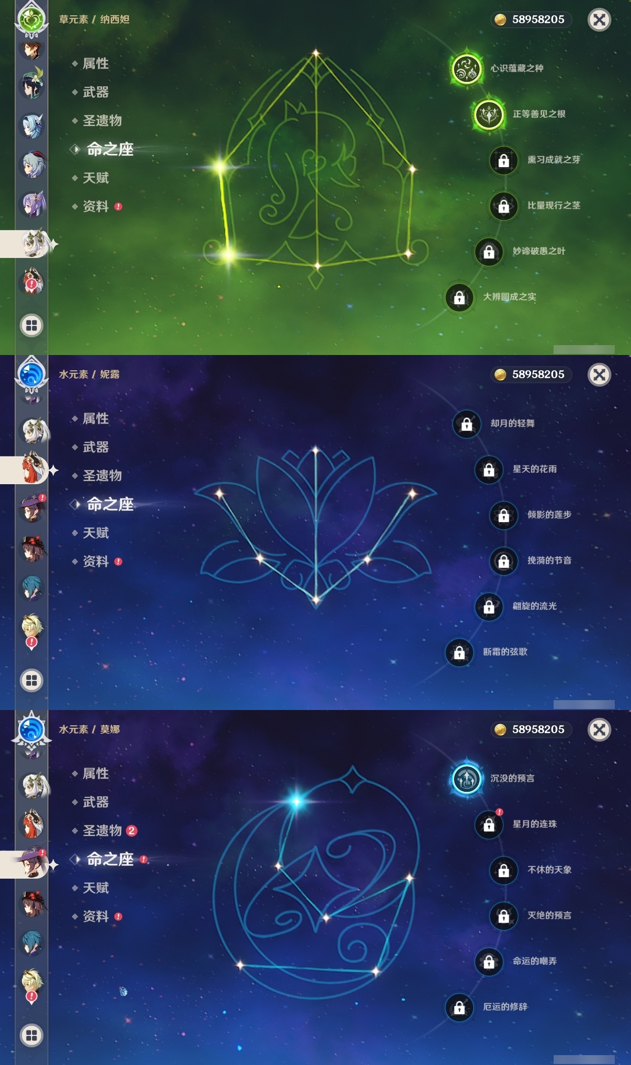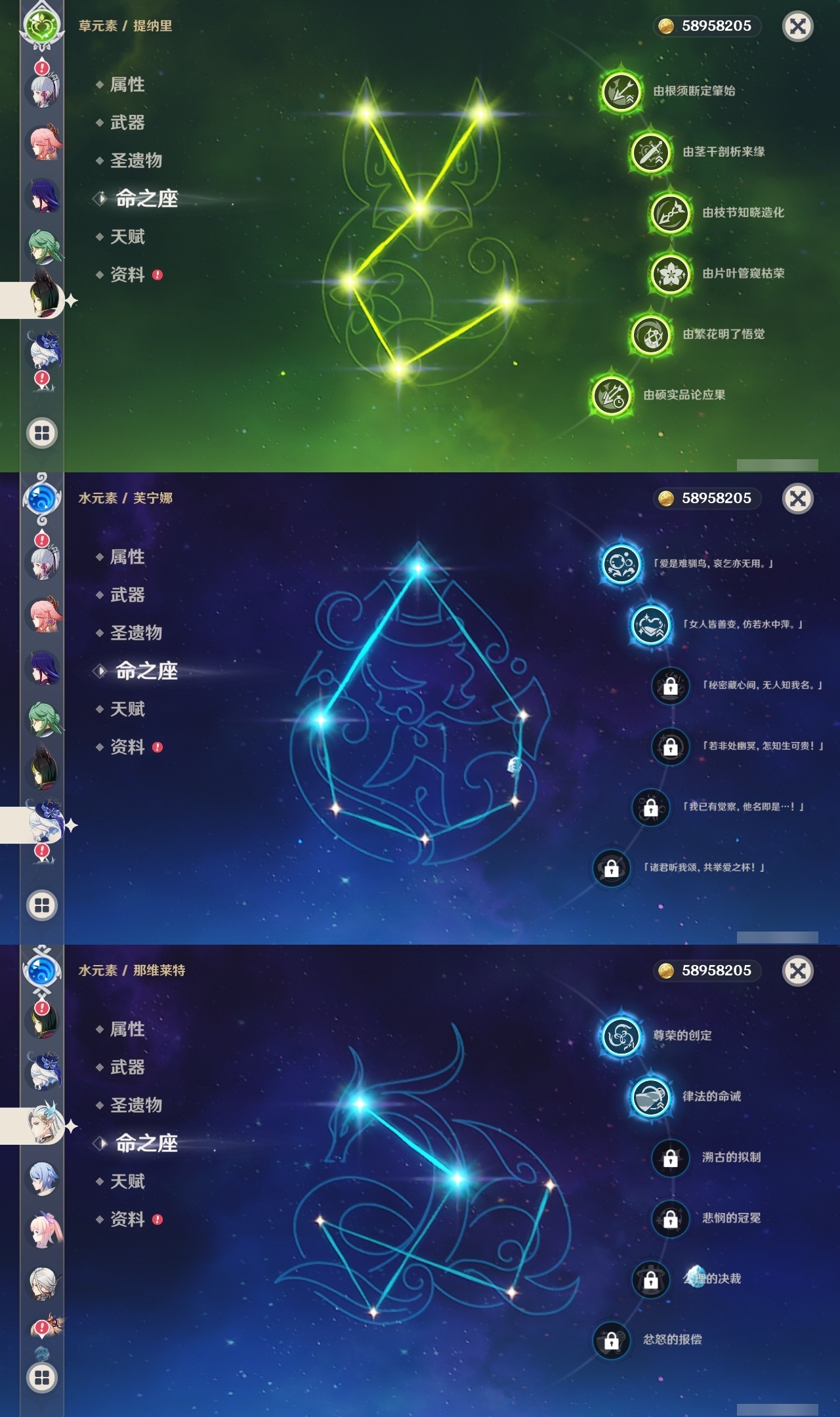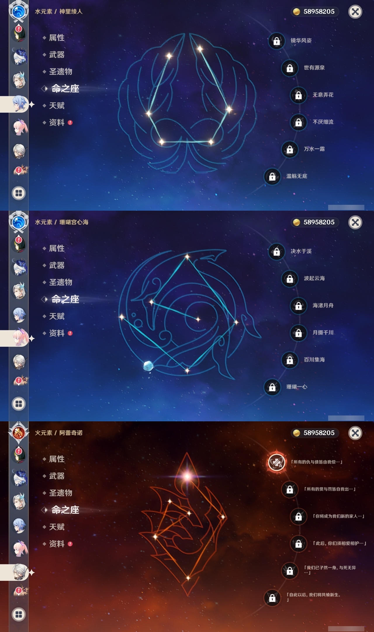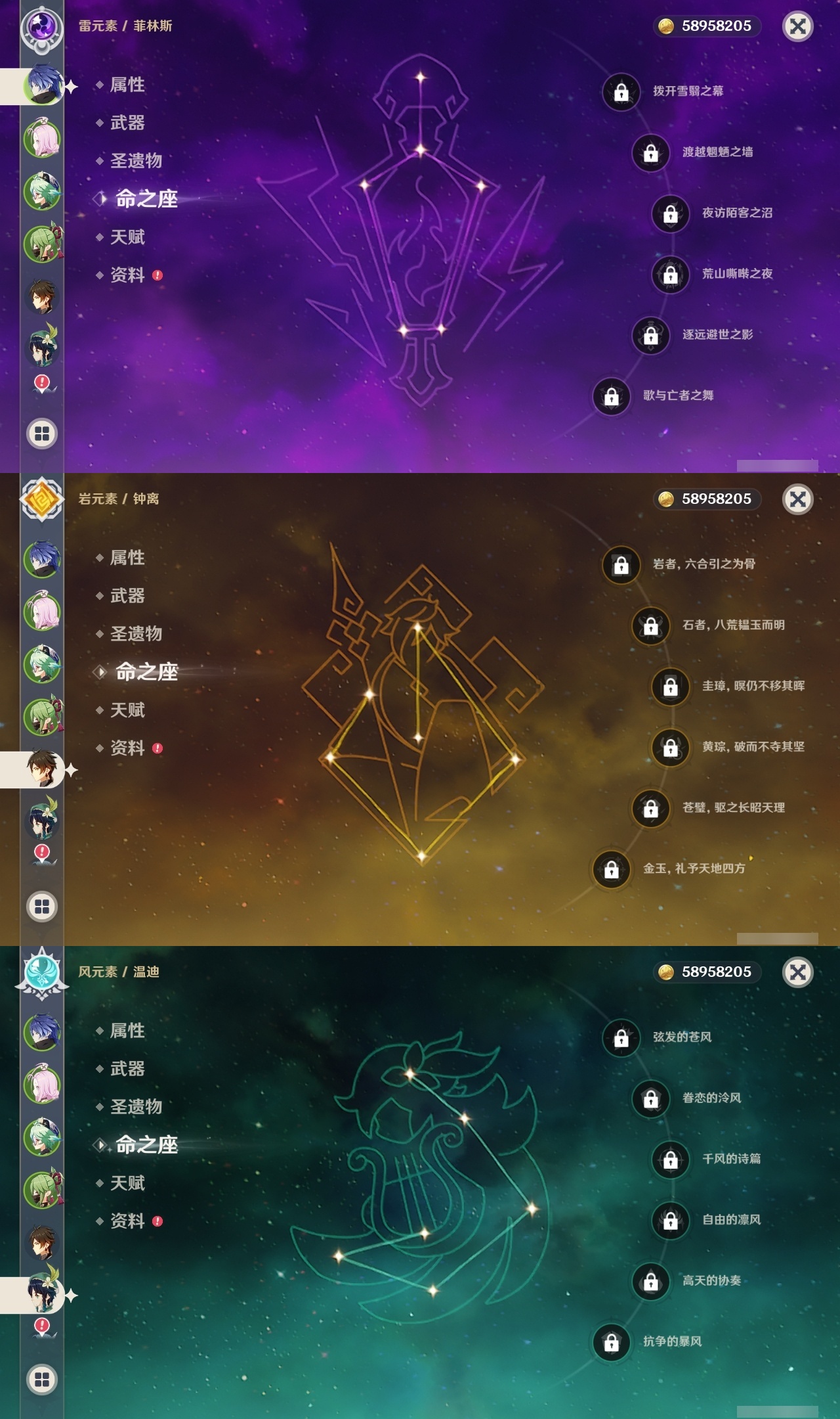 【原神】满命,冒险等级:60,五星数量:58,五星角色:琴 6命夜兰 6命提纳里 6命迪卢克 5命刻晴 4命雷电将军 3命迪希雅 2命那维莱特 2命芙宁娜 2命枫原万叶 2命七七 2命八重神子 2命纳西妲 2命阿蕾奇诺 1命莫娜 1命珊瑚宫心海希诺宁白术神里绫华温迪恰斯卡宵宫优菈钟离申鹤神里绫人妮露菲林斯流浪者甘雨胡桃__五星武器:阿莫斯之弓 5精松籁响起之时 3精和璞鸢 2精天空之傲 2精最初的大魔术万世流涌大典静水流涌之辉支离轮光血染荒城真语秘匣不灭月华苍古自由之誓飞雷之弦振风鹰剑护摩之杖狼的末路天空之刃天空之翼无工之剑雾切之回光薙草之稻光终末嗟叹之诗神乐之真意若水赤沙之杖千夜浮梦__四星角色:班尼特 6命行秋 6命九条裟罗 6命香菱 6命鹿野院平藏 6命珐露珊 6命凝光 6命迪奥娜 6命砂糖 6命瑶瑶 6命莱依拉 6命多莉 6命柯莱 6命芭芭拉 6命云堇 6命早柚 6命托马 6命重云 6命辛焱 6命诺艾尔 6命罗莎莉亚 6命雷泽 6命菲谢尔 6命北斗 6命琳妮特 6命赛索斯 6命坎蒂丝 5命五郎 5命嘉明 5命久岐忍 4命绮良良 4命烟绯 4命米卡 3命夏洛蒂 2命爱诺 2命卡齐娜 1命卡维 1命欧洛伦 1命菲米尼 1命夏沃蕾 1命伊法 1命埃洛伊