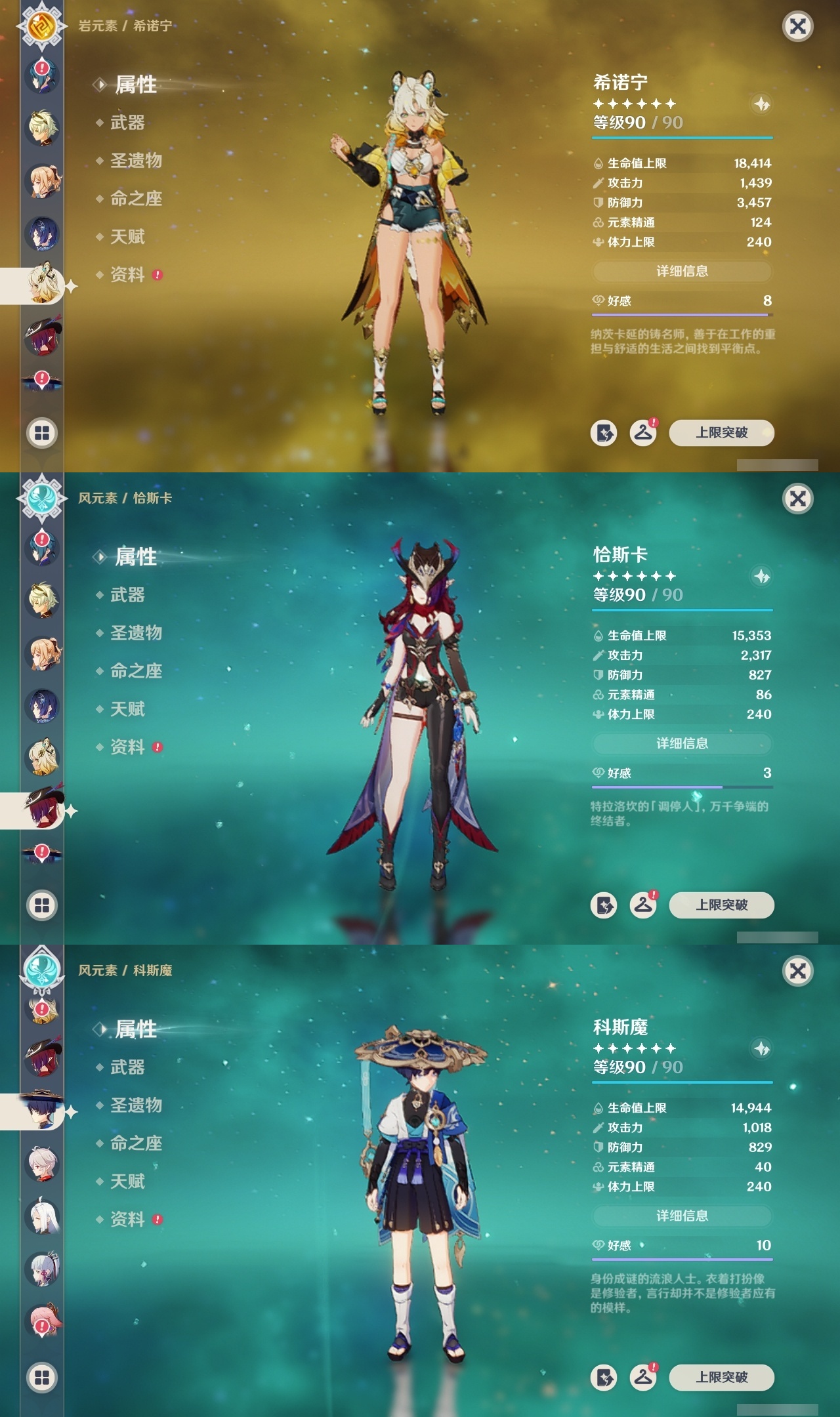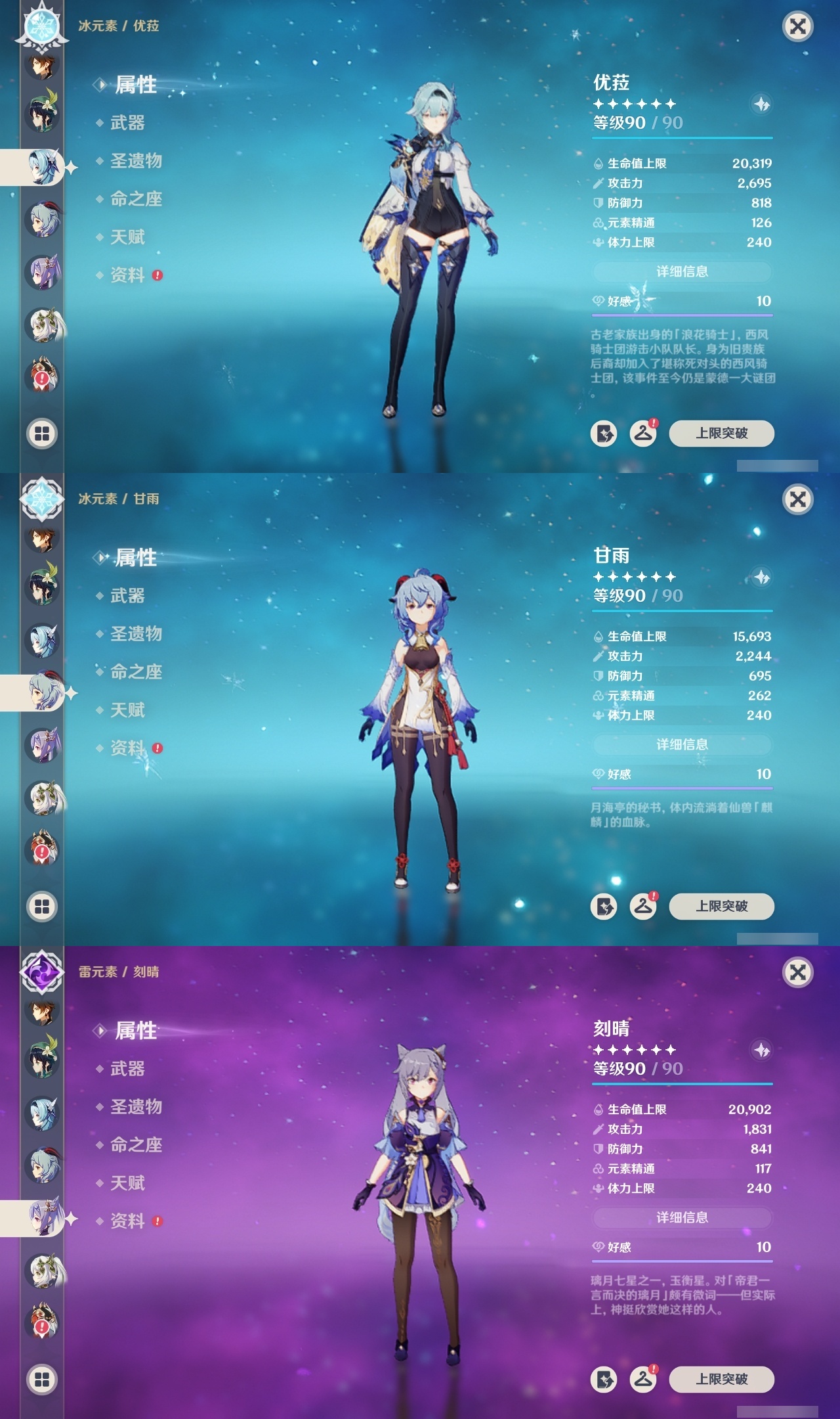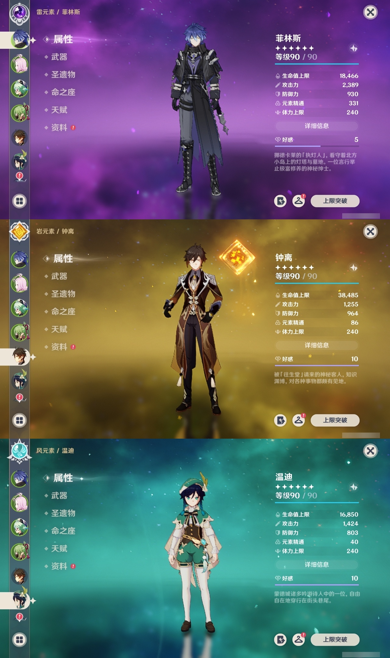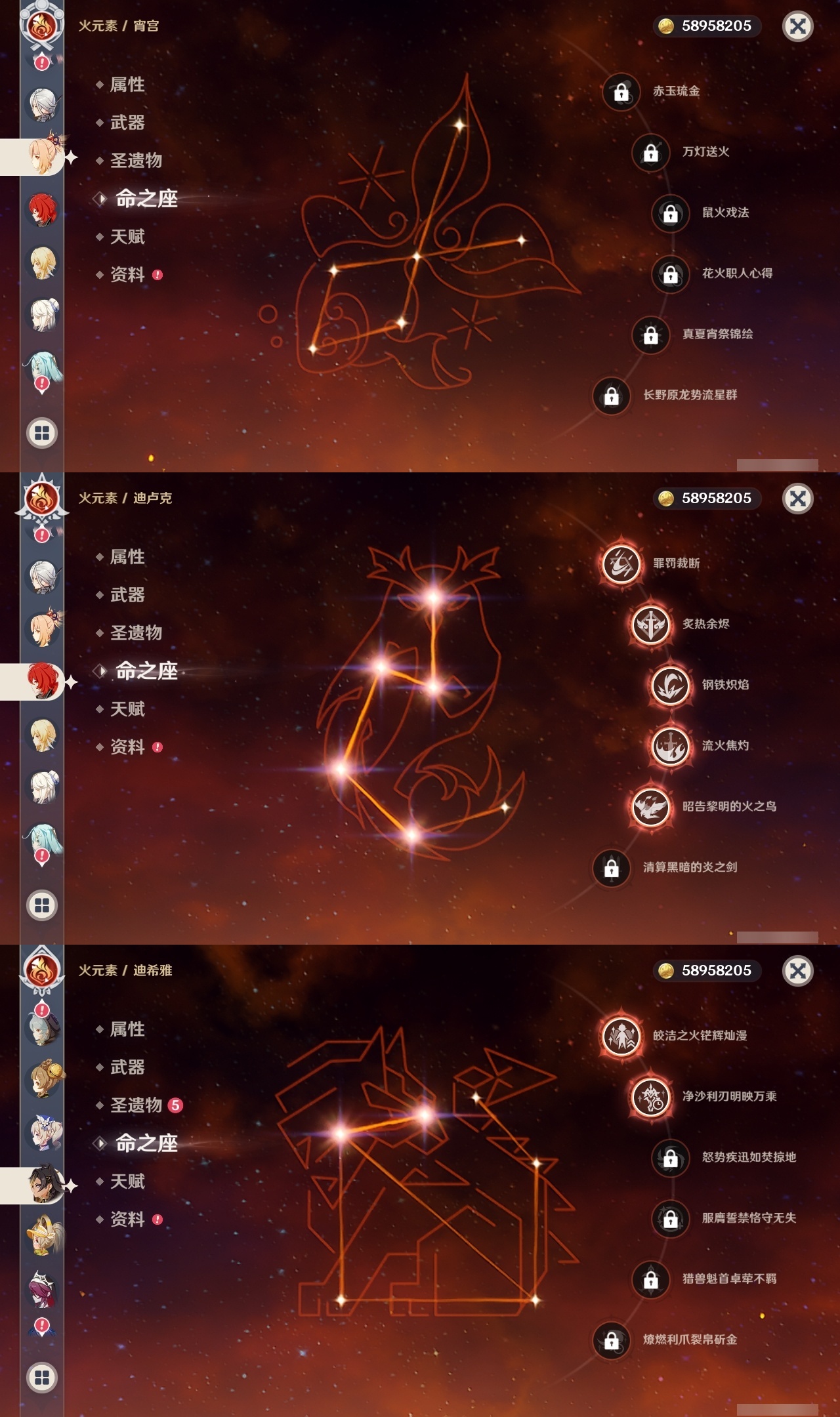 【原神】满命,冒险等级:60,五星数量:58,五星角色:琴 6命夜兰 6命提纳里 6命迪卢克 5命刻晴 4命雷电将军 3命迪希雅 2命那维莱特 2命芙宁娜 2命枫原万叶 2命七七 2命八重神子 2命纳西妲 2命阿蕾奇诺 1命莫娜 1命珊瑚宫心海希诺宁白术神里绫华温迪恰斯卡宵宫优菈钟离申鹤神里绫人妮露菲林斯流浪者甘雨胡桃__五星武器:阿莫斯之弓 5精松籁响起之时 3精和璞鸢 2精天空之傲 2精最初的大魔术万世流涌大典静水流涌之辉支离轮光血染荒城真语秘匣不灭月华苍古自由之誓飞雷之弦振风鹰剑护摩之杖狼的末路天空之刃天空之翼无工之剑雾切之回光薙草之稻光终末嗟叹之诗神乐之真意若水赤沙之杖千夜浮梦__四星角色:班尼特 6命行秋 6命九条裟罗 6命香菱 6命鹿野院平藏 6命珐露珊 6命凝光 6命迪奥娜 6命砂糖 6命瑶瑶 6命莱依拉 6命多莉 6命柯莱 6命芭芭拉 6命云堇 6命早柚 6命托马 6命重云 6命辛焱 6命诺艾尔 6命罗莎莉亚 6命雷泽 6命菲谢尔 6命北斗 6命琳妮特 6命赛索斯 6命坎蒂丝 5命五郎 5命嘉明 5命久岐忍 4命绮良良 4命烟绯 4命米卡 3命夏洛蒂 2命爱诺 2命卡齐娜 1命卡维 1命欧洛伦 1命菲米尼 1命夏沃蕾 1命伊法 1命埃洛伊