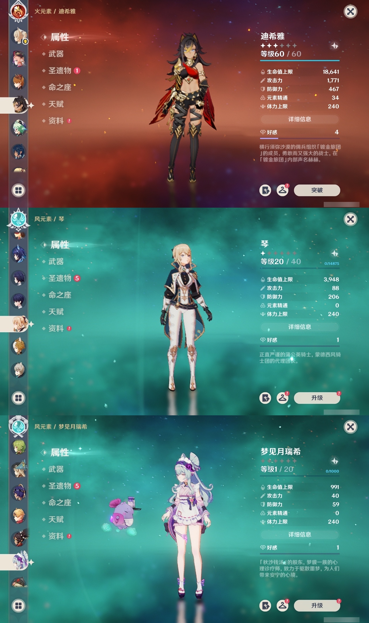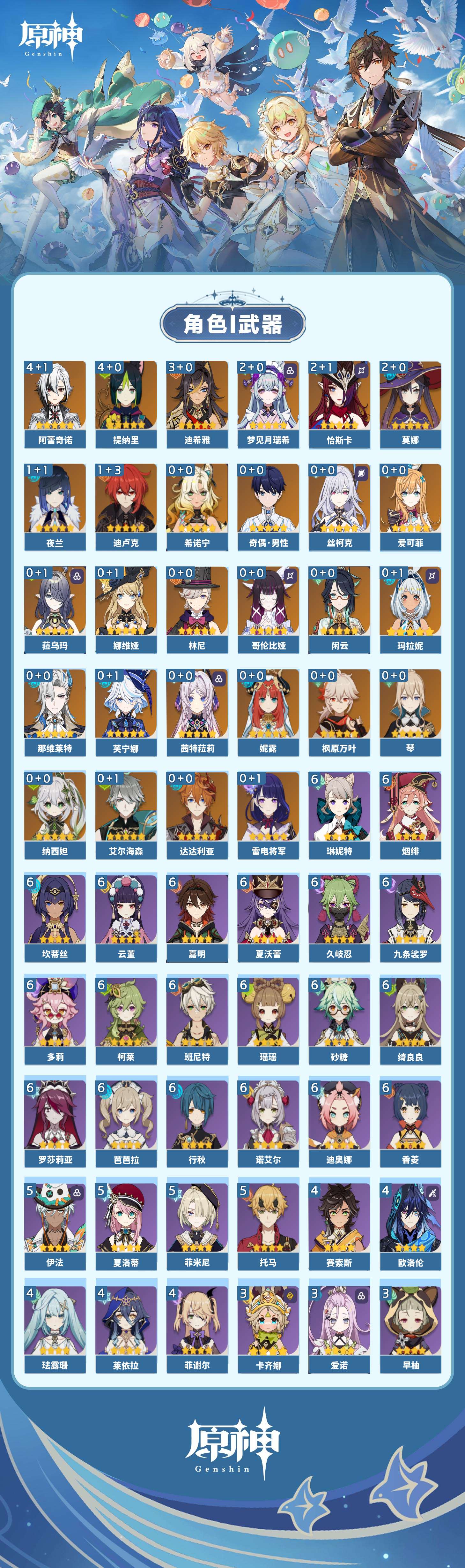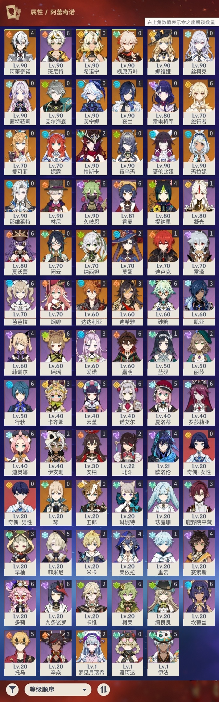 【原神】【lyys11346】冒险等级:60,五星数量:44,五星角色:阿蕾奇诺 4命提纳里 4命迪希雅 3命恰斯卡 2命梦见月瑞希 2命莫娜 2命迪卢克 1命夜兰 1命玛拉妮琴希诺宁茜特菈莉达达利亚林尼那维莱特芙宁娜娜维娅闲云爱可菲丝柯克妮露纳西妲菈乌玛艾尔海森哥伦比娅枫原万叶雷电将军__五星武器:狼的末路 3精冲浪时光星鹫赤羽静水流涌之辉裁断赤月之形纺夜天镜裁叶萃光风鹰剑天空之傲天空之脊天空之翼薙草之稻光若水赦罪__四星角色:班尼特 6命行秋 6命九条裟罗 6命香菱 6命久岐忍 6命迪奥娜 6命砂糖 6命绮良良 6命瑶瑶 6命坎蒂丝 6命多莉 6命柯莱 6命芭芭拉 6命云堇 6命烟绯 6命诺艾尔 6命罗莎莉亚 6命琳妮特 6命夏沃蕾 6命嘉明 6命托马 5命菲米尼 5命夏洛蒂 5命伊法 5命珐露珊 4命莱依拉 4命欧洛伦 4命菲谢尔 4命赛索斯 4命卡齐娜 3命鹿野院平藏 3命早柚 3命辛焱 3命爱诺 3命米卡 2命卡维 2命北斗 2命伊安珊 2命凝光 1命蓝砚 1命重云 1命雷泽 1命奇偶·女性奇偶·男性五郎