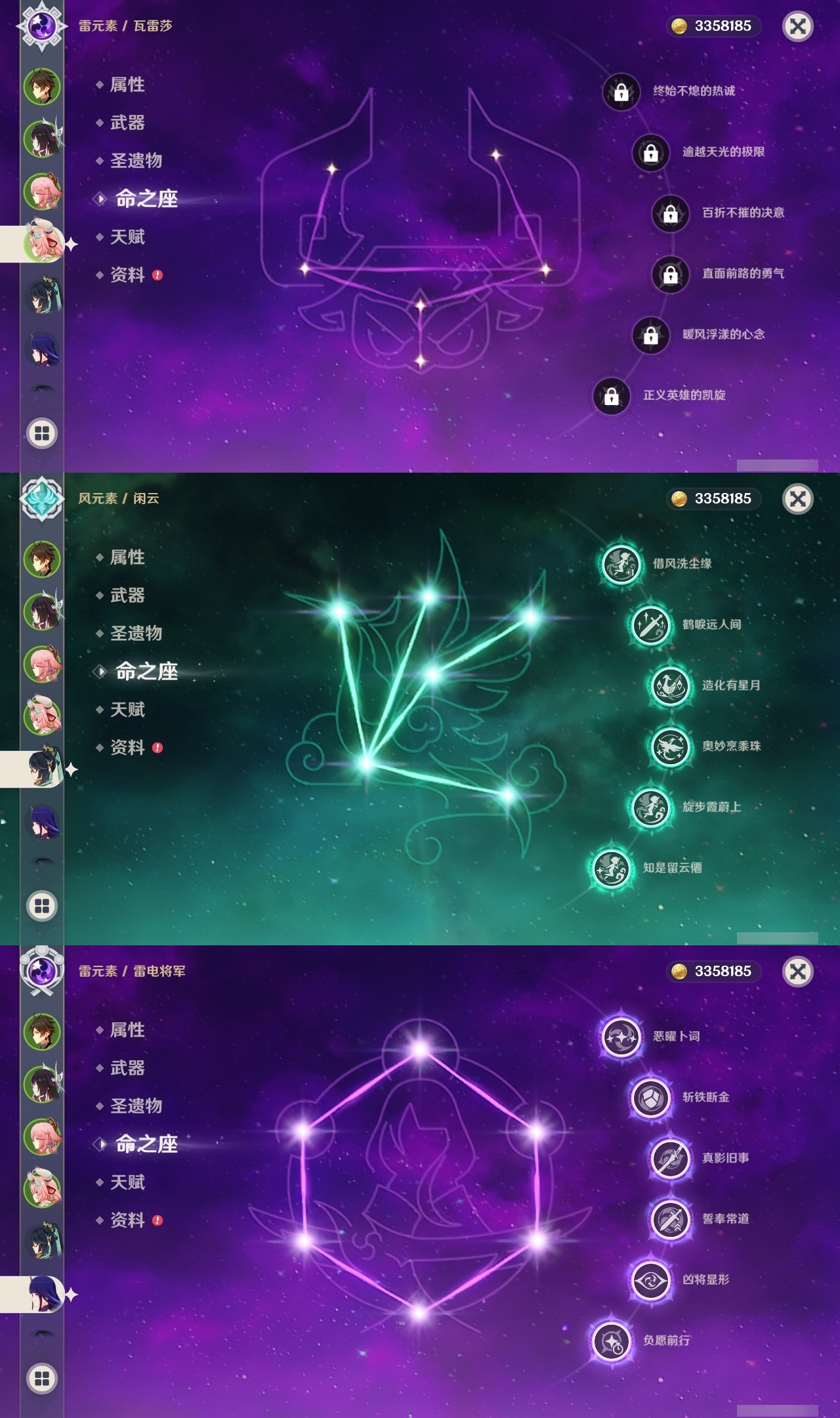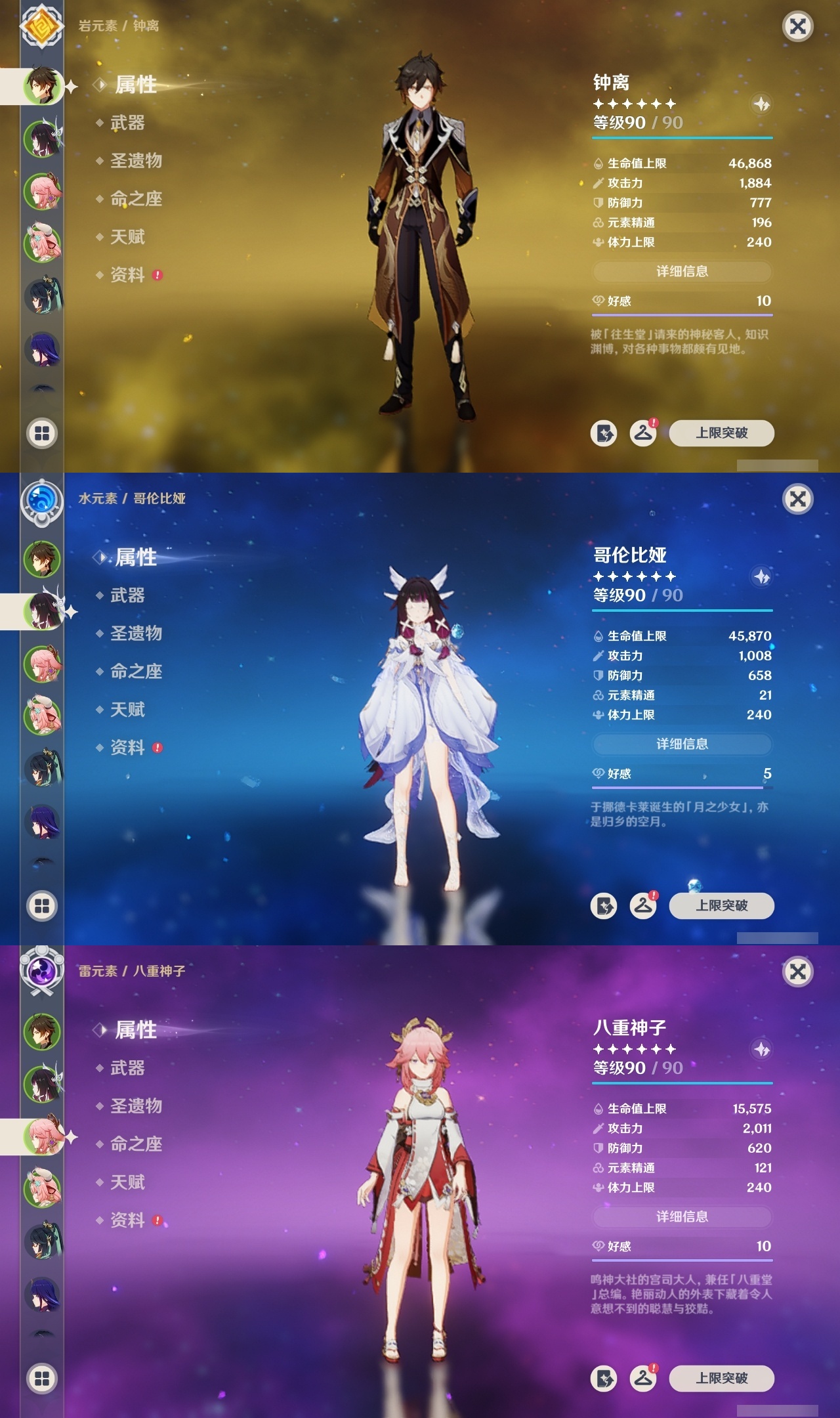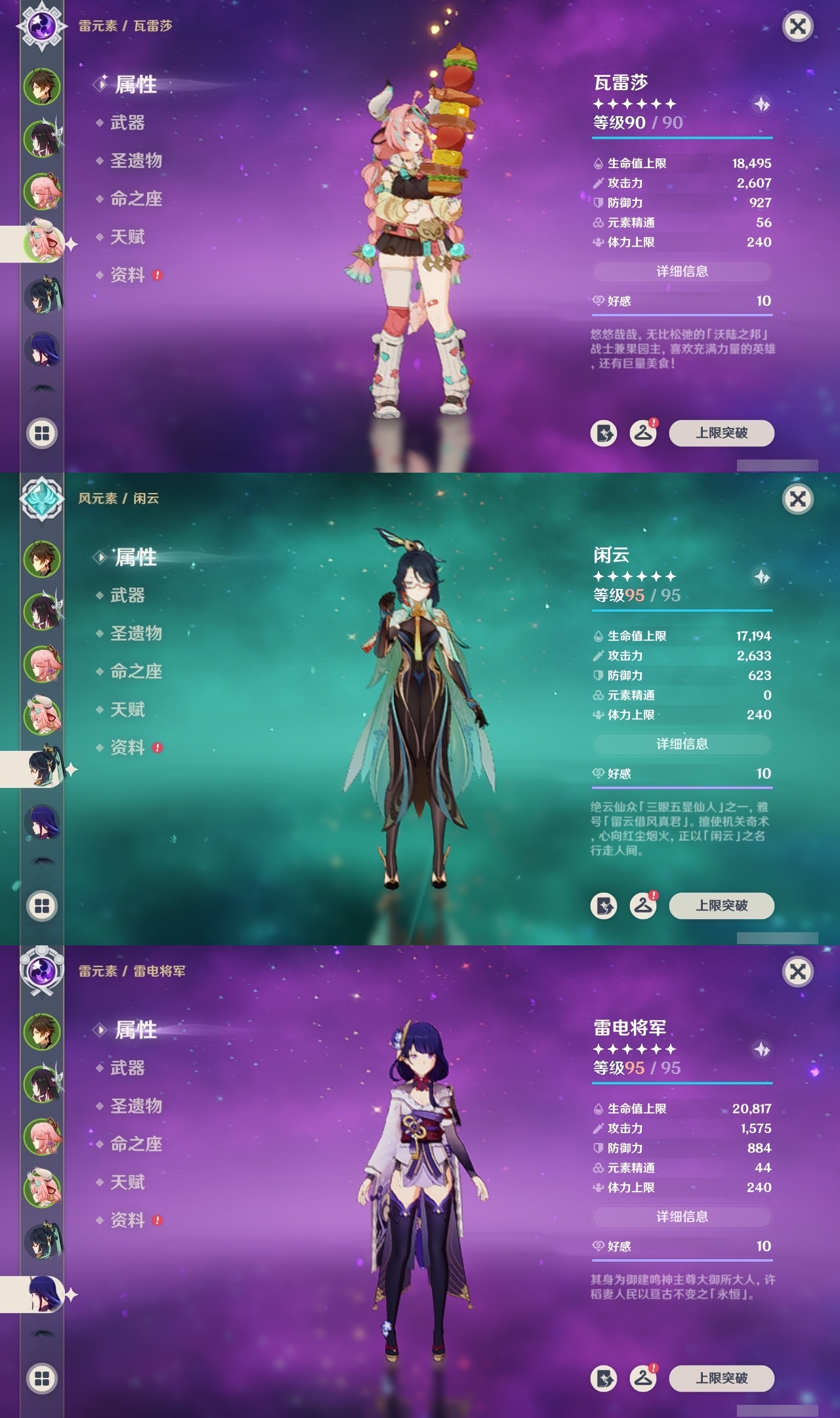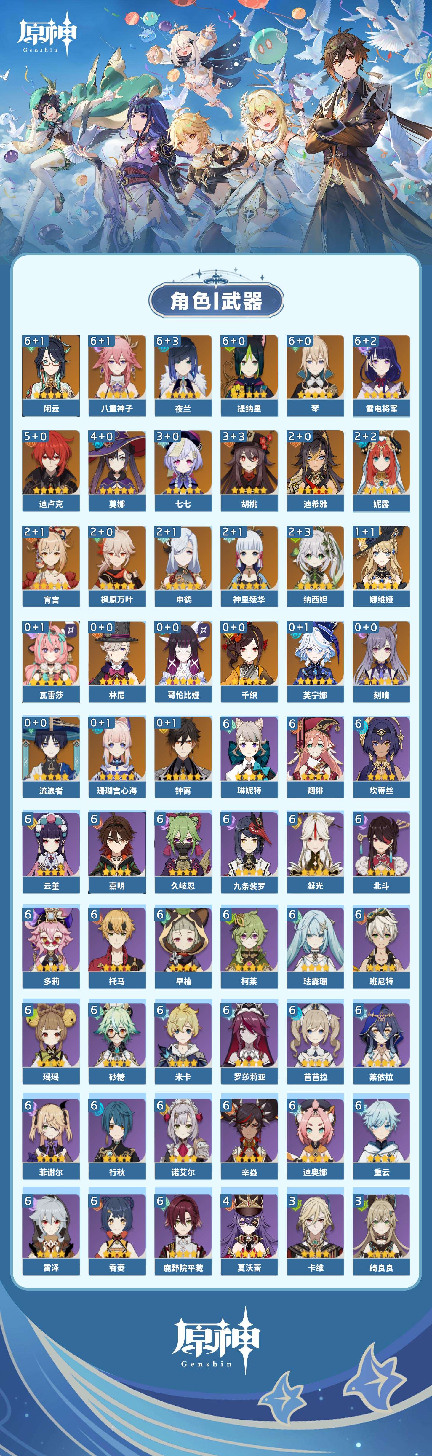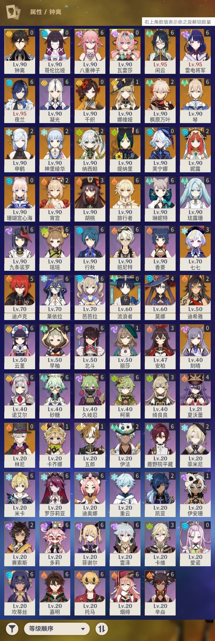 【原神】满命,冒险等级:60,五星数量:50,五星角色:闲云 6命雷电将军 6命琴 6命八重神子 6命夜兰 6命提纳里 6命迪卢克 5命莫娜 4命胡桃 3命七七 3命迪希雅 2命枫原万叶 2命神里绫华 2命宵宫 2命申鹤 2命妮露 2命纳西妲 2命娜维娅 1命珊瑚宫心海钟离瓦雷莎林尼芙宁娜千织流浪者哥伦比娅刻晴__五星武器:护摩之杖 3精若水 3精千夜浮梦 3精阿莫斯之弓 2精磐岩结绿 2精天空之傲 2精薙草之稻光 2精圣显之钥 2精溢彩心念静水流涌之辉裁断鹤鸣余音不灭月华飞雷之弦振风鹰剑天空之脊天空之卷天空之翼雾切之回光冬极白星息灾神乐之真意贯虹之槊__四星角色:班尼特 6命行秋 6命九条裟罗 6命香菱 6命久岐忍 6命鹿野院平藏 6命珐露珊 6命凝光 6命迪奥娜 6命砂糖 6命瑶瑶 6命莱依拉 6命米卡 6命坎蒂丝 6命多莉 6命柯莱 6命芭芭拉 6命云堇 6命早柚 6命托马 6命烟绯 6命重云 6命辛焱 6命诺艾尔 6命罗莎莉亚 6命雷泽 6命菲谢尔 6命北斗 6命琳妮特 6命嘉明 6命夏沃蕾 4命绮良良 3命卡维 3命菲米尼 2命伊法 2命赛索斯 2命卡齐娜 1命五郎 1命伊安珊 1命爱诺