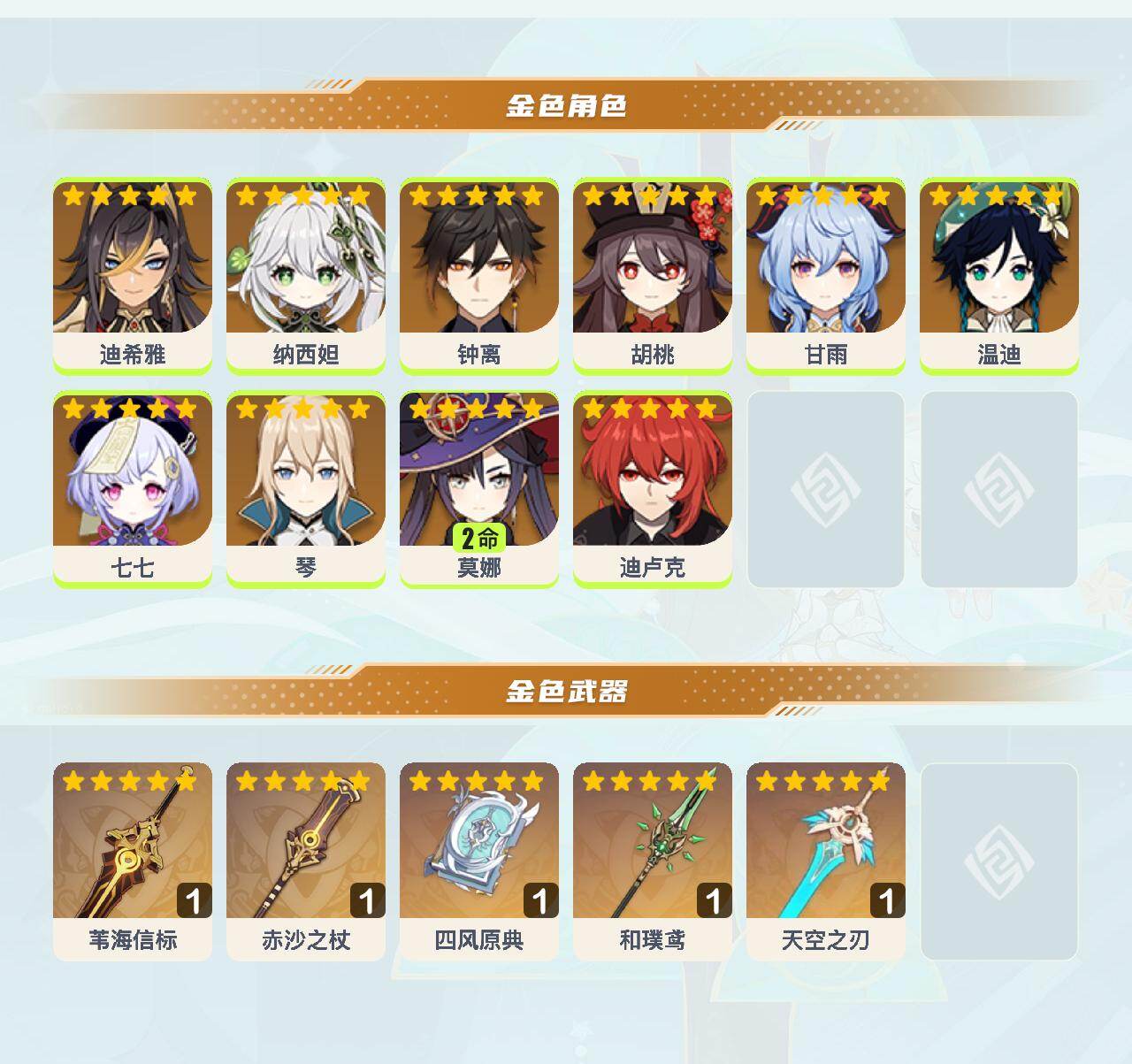 【ys1133】57级/17黄/女主/10个五星角色/5个五星武器/0命钟离/0命甘雨/0命胡桃/0命迪卢克/0命温迪/0命纳西妲/2命莫娜/0命琴/0命迪希雅/0命七七/精1四风原典/精1赤沙之杖/精1和璞鸢/精1天空之刃/精1苇海信标