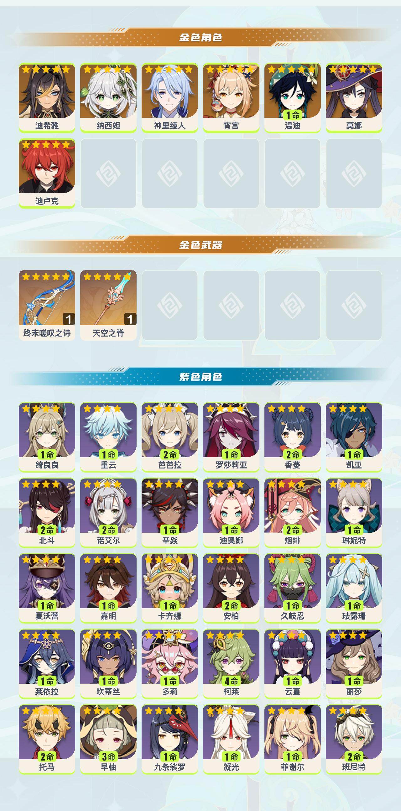 【ysz3112】50级/女主/8个五星角色/0命迪希雅/0命纳西妲/0命神里绫人/0命宵宫/1命温迪/0命迪卢克/0命莫娜/精1终末嗟叹之诗/精1天空之脊/0命卡齐娜/0命嘉明/1命夏沃蕾/0命琳妮特/1命绮良良/0命珐露珊/1命莱依拉/0命坎蒂丝/0命多莉/4命柯莱/1命久岐忍/0命云堇/2命托马/1命九条裟罗/3命早柚/2命烟绯/0命罗莎莉亚/1命辛焱/1命迪奥娜/0命菲谢尔/0命丽莎/2命北斗/2命香菱/2命安柏/2命班尼特/2命芭芭拉/1命凝光/2命诺艾尔/1命凯亚/0命重云