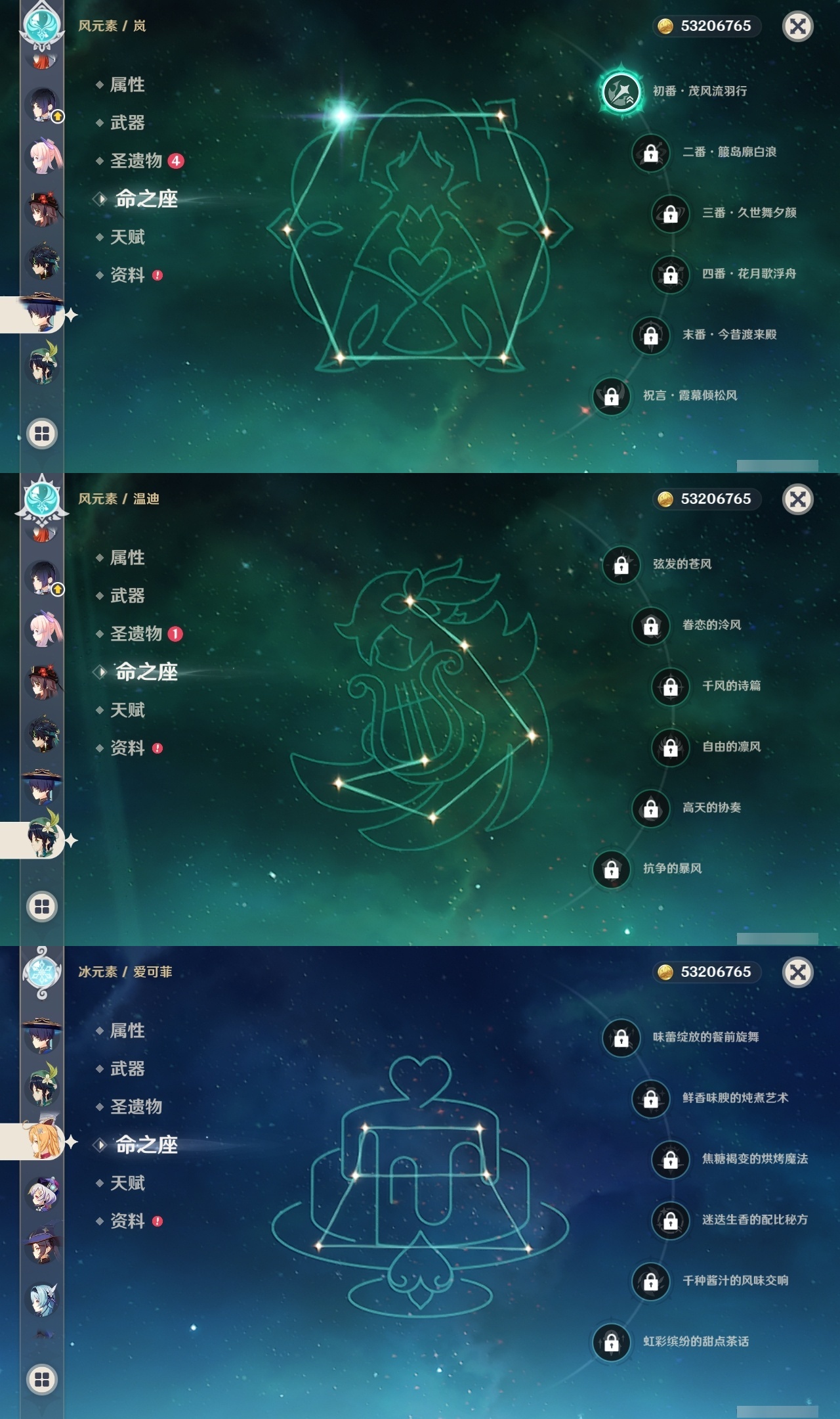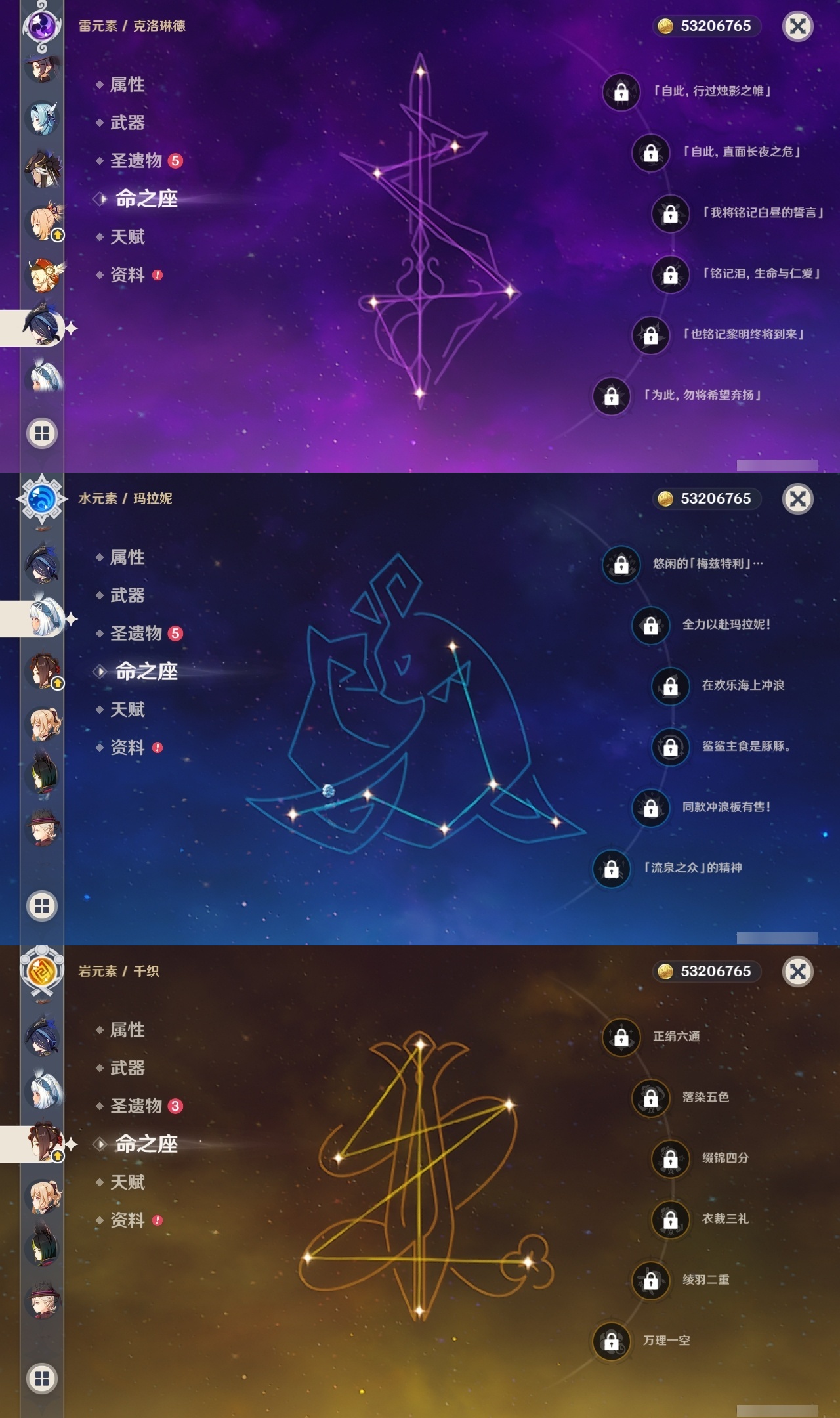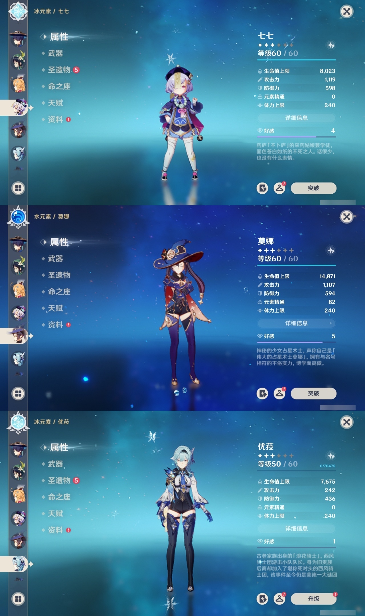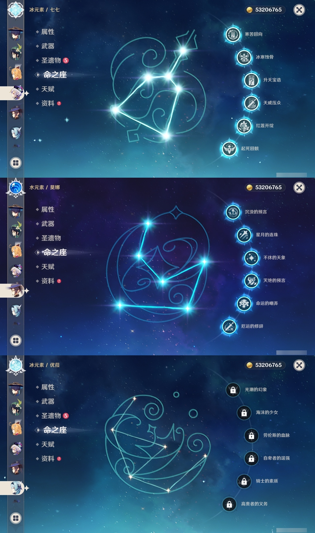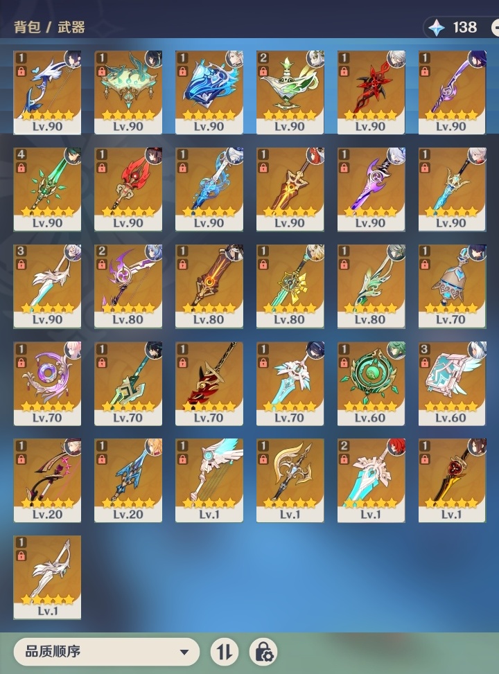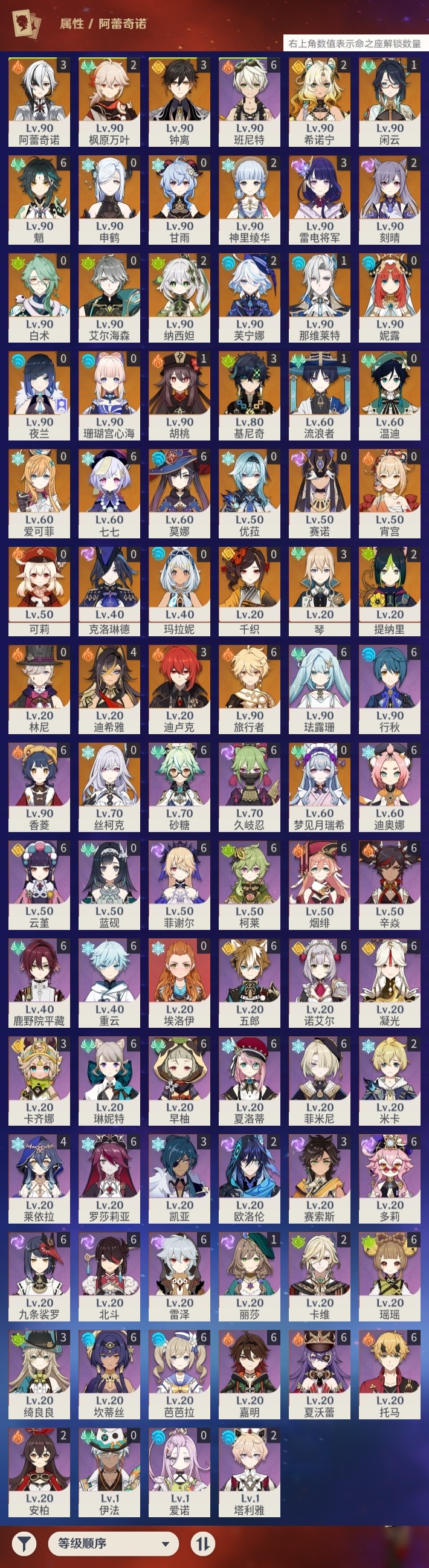 【原神】满命,冒险等级:60,五星数量:71,五星角色:魈 6命莫娜 6命七七 6命迪希雅 4命基尼奇 3命阿蕾奇诺 3命迪卢克 3命雷电将军 3命琴 3命钟离 3命希诺宁 2命芙宁娜 2命枫原万叶 2命刻晴 2命神里绫华 2命提纳里 2命纳西妲 2命那维莱特 1命闲云 1命胡桃 1命流浪者 1命玛拉妮珊瑚宫心海白术温迪宵宫优菈梦见月瑞希申鹤林尼夜兰千织赛诺爱可菲丝柯克妮露艾尔海森甘雨克洛琳德可莉__五星武器:和璞鸢 4精风鹰剑 3精天空之卷 3精飞雷之弦振 2精天空之傲 2精千夜浮梦 2精山王长牙岩峰巡歌碧落之珑最初的大魔术万世流涌大典静水流涌之辉裁断鹤鸣余音有乐御簾切赤月之形裁叶萃光图莱杜拉的回忆不灭月华苍古自由之誓护摩之杖天空之刃天空之翼雾切之回光薙草之稻光赤角石溃杵息灾若水赤沙之杖圣显之钥__四星角色:班尼特 6命行秋 6命九条裟罗 6命香菱 6命久岐忍 6命鹿野院平藏 6命珐露珊 6命凝光 6命迪奥娜 6命砂糖 6命瑶瑶 6命坎蒂丝 6命多莉 6命柯莱 6命芭芭拉 6命云堇 6命早柚 6命托马 6命五郎 6命烟绯 6命重云 6命辛焱 6命诺艾尔 6命罗莎莉亚 6命雷泽 6命菲谢尔 6命北斗 6命菲米尼 6命琳妮特 6命夏洛蒂 6命夏沃蕾 6命嘉明 6命莱依拉 4命卡齐娜 3命绮良良 3命赛索斯 3命米卡 2命卡维 2命欧洛伦 2命塔利雅 2命埃洛伊蓝砚伊法爱诺