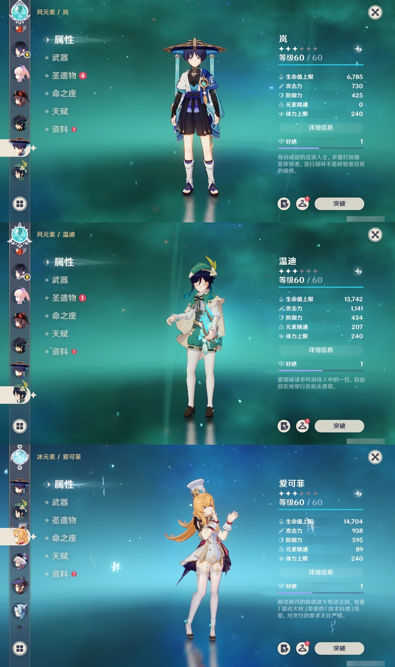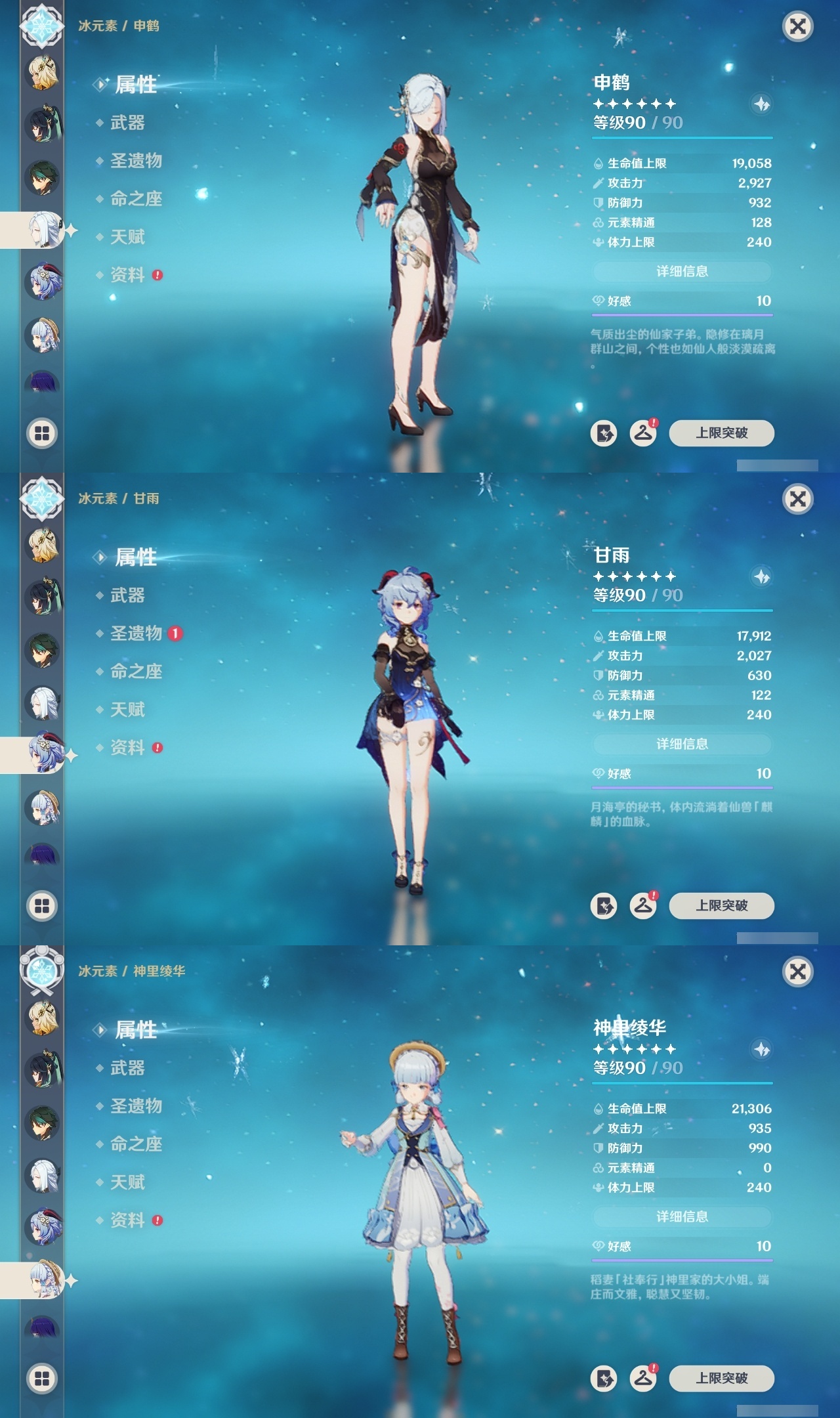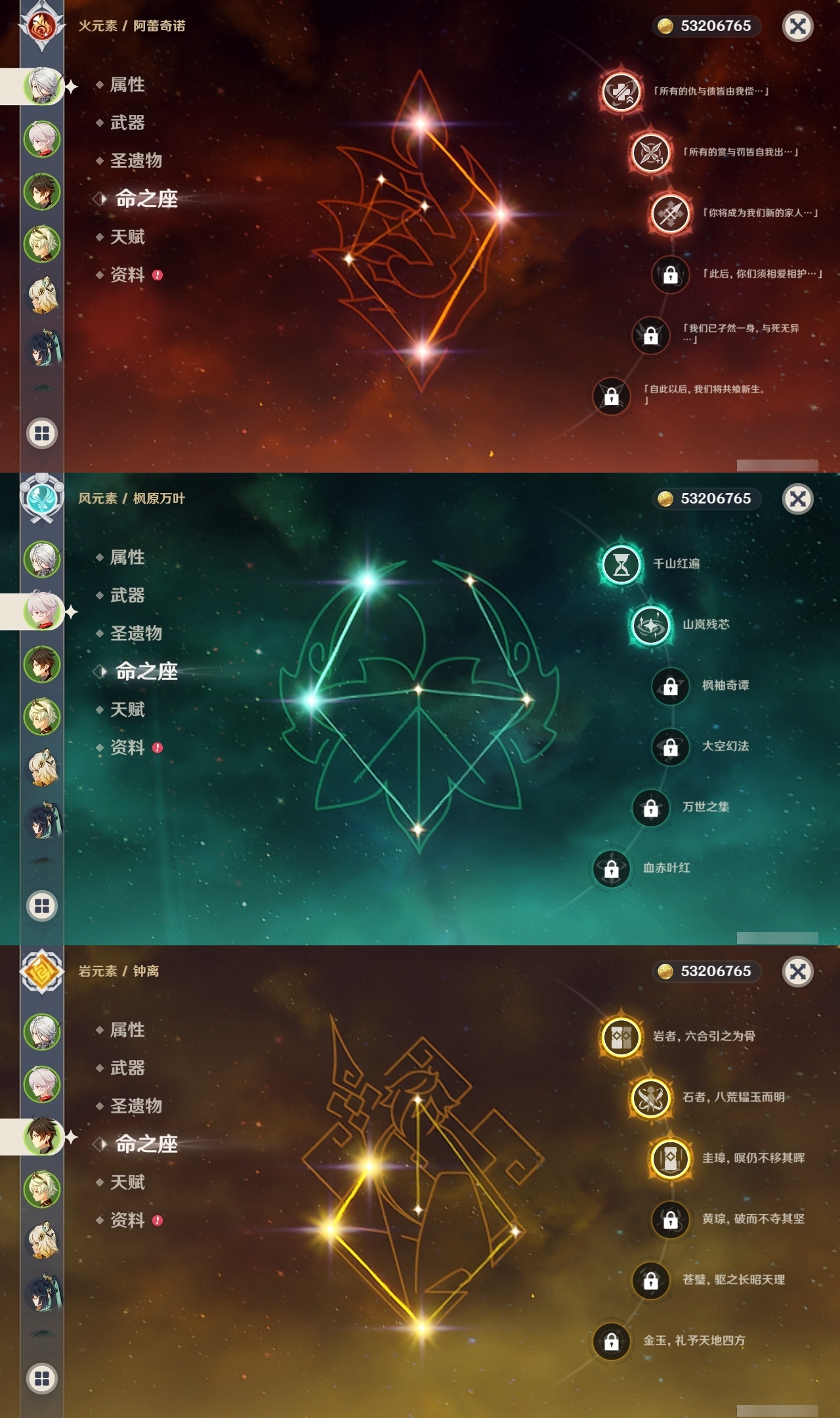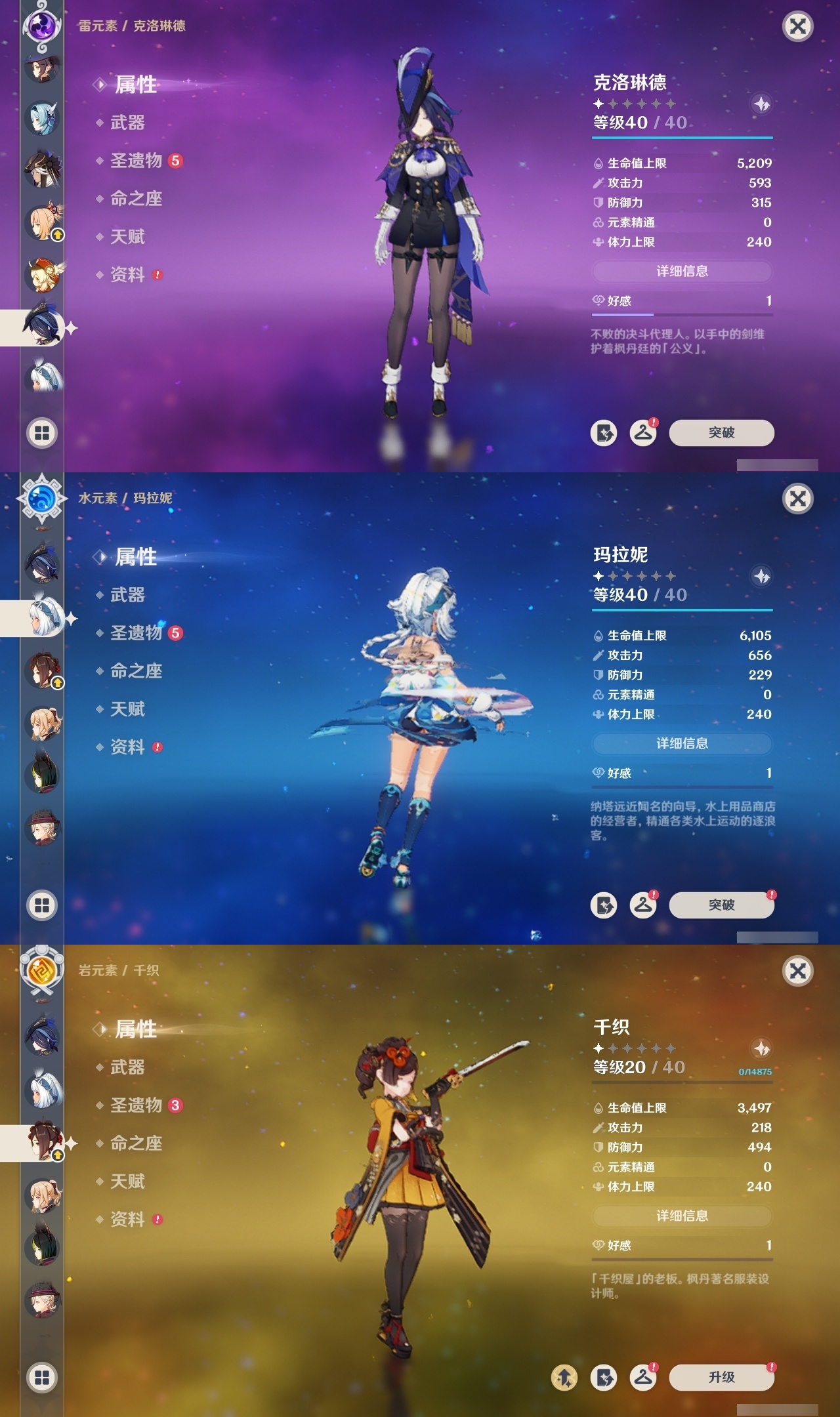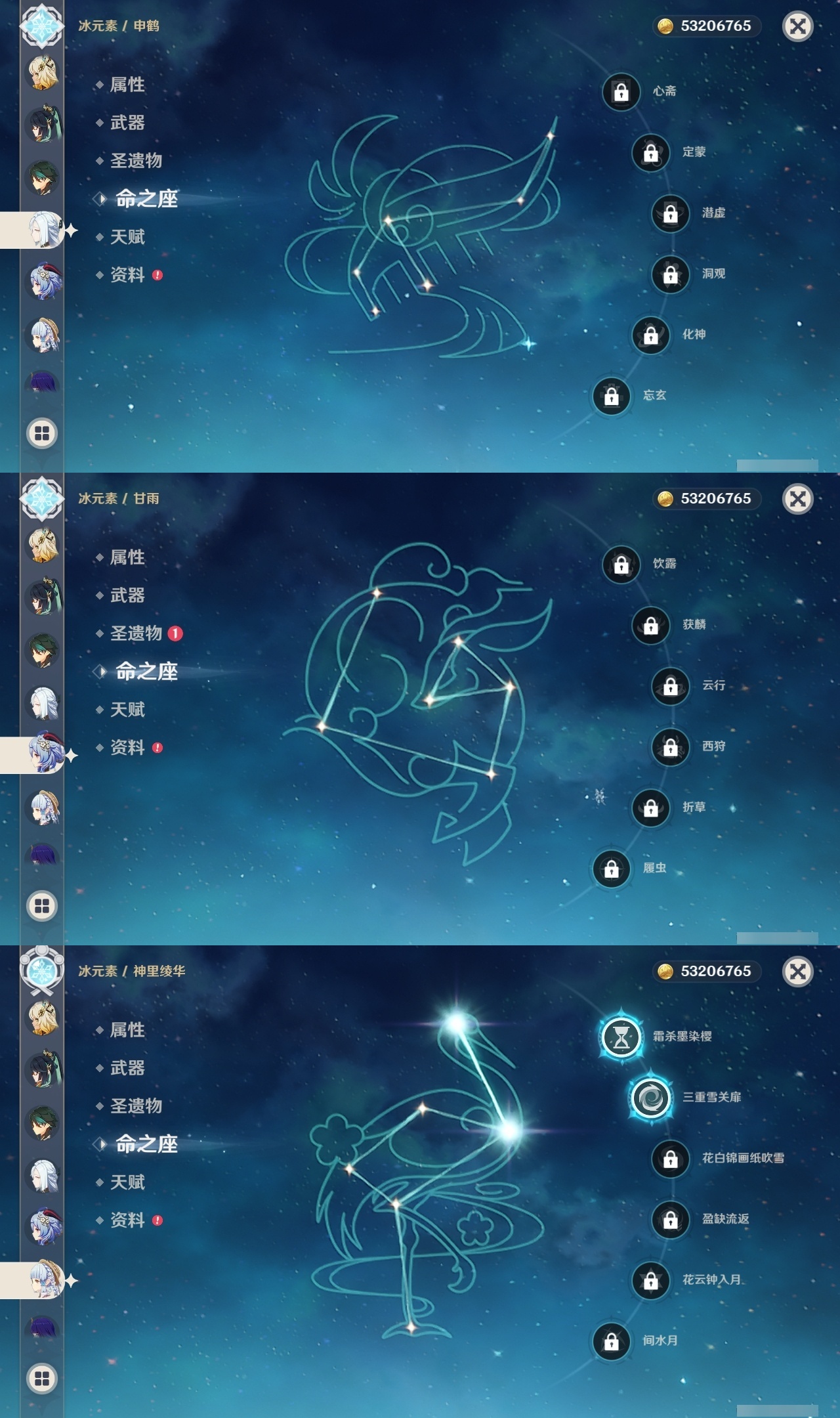 【原神】满命,冒险等级:60,五星数量:71,五星角色:魈 6命莫娜 6命七七 6命迪希雅 4命基尼奇 3命阿蕾奇诺 3命迪卢克 3命雷电将军 3命琴 3命钟离 3命希诺宁 2命芙宁娜 2命枫原万叶 2命刻晴 2命神里绫华 2命提纳里 2命纳西妲 2命那维莱特 1命闲云 1命胡桃 1命流浪者 1命玛拉妮珊瑚宫心海白术温迪宵宫优菈梦见月瑞希申鹤林尼夜兰千织赛诺爱可菲丝柯克妮露艾尔海森甘雨克洛琳德可莉__五星武器:和璞鸢 4精风鹰剑 3精天空之卷 3精飞雷之弦振 2精天空之傲 2精千夜浮梦 2精山王长牙岩峰巡歌碧落之珑最初的大魔术万世流涌大典静水流涌之辉裁断鹤鸣余音有乐御簾切赤月之形裁叶萃光图莱杜拉的回忆不灭月华苍古自由之誓护摩之杖天空之刃天空之翼雾切之回光薙草之稻光赤角石溃杵息灾若水赤沙之杖圣显之钥__四星角色:班尼特 6命行秋 6命九条裟罗 6命香菱 6命久岐忍 6命鹿野院平藏 6命珐露珊 6命凝光 6命迪奥娜 6命砂糖 6命瑶瑶 6命坎蒂丝 6命多莉 6命柯莱 6命芭芭拉 6命云堇 6命早柚 6命托马 6命五郎 6命烟绯 6命重云 6命辛焱 6命诺艾尔 6命罗莎莉亚 6命雷泽 6命菲谢尔 6命北斗 6命菲米尼 6命琳妮特 6命夏洛蒂 6命夏沃蕾 6命嘉明 6命莱依拉 4命卡齐娜 3命绮良良 3命赛索斯 3命米卡 2命卡维 2命欧洛伦 2命塔利雅 2命埃洛伊蓝砚伊法爱诺