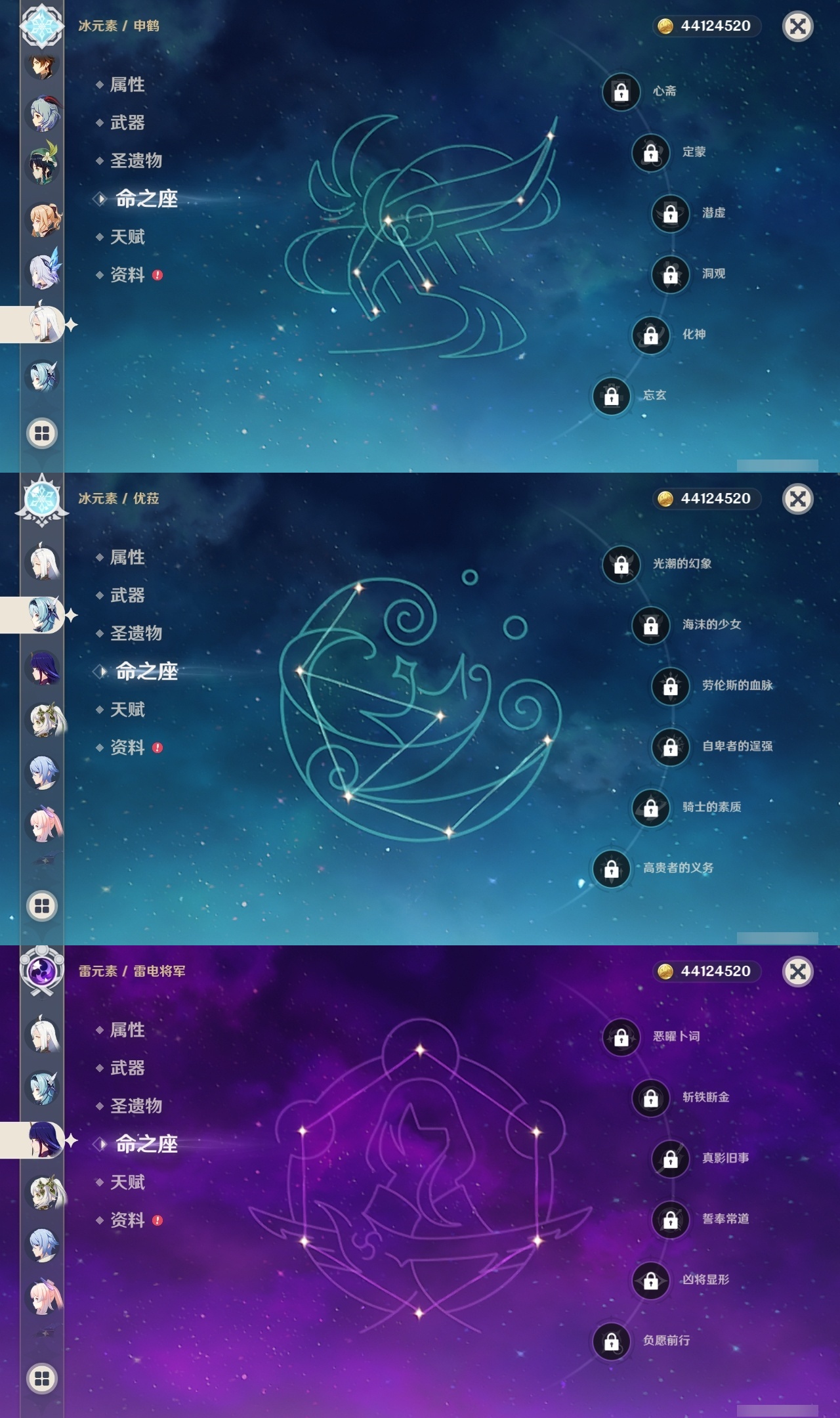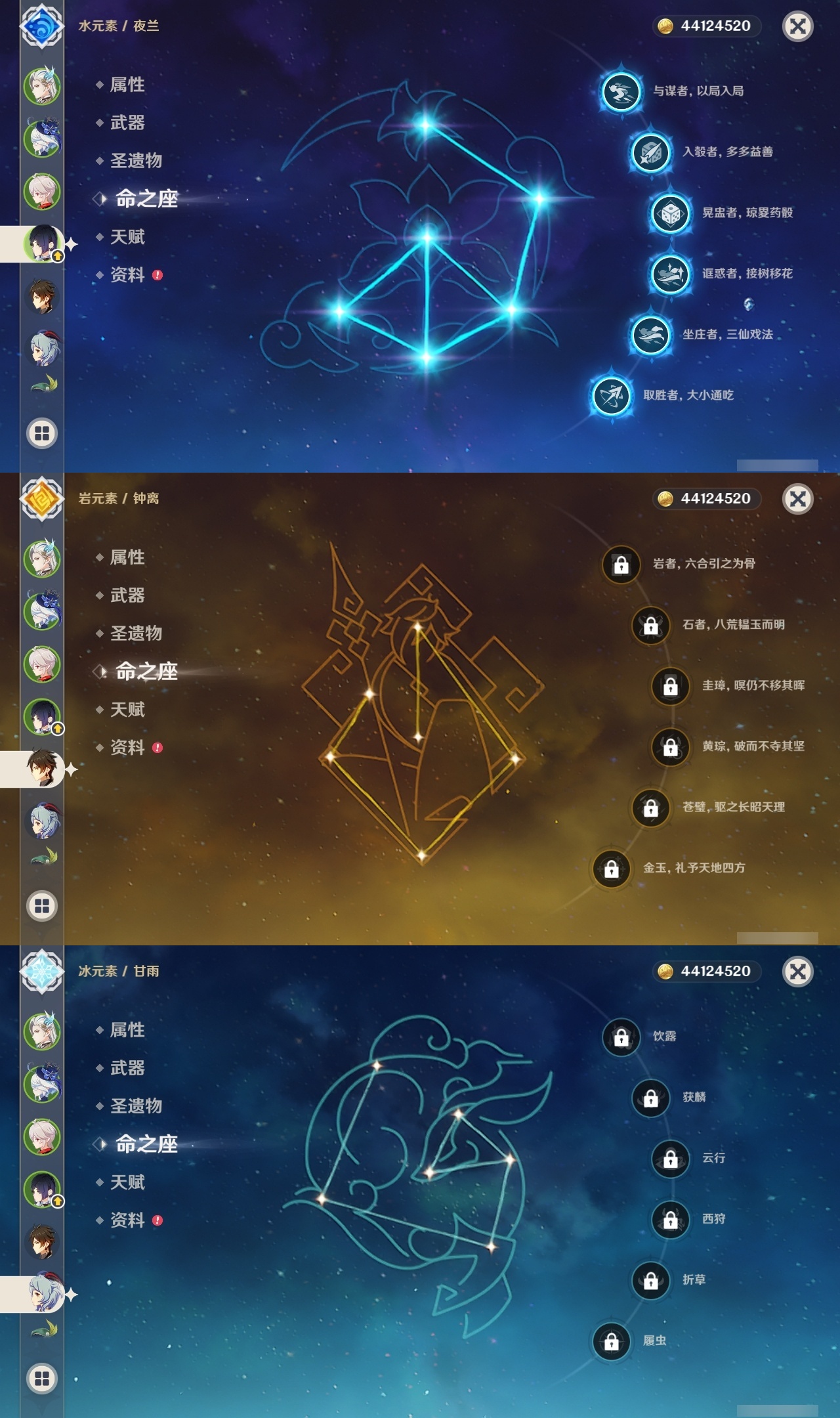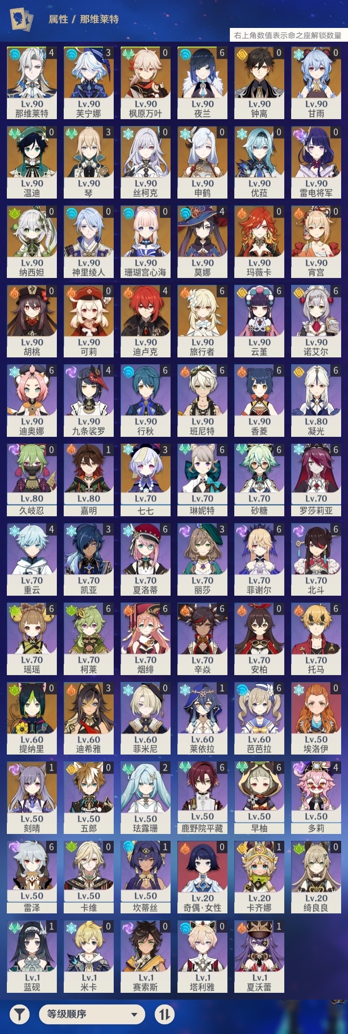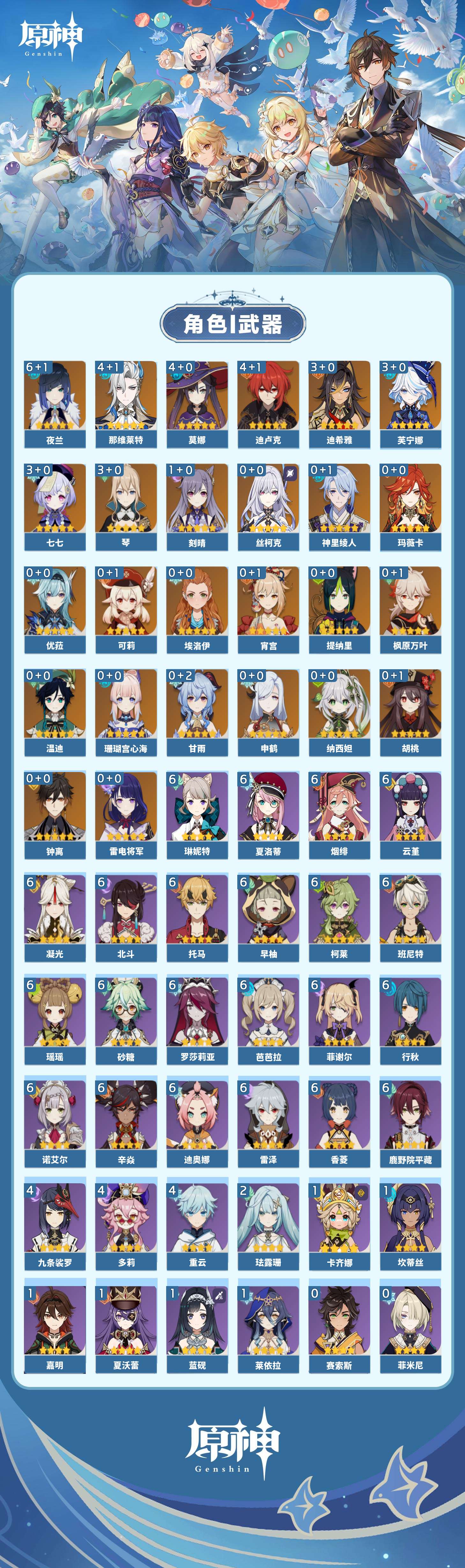 【原神】【lyys11358】冒险等级:60,五星数量:38,五星角色:夜兰 6命那维莱特 4命迪卢克 4命莫娜 4命迪希雅 3命芙宁娜 3命七七 3命琴 3命刻晴 1命珊瑚宫心海温迪玛薇卡宵宫优菈钟离申鹤神里绫人提纳里丝柯克纳西妲枫原万叶甘雨胡桃可莉雷电将军__五星武器:阿莫斯之弓 2精万世流涌大典苍古自由之誓飞雷之弦振护摩之杖狼的末路四风原典天空之傲天空之卷波乱月白经津若水__四星角色:班尼特 6命行秋 6命香菱 6命鹿野院平藏 6命凝光 6命迪奥娜 6命砂糖 6命瑶瑶 6命柯莱 6命芭芭拉 6命云堇 6命早柚 6命托马 6命烟绯 6命辛焱 6命诺艾尔 6命罗莎莉亚 6命雷泽 6命菲谢尔 6命北斗 6命琳妮特 6命夏洛蒂 6命九条裟罗 4命多莉 4命重云 4命珐露珊 2命卡齐娜 1命莱依拉 1命坎蒂丝 1命蓝砚 1命夏沃蕾 1命嘉明 1命埃洛伊奇偶·女性久岐忍绮良良米卡卡维五郎菲米尼塔利雅赛索斯