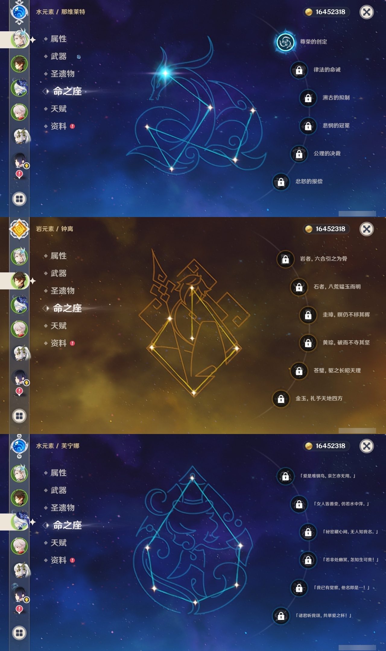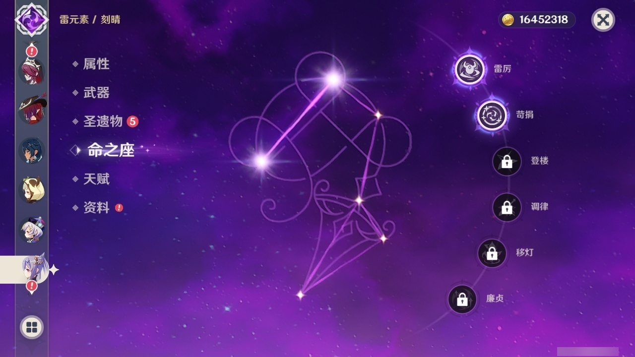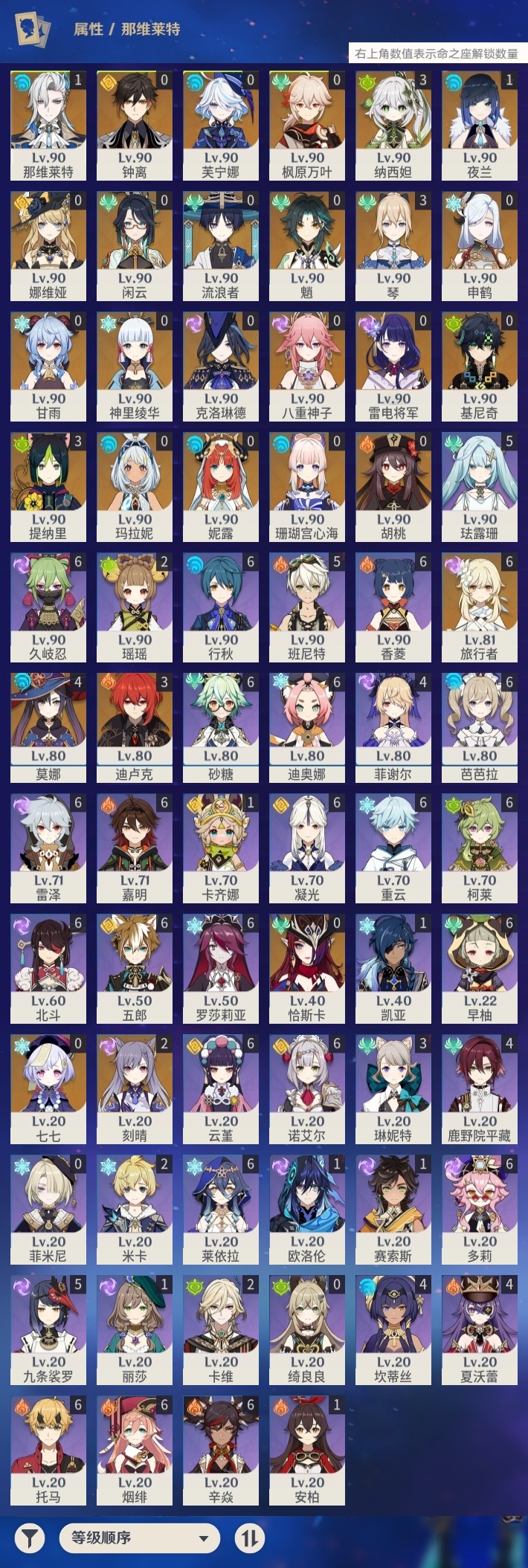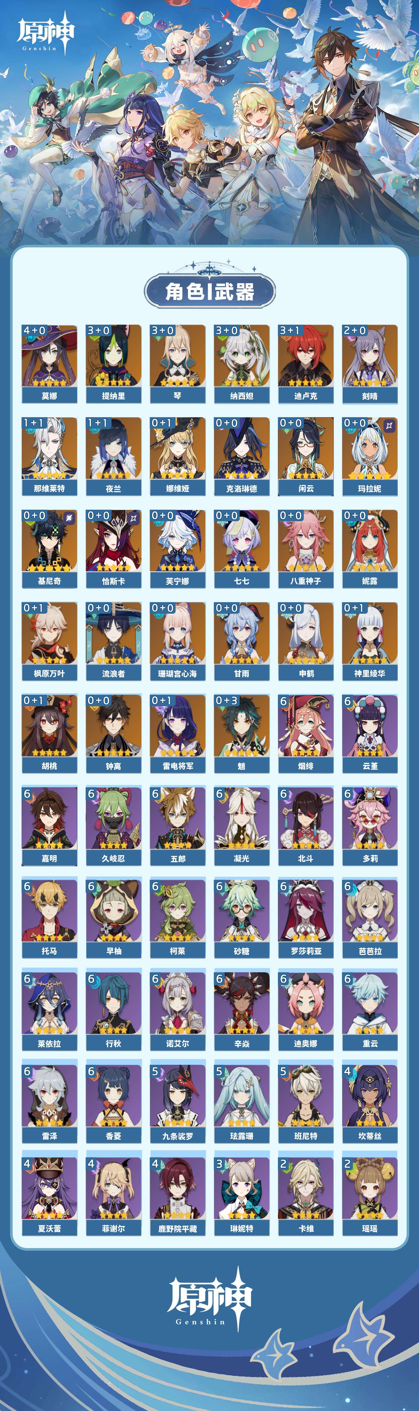 【原神】【lyys11368】冒险等级:60,五星数量:43,五星角色:莫娜 4命迪卢克 3命琴 3命提纳里 3命纳西妲 3命刻晴 2命那维莱特 1命夜兰 1命七七玛拉妮基尼奇珊瑚宫心海神里绫华恰斯卡钟离申鹤八重神子芙宁娜娜维娅闲云妮露流浪者枫原万叶甘雨魈胡桃克洛琳德雷电将军__五星武器:和璞鸢 3精最初的大魔术万世流涌大典裁断苍古自由之誓风鹰剑护摩之杖狼的末路四风原典天空之傲天空之翼无工之剑雾切之回光薙草之稻光若水__四星角色:行秋 6命香菱 6命久岐忍 6命凝光 6命迪奥娜 6命砂糖 6命莱依拉 6命多莉 6命柯莱 6命芭芭拉 6命云堇 6命早柚 6命托马 6命五郎 6命烟绯 6命重云 6命辛焱 6命诺艾尔 6命罗莎莉亚 6命雷泽 6命北斗 6命嘉明 6命班尼特 5命九条裟罗 5命珐露珊 5命鹿野院平藏 4命坎蒂丝 4命菲谢尔 4命夏沃蕾 4命琳妮特 3命瑶瑶 2命米卡 2命卡维 2命卡齐娜 1命欧洛伦 1命赛索斯 1命绮良良菲米尼