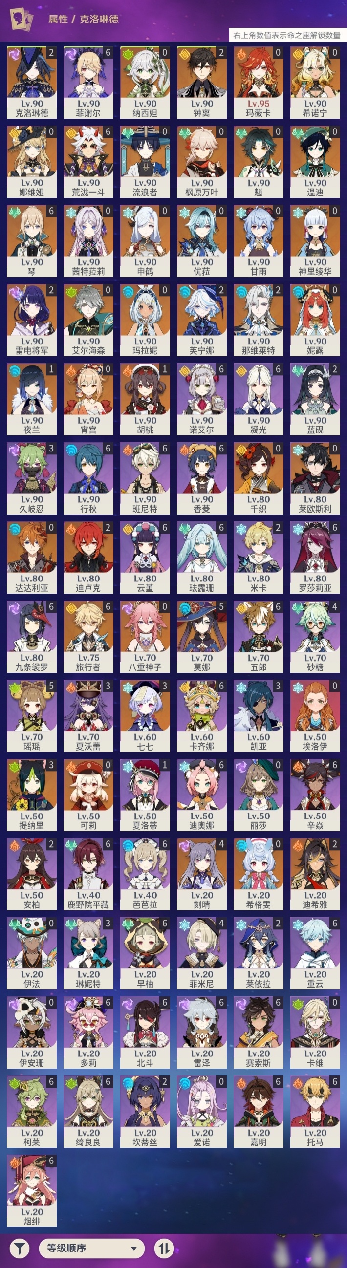 【原神】【lyys11374】冒险等级:60,五星数量:59,五星角色:琴 6命荒泷一斗 6命莫娜 5命刻晴 4命七七 3命提纳里 3命迪希雅 2命那维莱特 2命芙宁娜 2命迪卢克 2命雷电将军 2命钟离 2命克洛琳德 2命胡桃 1命夜兰 1命玛拉妮希诺宁神里绫华温迪玛薇卡茜特菈莉宵宫优菈达达利亚申鹤八重神子莱欧斯利娜维娅千织妮露纳西妲艾尔海森流浪者枫原万叶甘雨魈希格雯可莉__五星武器:阿莫斯之弓 3精祭星者之望焚曜千阳万世流涌大典裁断和璞鸢护摩之杖松籁响起之时天空之傲天空之卷天空之刃天空之翼无工之剑雾切之回光薙草之稻光赤角石溃杵神乐之真意波乱月白经津若水赤沙之杖__四星角色:卡齐娜 6命班尼特 6命行秋 6命九条裟罗 6命香菱 6命鹿野院平藏 6命珐露珊 6命凝光 6命迪奥娜 6命绮良良 6命多莉 6命柯莱 6命芭芭拉 6命云堇 6命早柚 6命托马 6命五郎 6命烟绯 6命重云 6命辛焱 6命诺艾尔 6命罗莎莉亚 6命雷泽 6命菲谢尔 6命北斗 6命嘉明 6命赛索斯 6命瑶瑶 5命砂糖 4命菲米尼 4命久岐忍 3命琳妮特 3命夏沃蕾 3命莱依拉 2命米卡 2命坎蒂丝 2命蓝砚 2命夏洛蒂 1命埃洛伊卡维伊法伊安珊爱诺