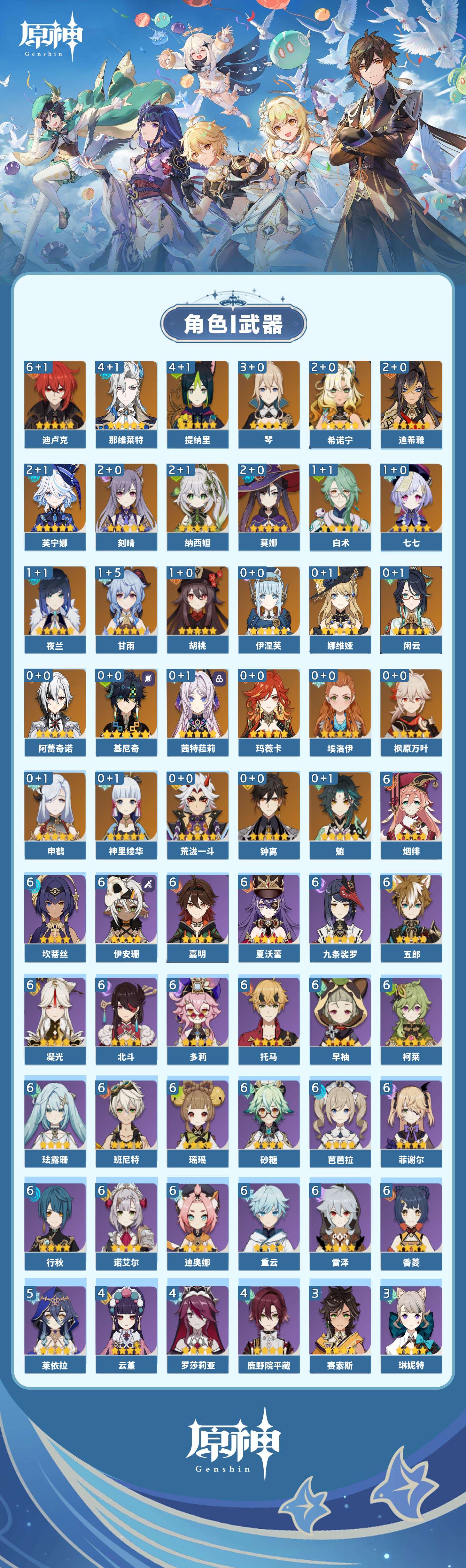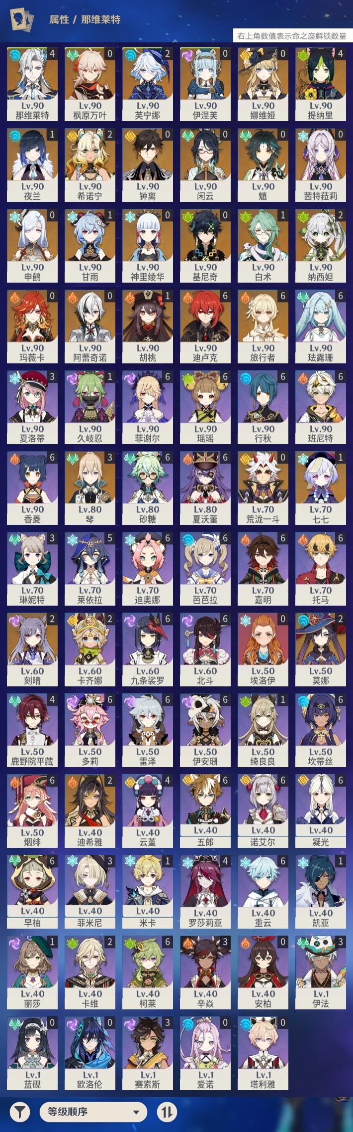 【原神】【lyys11380】冒险等级:60,五星数量:51,五星角色:迪卢克 6命那维莱特 4命提纳里 4命琴 3命希诺宁 2命迪希雅 2命芙宁娜 2命刻晴 2命莫娜 2命纳西妲 2命白术 1命甘雨 1命胡桃 1命七七 1命夜兰 1命基尼奇神里绫华玛薇卡茜特菈莉钟离荒泷一斗申鹤娜维娅闲云阿蕾奇诺伊涅芙枫原万叶魈__五星武器:阿莫斯之弓 5精柔灯挽歌碧落之珑祭星者之望万世流涌大典静水流涌之辉裁断鹤鸣余音帷间夜曲尘世之锁飞雷之弦振和璞鸢狼的末路天空之傲天空之卷天空之翼雾切之回光薙草之稻光息灾若水猎人之径千夜浮梦__四星角色:班尼特 6命行秋 6命九条裟罗 6命香菱 6命珐露珊 6命凝光 6命迪奥娜 6命砂糖 6命瑶瑶 6命坎蒂丝 6命多莉 6命柯莱 6命芭芭拉 6命早柚 6命托马 6命五郎 6命烟绯 6命重云 6命诺艾尔 6命雷泽 6命菲谢尔 6命北斗 6命夏沃蕾 6命嘉明 6命伊安珊 6命莱依拉 5命鹿野院平藏 4命云堇 4命罗莎莉亚 4命辛焱 3命菲米尼 3命琳妮特 3命夏洛蒂 3命伊法 3命赛索斯 3命卡齐娜 2命卡维 2命久岐忍 1命绮良良 1命米卡 1命埃洛伊欧洛伦蓝砚塔利雅爱诺
