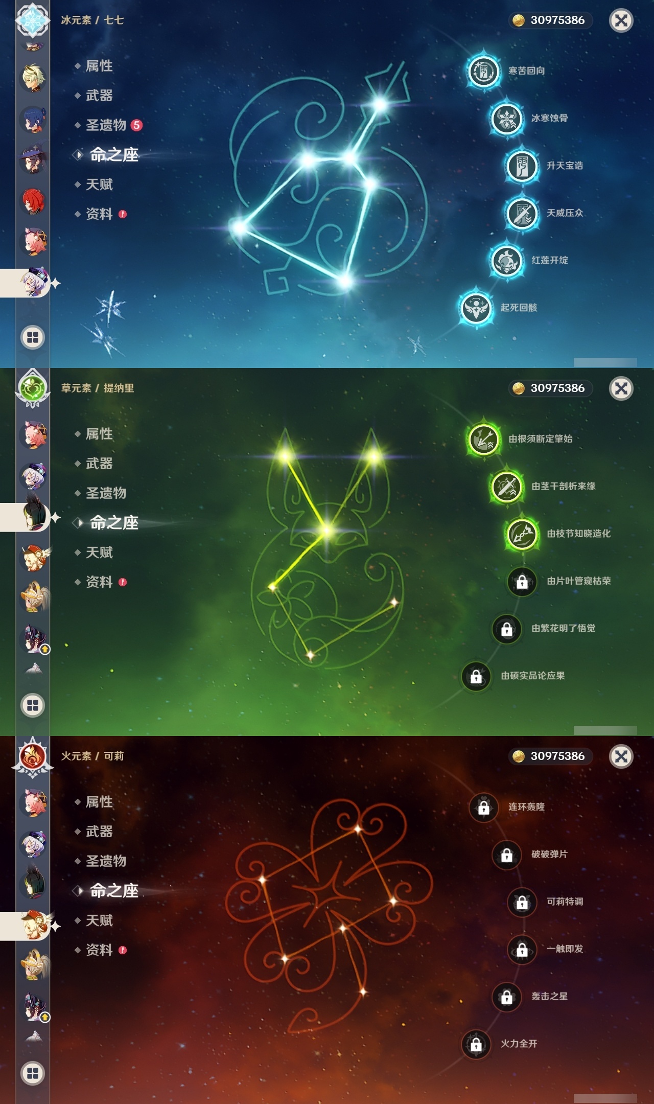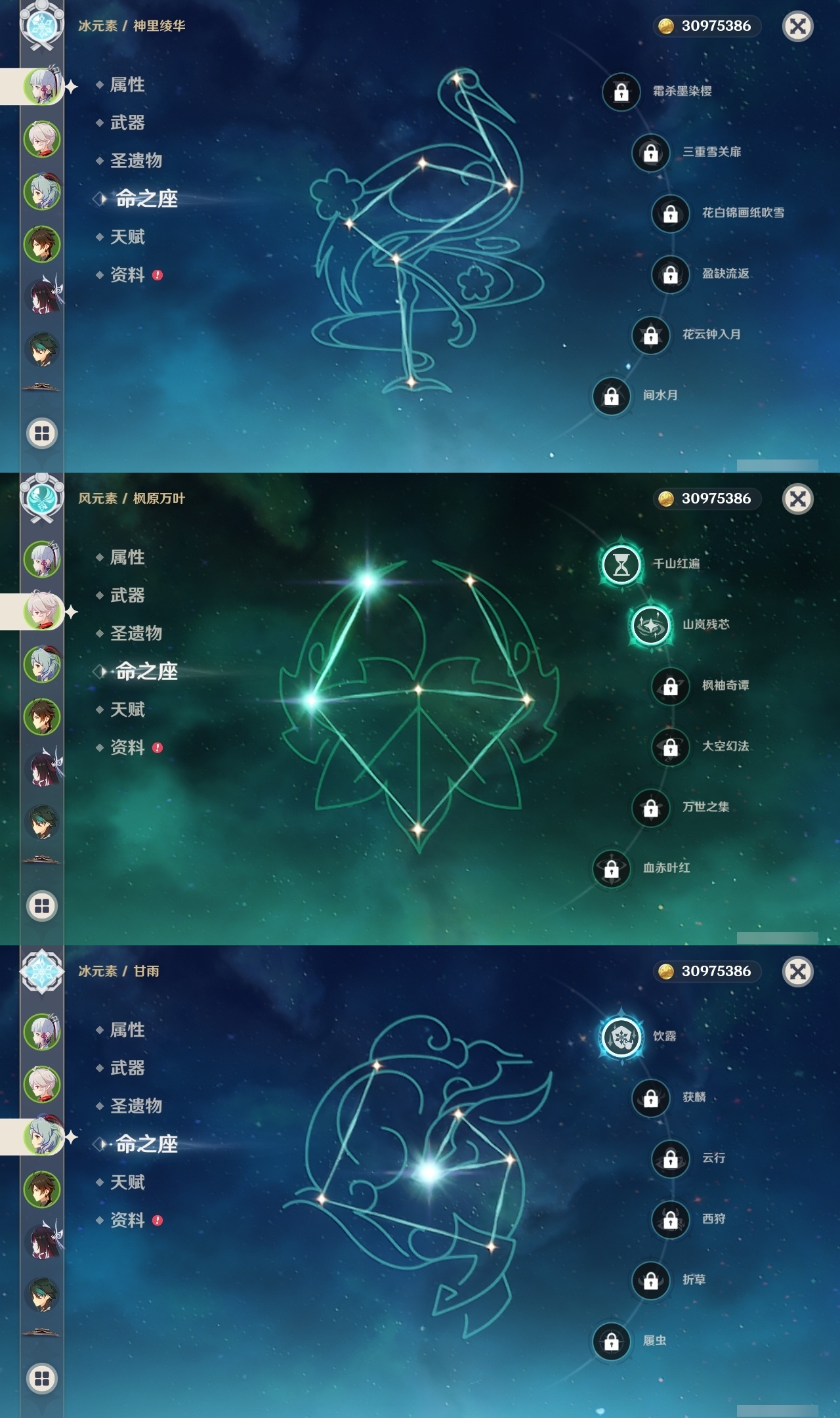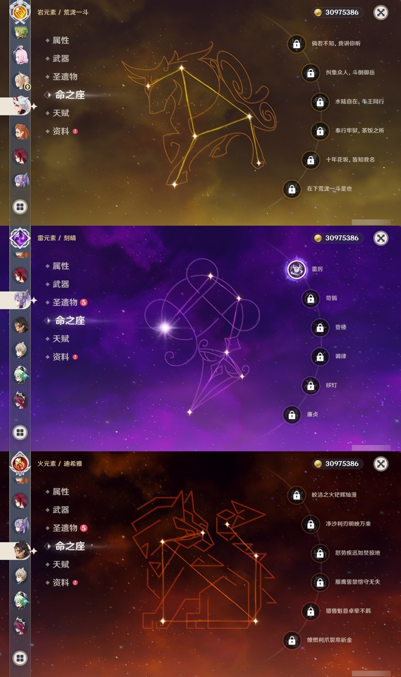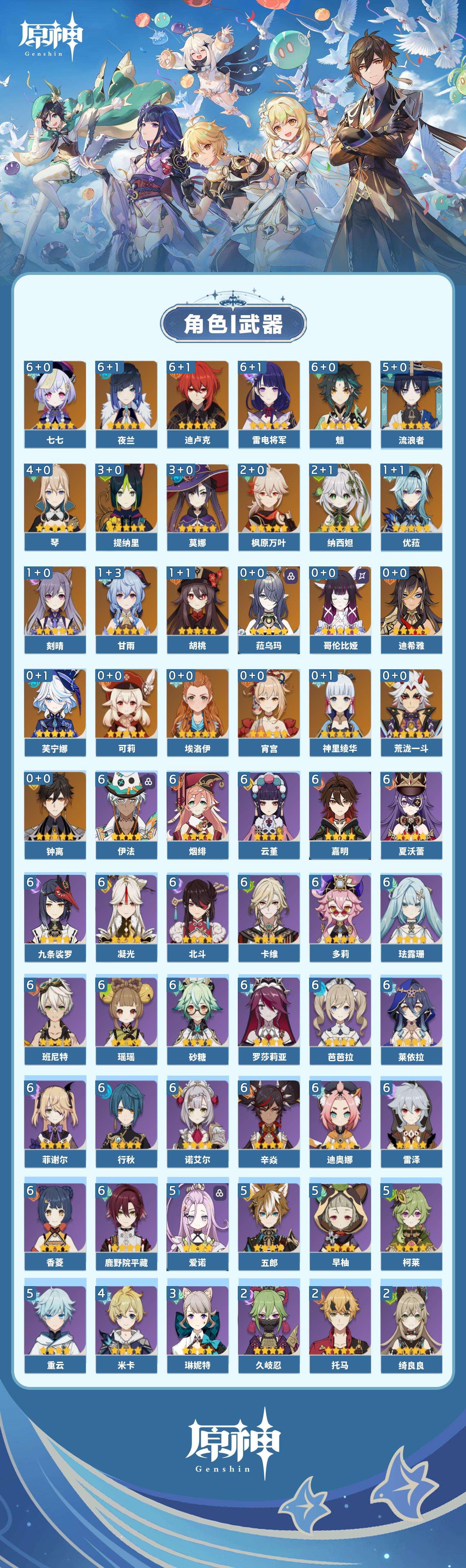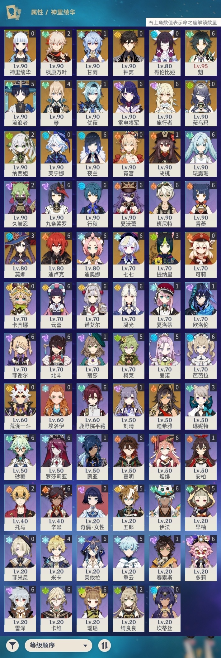 【原神】满命,冒险等级:60,五星数量:46,五星角色:迪卢克 6命魈 6命雷电将军 6命七七 6命夜兰 6命流浪者 5命琴 4命莫娜 3命提纳里 3命枫原万叶 2命纳西妲 2命甘雨 1命胡桃 1命刻晴 1命优菈 1命神里绫华宵宫迪希雅钟离荒泷一斗芙宁娜菈乌玛哥伦比娅可莉__五星武器:阿莫斯之弓 3精静水流涌之辉血染荒城裁叶萃光风鹰剑护摩之杖狼的末路松籁响起之时天空之傲天空之脊天空之卷天空之刃无工之剑雾切之回光薙草之稻光终末嗟叹之诗息灾神乐之真意若水千夜浮梦__四星角色:班尼特 6命行秋 6命九条裟罗 6命香菱 6命鹿野院平藏 6命珐露珊 6命凝光 6命迪奥娜 6命砂糖 6命瑶瑶 6命莱依拉 6命多莉 6命卡维 6命芭芭拉 6命云堇 6命烟绯 6命辛焱 6命诺艾尔 6命罗莎莉亚 6命雷泽 6命菲谢尔 6命北斗 6命夏沃蕾 6命嘉明 6命伊法 6命柯莱 5命早柚 5命五郎 5命重云 5命爱诺 5命米卡 4命琳妮特 3命久岐忍 2命绮良良 2命托马 2命欧洛伦 1命夏洛蒂 1命赛索斯 1命埃洛伊奇偶·女性卡齐娜坎蒂丝菲米尼